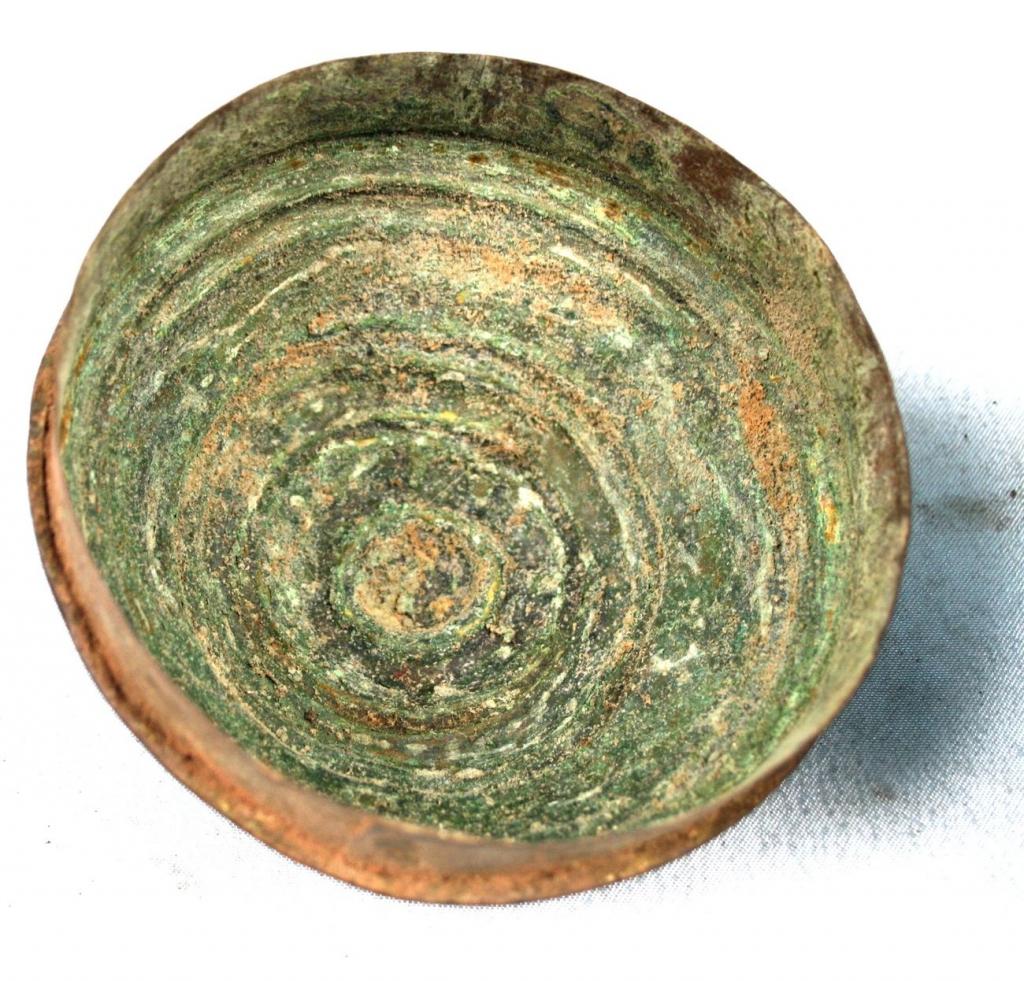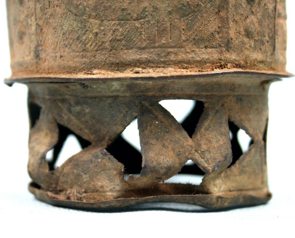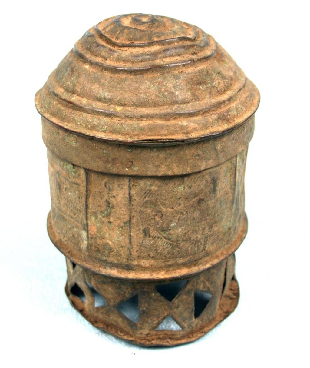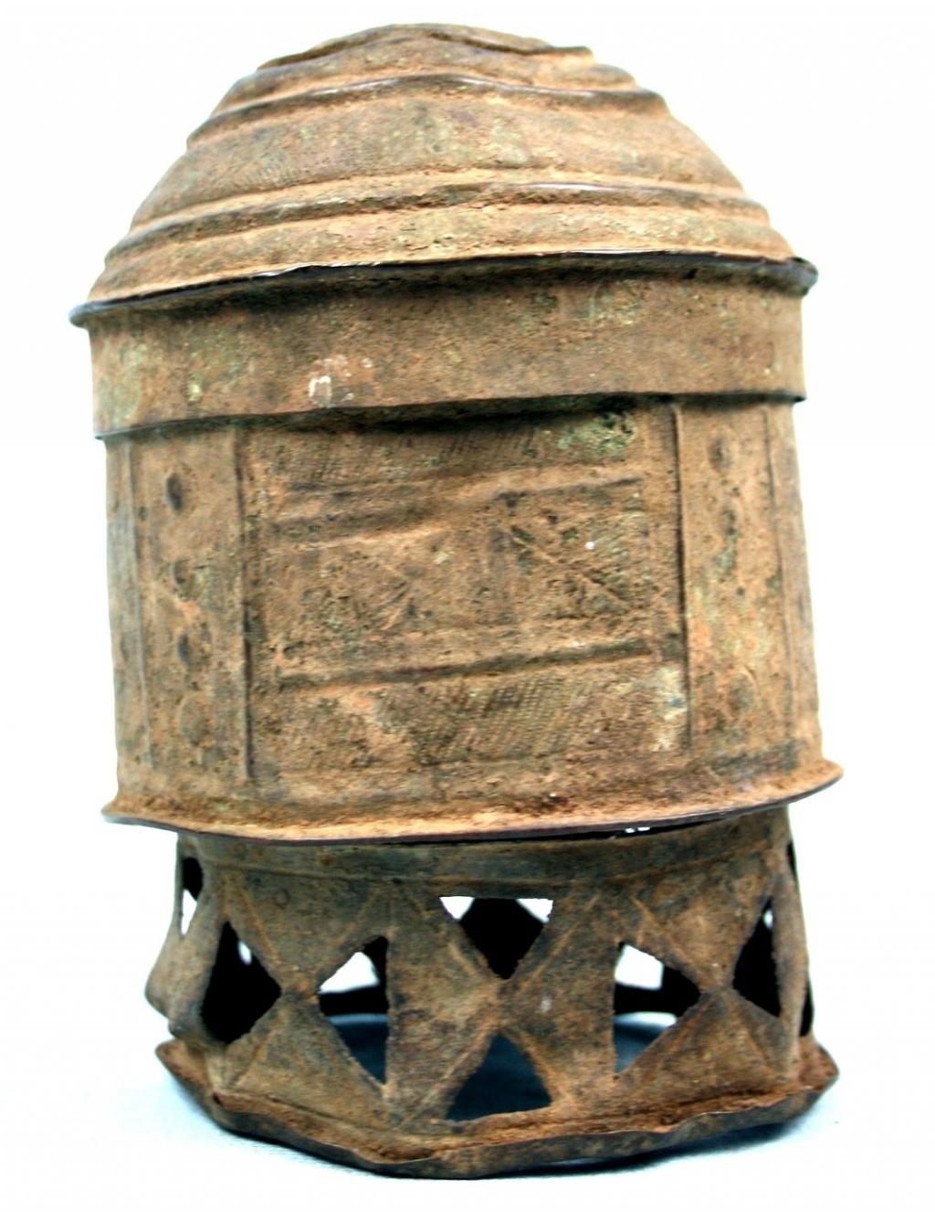 Este forowa consta de una base con dibujos geométricos y aberturas en forma de triángulo y del contenerdor, con figuras repujadas de gallinas y ventanas y dibujos geométricos. En la tapa de forma semiesférica hay varios niveles delimitados por circunferencias. Pátina muy antigua.