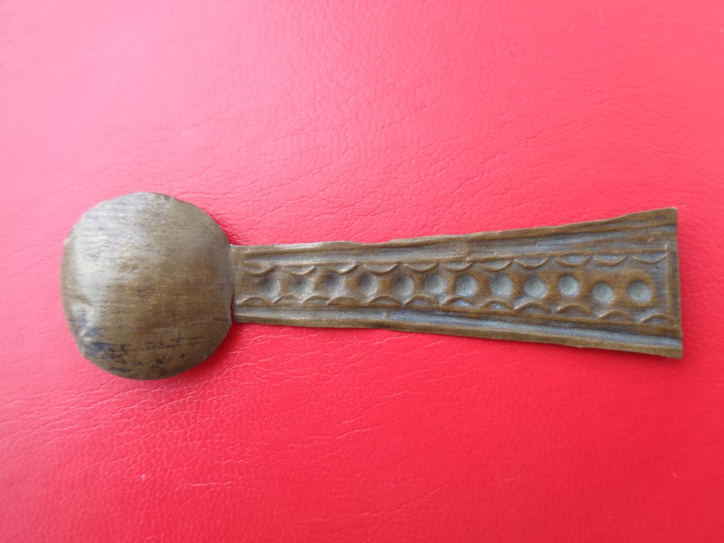 Estas cucharas se utilizaban para depositar el oro en los platillos de la balanza. El conjunto de elementos de pesar el oro se guardaba en el dja o tela sagrada que contenía un pergamino consagrado a los antepasados. El mango está decorado con un repujado de puntos en el centro enmarcados por pequeñas líneas ovaladas y dos grandes líneas una a cada lado.