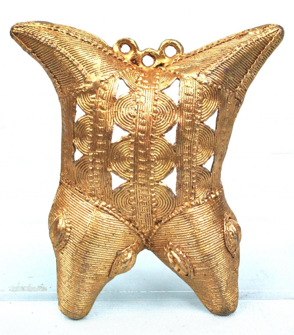 Colgante que ha sido utilizado por un notable en las ceremonias. El doble cocodrilo es una figura reiterativa en las joyas y en las pesas de pesar el oro baulé. Los cocodrilos están cruzados. Simbolizan el dualismo macho y hembra. El cocodrilo es uno de los animales primordiales de la creación y figura en las cosmogonías de numerosos pueblos africanos. El cocodrilo es el vínculo de la unión entre el agua y la tierra y el dispesador del agua a la tierra. Este colgante está elaborado con una aleación de bronce dorado y adornado con la filigrana típica de los Baulé y de los Akan.