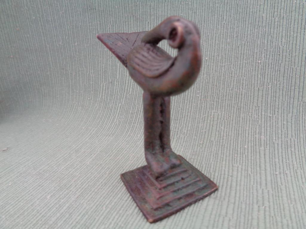 Antigua pesa en forma de pájaro, posiblemente dell siglo XIX. Esta pájaro con la cabeza vuelta hacia atrás recibe el nombre de Sankofa y simboliza al rey que sabe todo lo que ocurre a sus espaldas, como lo dice el proverbio, y también al sabio que sabe tomar en cuenta el tiempo pasado.