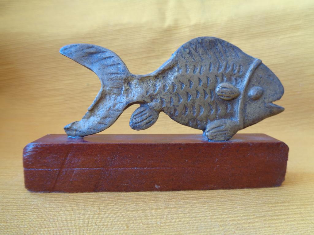 Pesa en forma de pez. Los peces ya sean marinos, de río o de laguna están muy presentes en la alimentación de muchos pueblos del grupo Akan, por lo que no es de extrañar que haya bastantes pesas de pesar el ponvo de oro con esta forma.