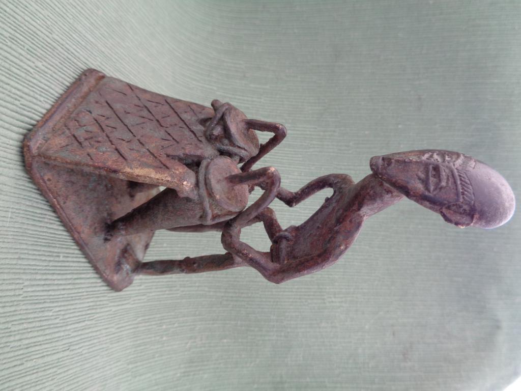 Este ambor doble que está tocando ese amborilero es el tambor conocido en el grupo Akan como "ntunpam" o tambor hablador, es el emcargado de transmitir lps mensajes. Pieza rara. Pátina antigua.
