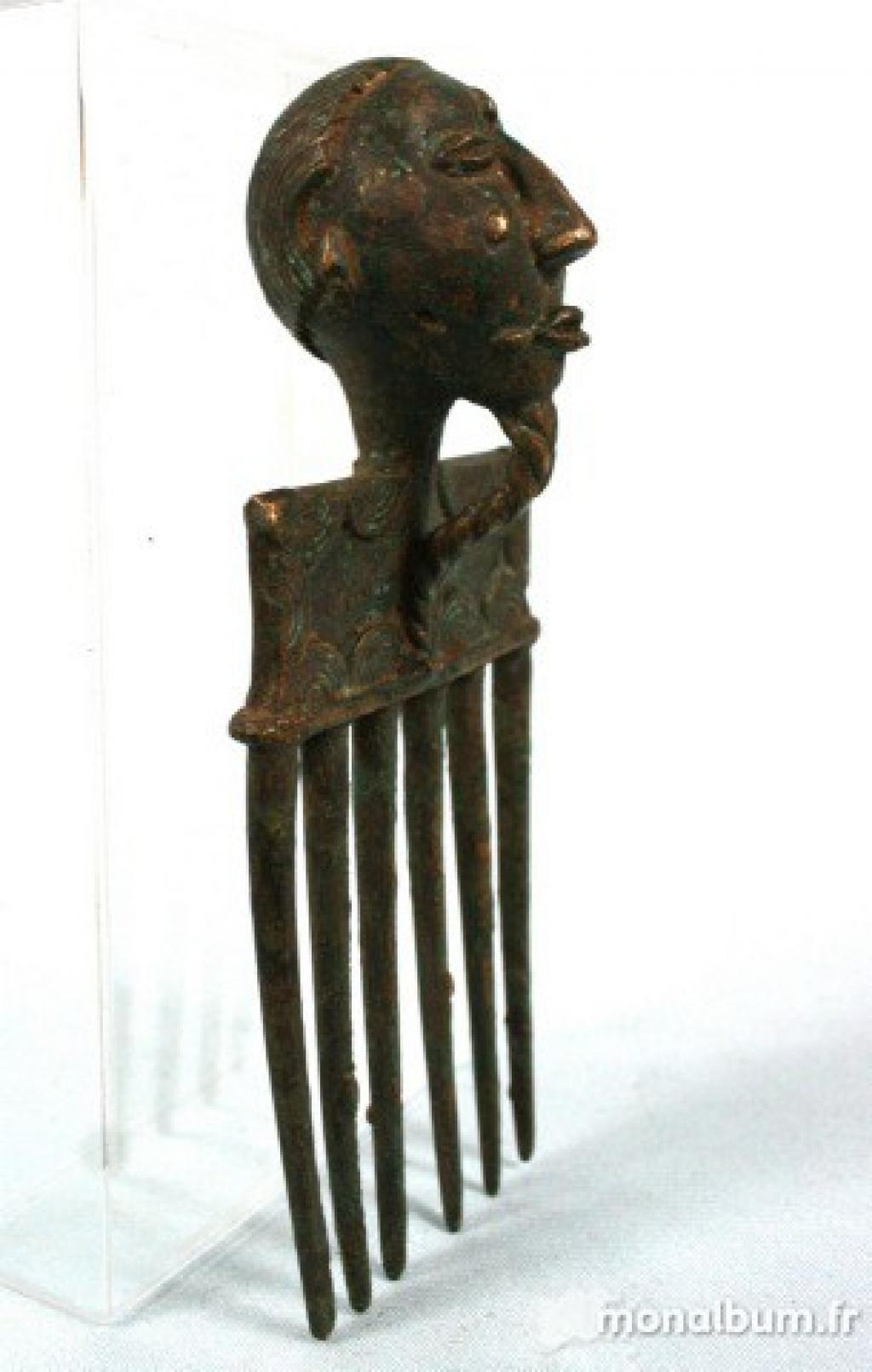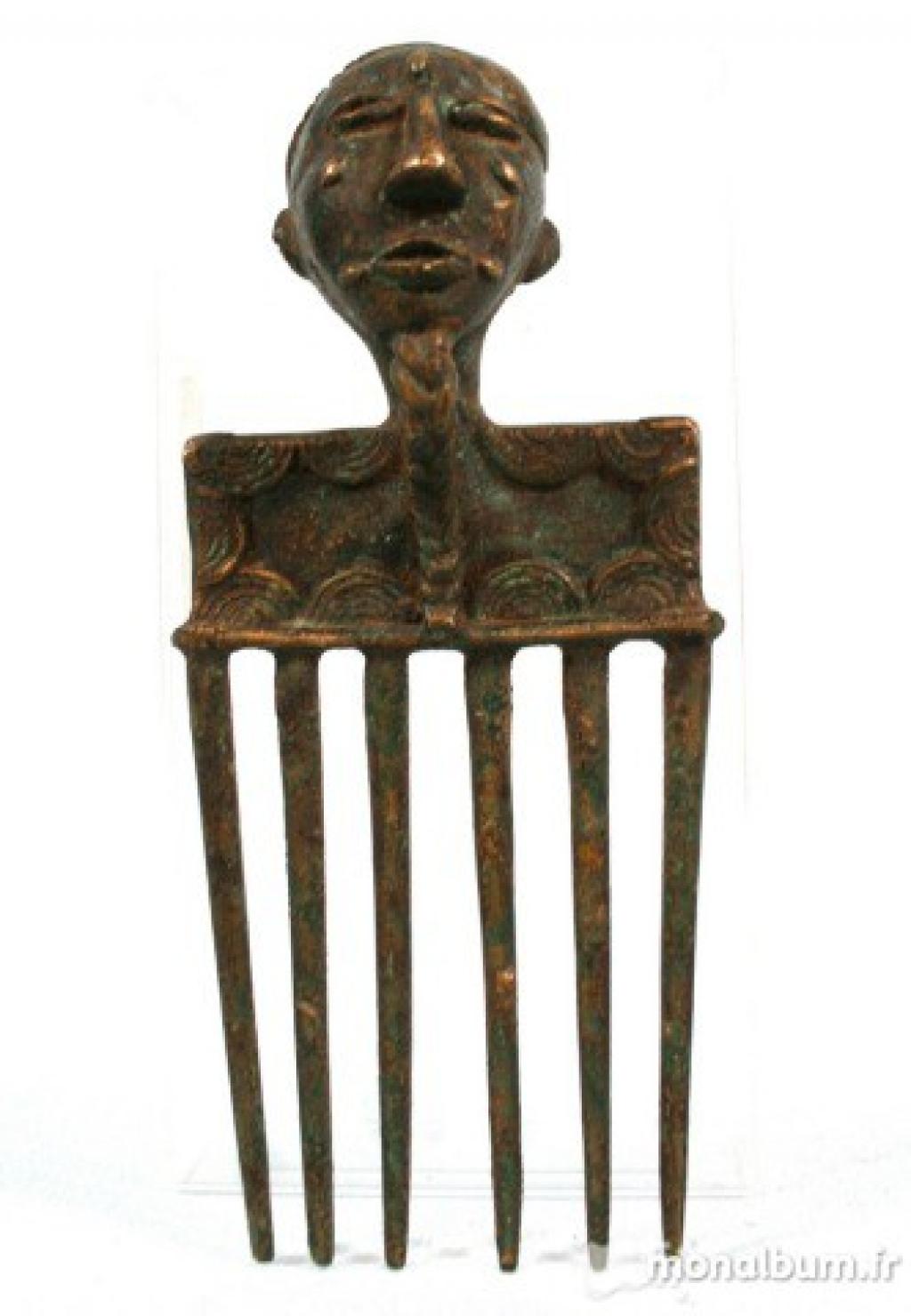 Peine akan rematado con una cabeza masculina, con fina perilla trenzada. Cuerpo del peine rectangular, decorado en sus bordes con semicírculos concéntricos superpuestos. Pátina oscura.