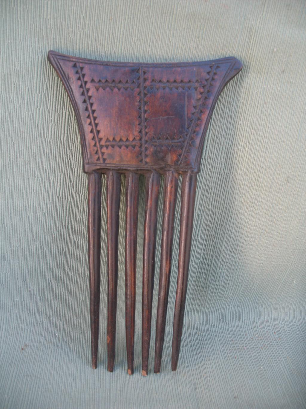 Peine de seis púas finamente elaborado con grabaciones geométricas que responde perfectamente a los cánones estéticos de la etnia. Pátia marrón.