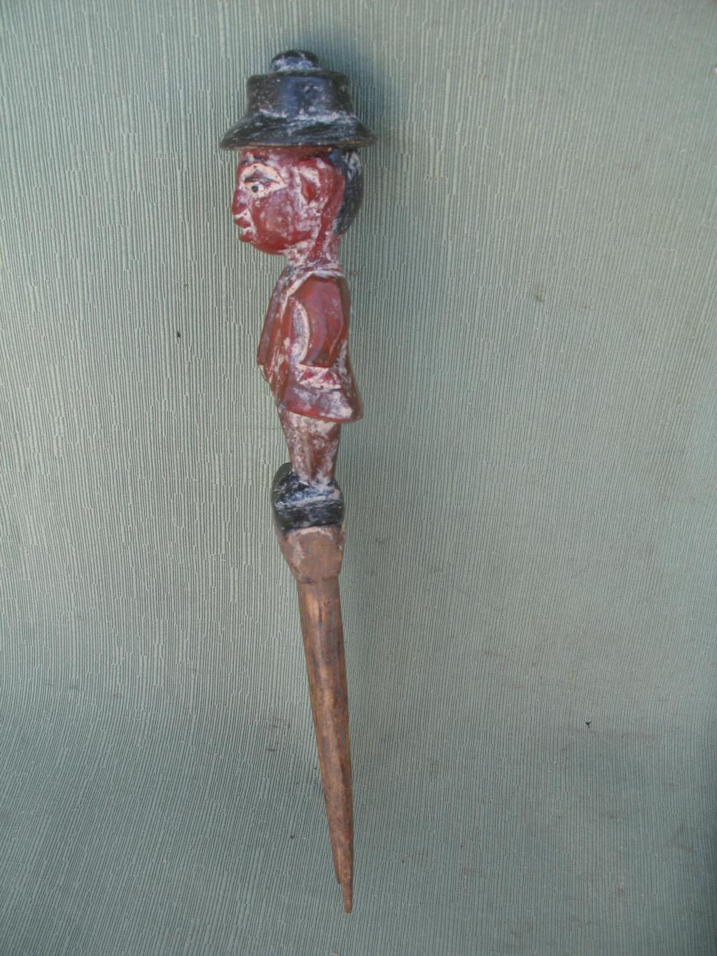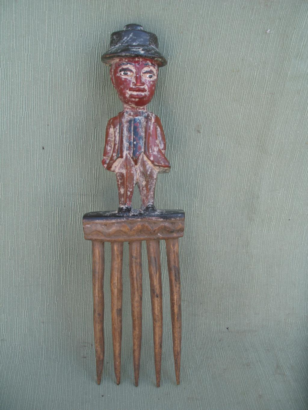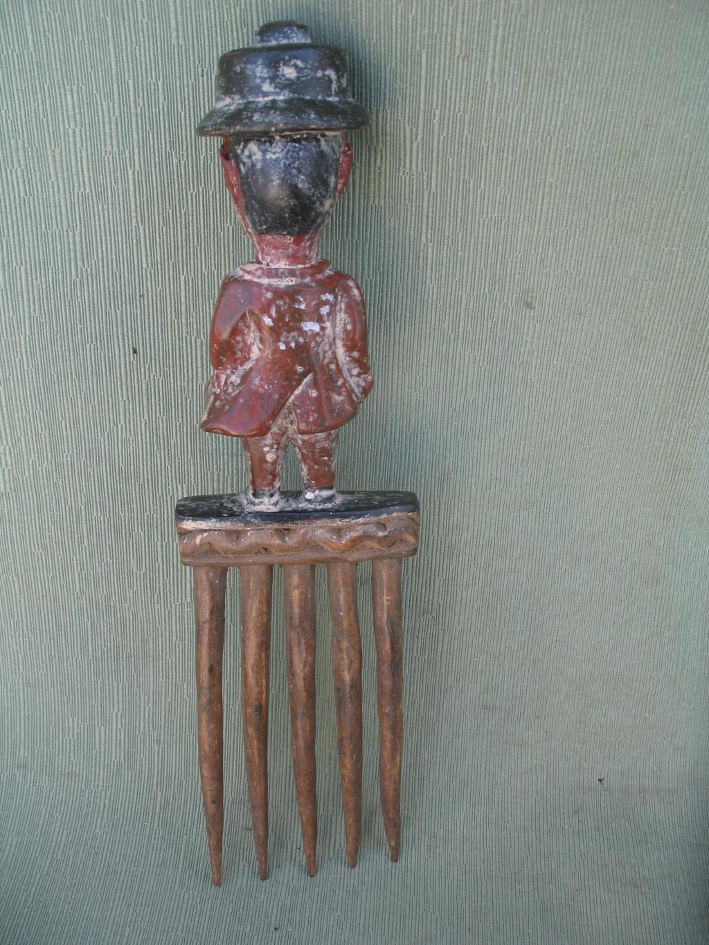 Simpático peine que representa a un colono vestido con traje de chaqueta, sombreroy corbata, cosa extraordinariamente rara en Costa de Marfil, dado el calor. El protocolo exige para ir a ver a un ministro o un personaje importante el uso de la corbata que puede ir perfectamente con una camisa de manga corta. La corbata en África, viste No hace falta traje. Las estatuillas de colonos tienen siempre un matiz humorístico o satírico, y casi siempre es personaje es de color rojo, como el africano ve a los europeos.