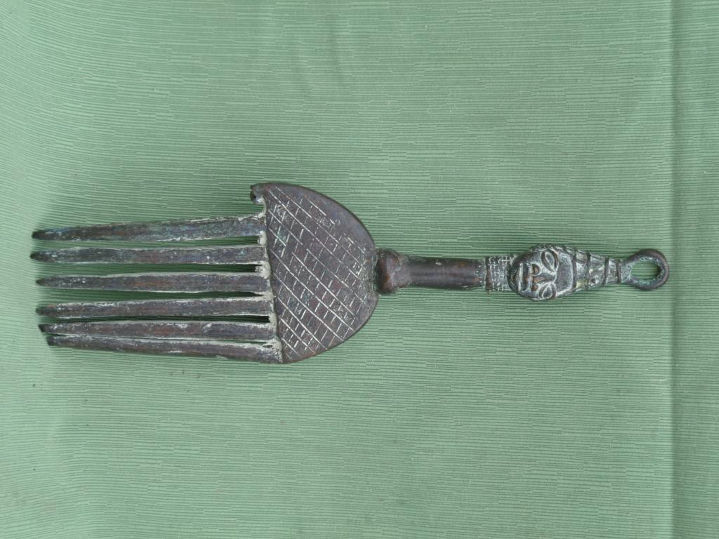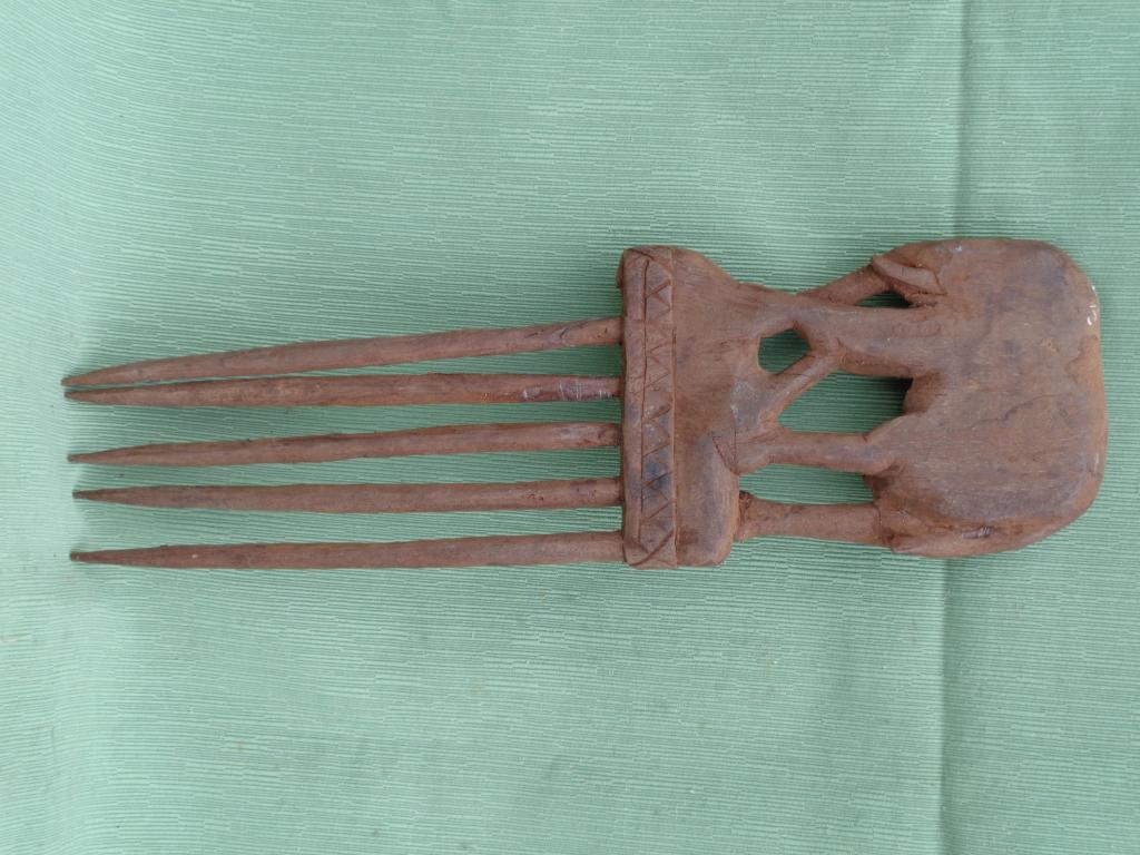 Peine de seis púas tilizado por las mujeres baulé para sujear su cabello en las ceremonias religiosas y festivas. Rematado con una figura del elefante, símbolo de Costa de Marfil. Le falta una púa. Pátina roja, color de la madera,probablemente caoba.