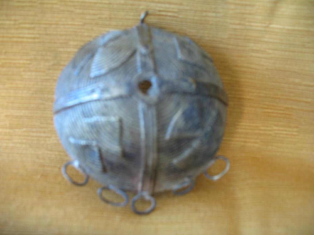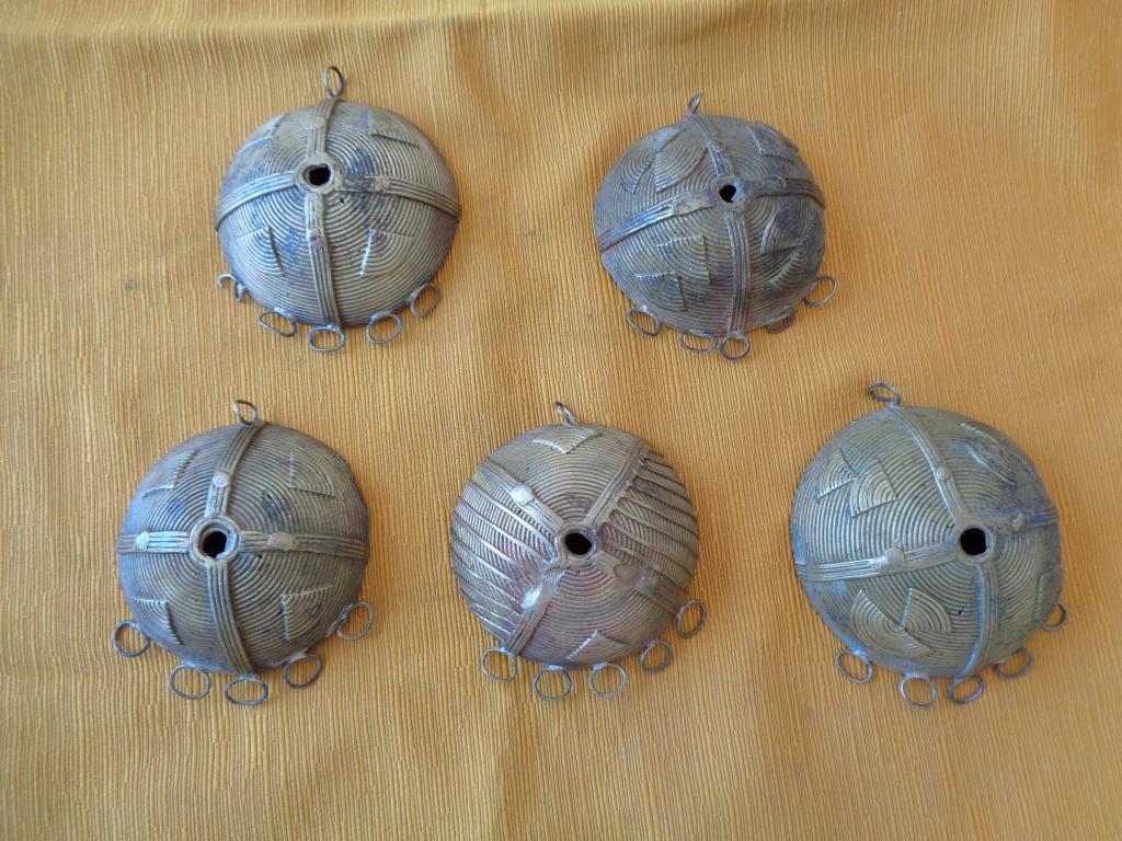 Pieza de adorno, en forma de semiesfera, con dibujos en relieve, que se ponen las mujeres baulé en el pecho para engalanar sus ropas de gala o de ceremonia. Piezas muy raras de encontrar en el mercado del arte africano.