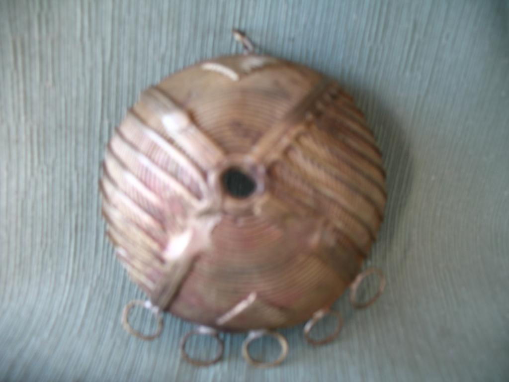 Pieza de adorno, en forma de semiesfera, con dibujos en relieve, que se ponen las mujeres baulé en el pecho para engalanar sus ropas de gala o de ceremonia. Piezas muy raras de encontrar en el mercado del arte africano.