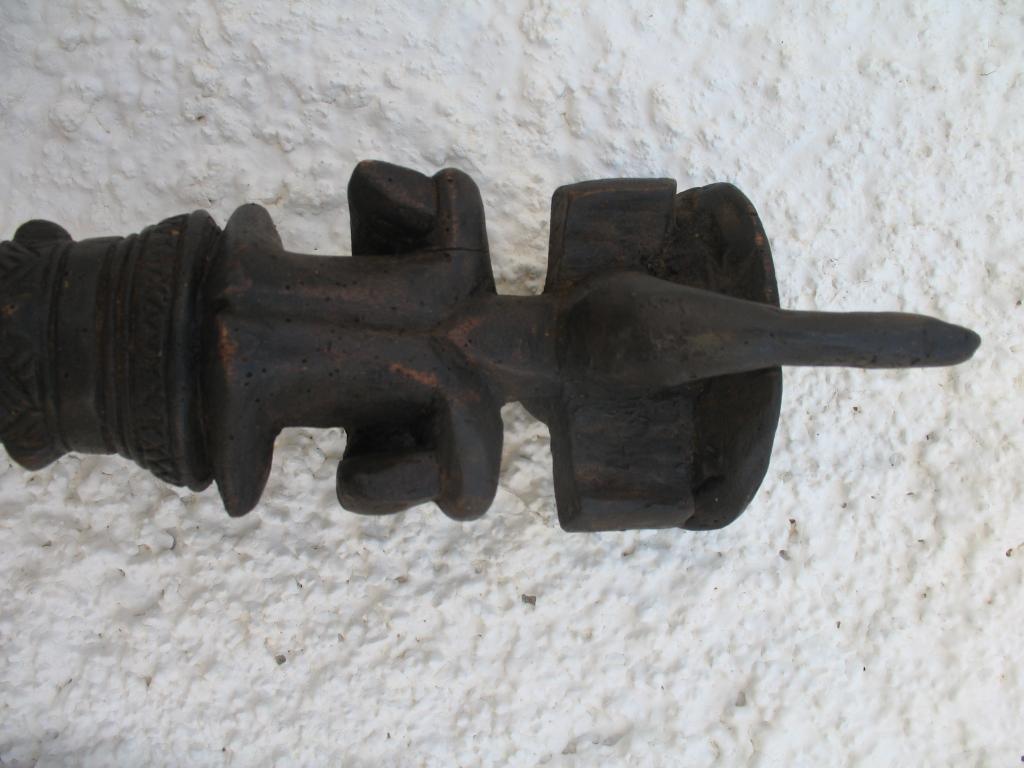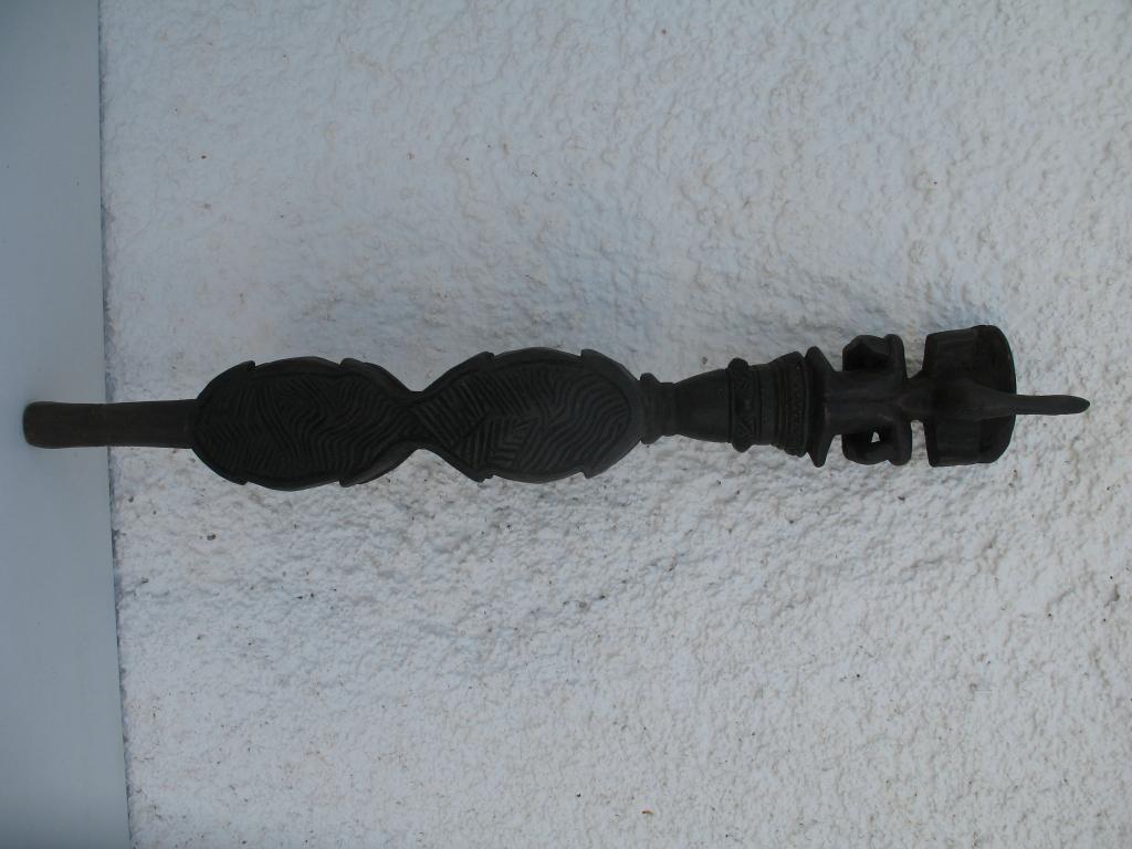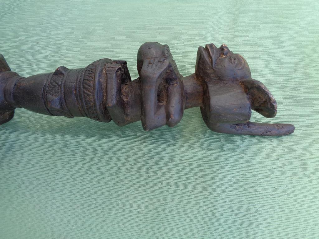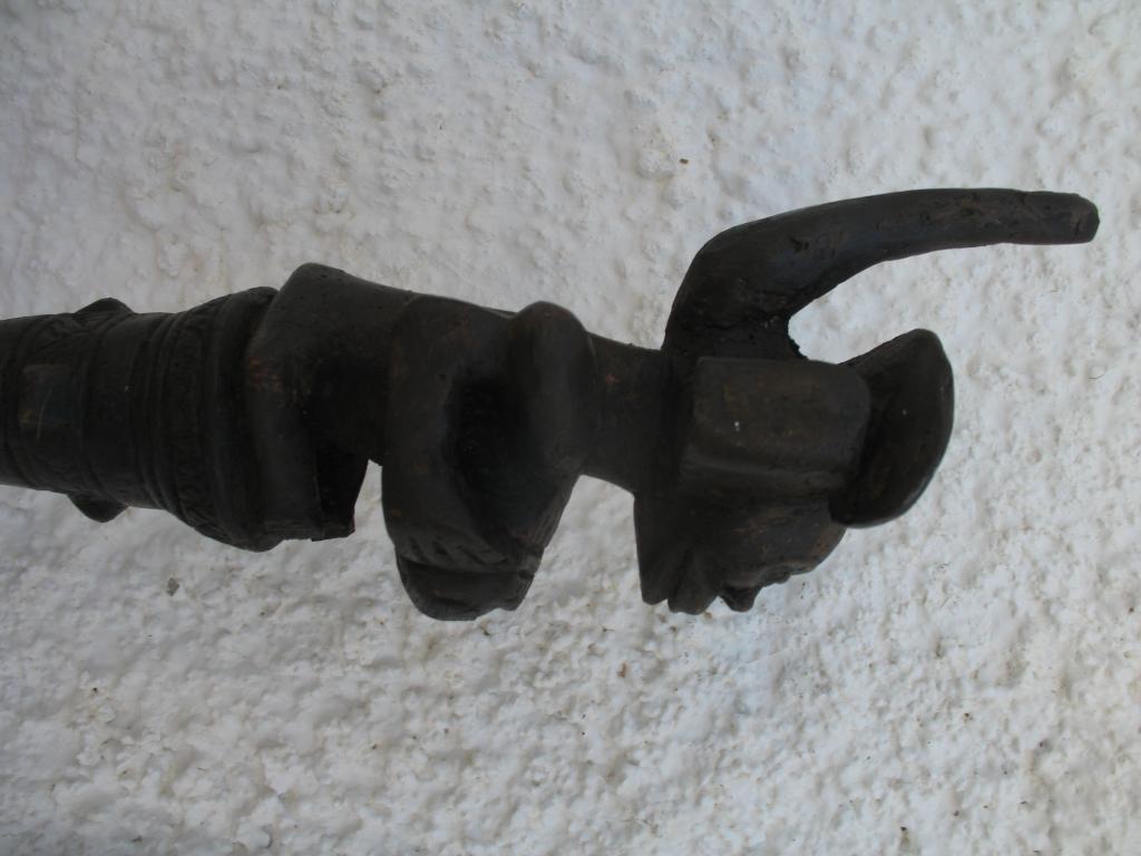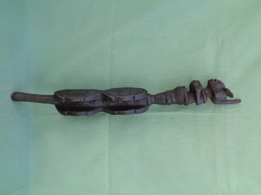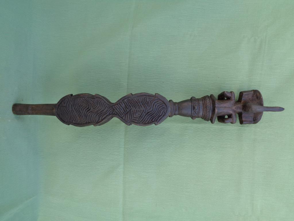 A partir del neolítico el cetro, especie de pequeño bastón de mando, ha sido el símbolo de poder de soberanos y dioses en todas las civilizaciones. También en distintas etnias africanas el cetro ha sido un símbolo de poder del soberano. El cetro tschokwé es conocido desde el siglo XIX, principalmente los llamados de la escuela de Moxico, capial del Alto Zambeze en Namibia, en donde se esculpieron magníficas tallas tschokwé. Este cetro representa al héroe civilizador Chibinda Ilunga, con su famoso peinado mutwe wa kayanda. Estos cetros reciben el nombre de cefalomorfos por representar una gran cabeza, con su peinado de jefe y su expresión serena, con adornos geométricos típicos de la etnia. Además de su mango inferior lleva una especie de gran asa para facilitar el agarre. Estas insignias de poder, símbolo de los soberanos, eran también utilizadas por los jefes en las ceremonias, en los actos oficiales, en las grandes solemnidades y en las sesiones de administración de la justicia. Estos bastones de mando eran muy apreciados y formaban parte del patrimonio familiar, se transmitían como eran de generación en generación, podían ofrecerse como obsequio a otros soberanos o jefes y eran un codiciado trofeo en caso de guerra. Pátina negra. Ha sufrido restauración en la cabeza.