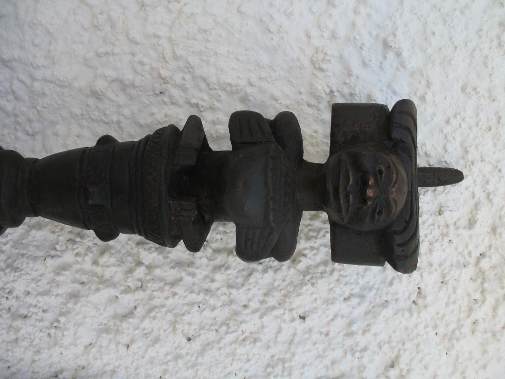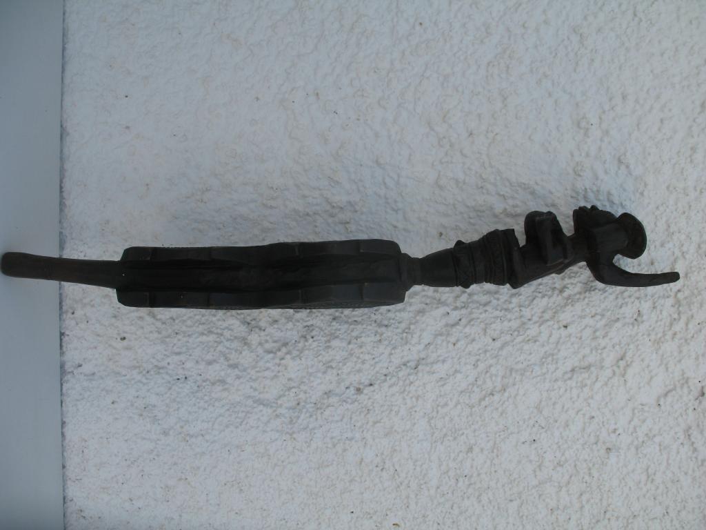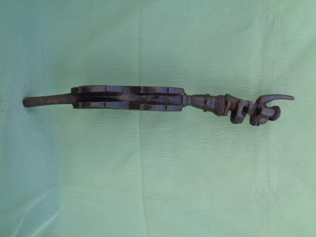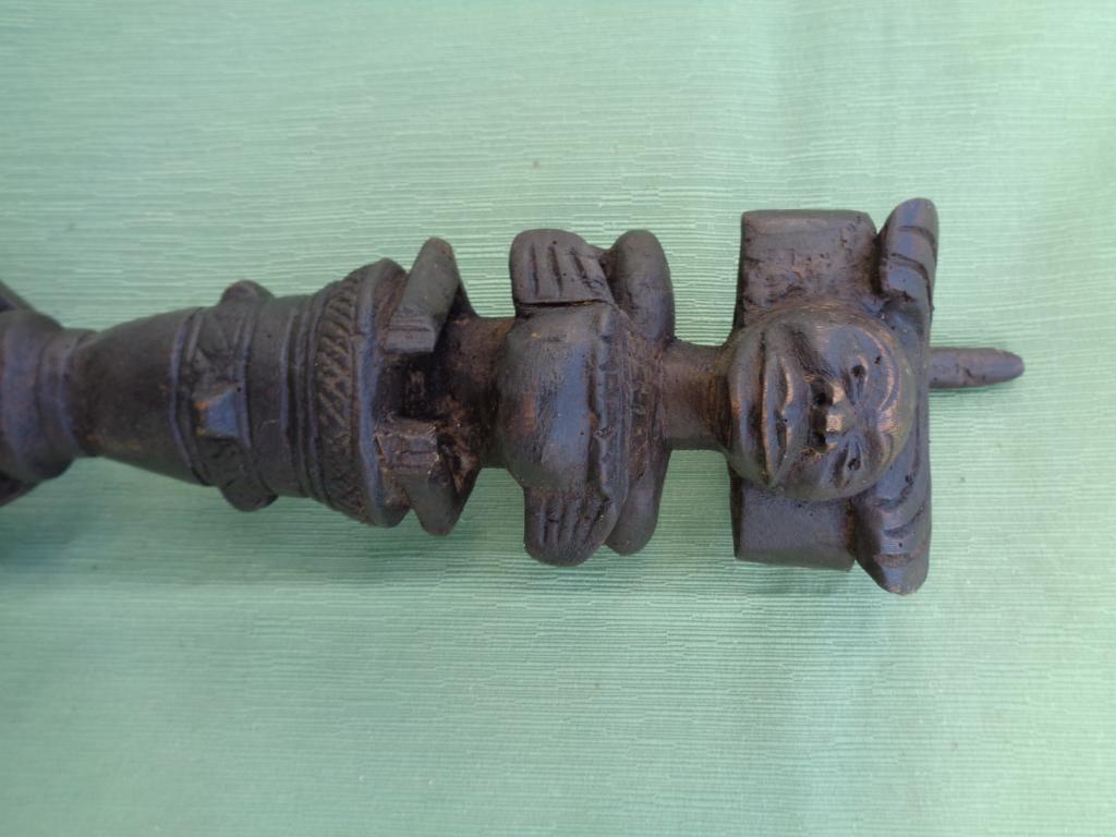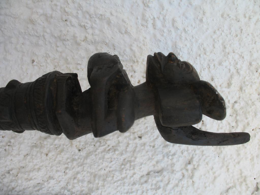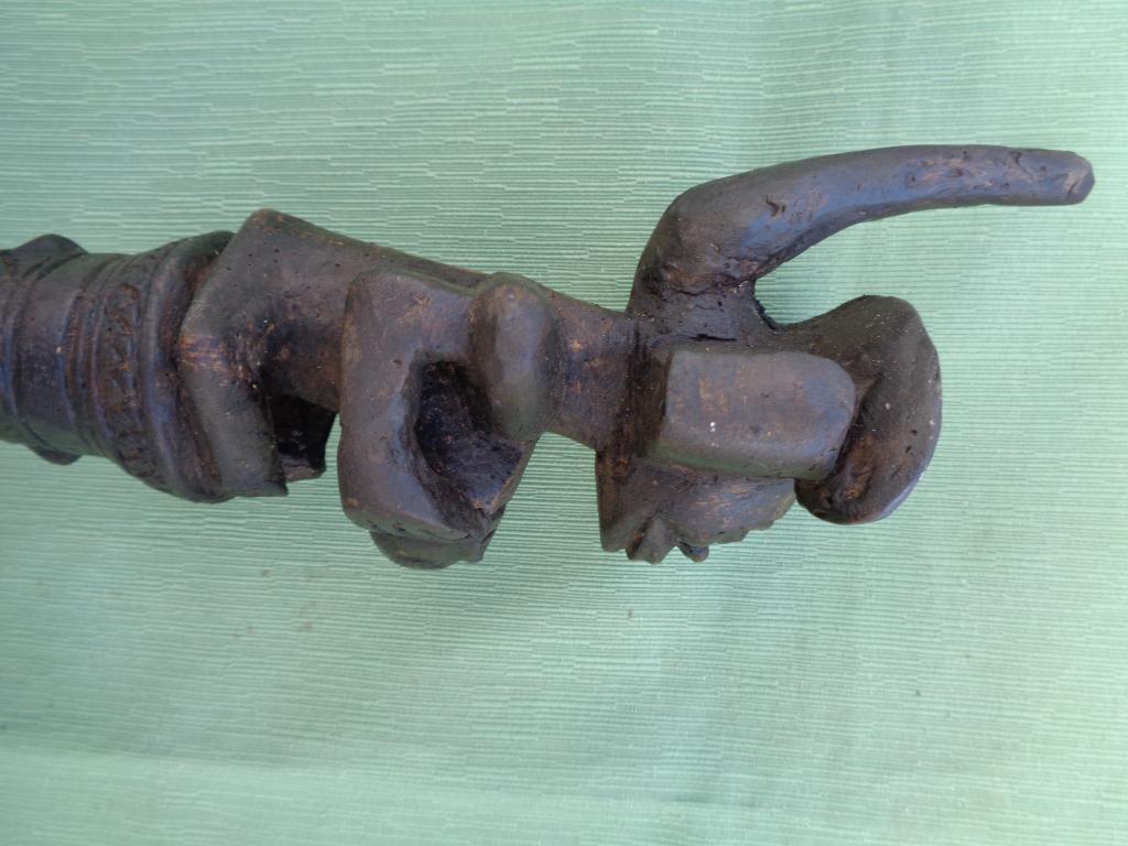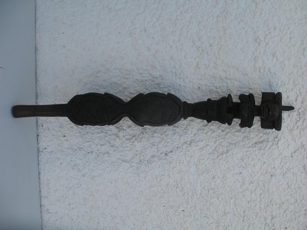 A partir del neolítico el cetro, especie de pequeño bastón de mando, ha sido el símbolo de poder de soberanos y dioses en todas las civilizaciones. También en distintas etnias africanas el cetro ha sido un símbolo de poder del soberano. El cetro tschokwé es conocido desde el siglo XIX, principalmente los llamados de la escuela de Moxico, capial del Alto Zambeze en Namibia, en donde se esculpieron magníficas tallas tschokwé. Este cetro representa al héroe civilizador Chibinda Ilunga, con su famoso peinado mutwe wa kayanda. Estos cetros reciben el nombre de cefalomorfos por representar una gran cabeza, con su peinado de jefe y su expresión serena, con adornos geométricos típicos de la etnia. Además de su mango inferior lleva una especie de gran asa para facilitar el agarre. Estas insignias de poder, símbolo de los soberanos, eran también utilizadas por los jefes en las ceremonias, en los actos oficiales, en las grandes solemnidades y en las sesiones de administración de la justicia. Estos bastones de mando eran muy apreciados y formaban parte del patrimonio familiar, se transmitían como eran de generación en generación, podían ofrecerse como obsequio a otros soberanos o jefes y eran un codiciado trofeo en caso de guerra. Pátina negra. Ha sufrido restauración en la cabeza.