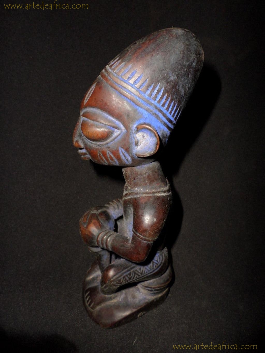 Ibedji sentado apoyando sus manos sobre una pieza que podría tratarse de una ofrenda. restos de índigo.