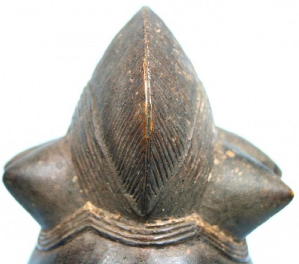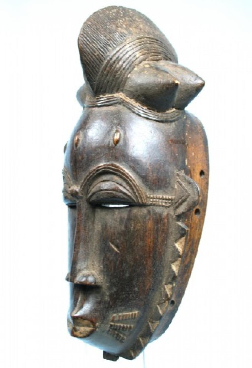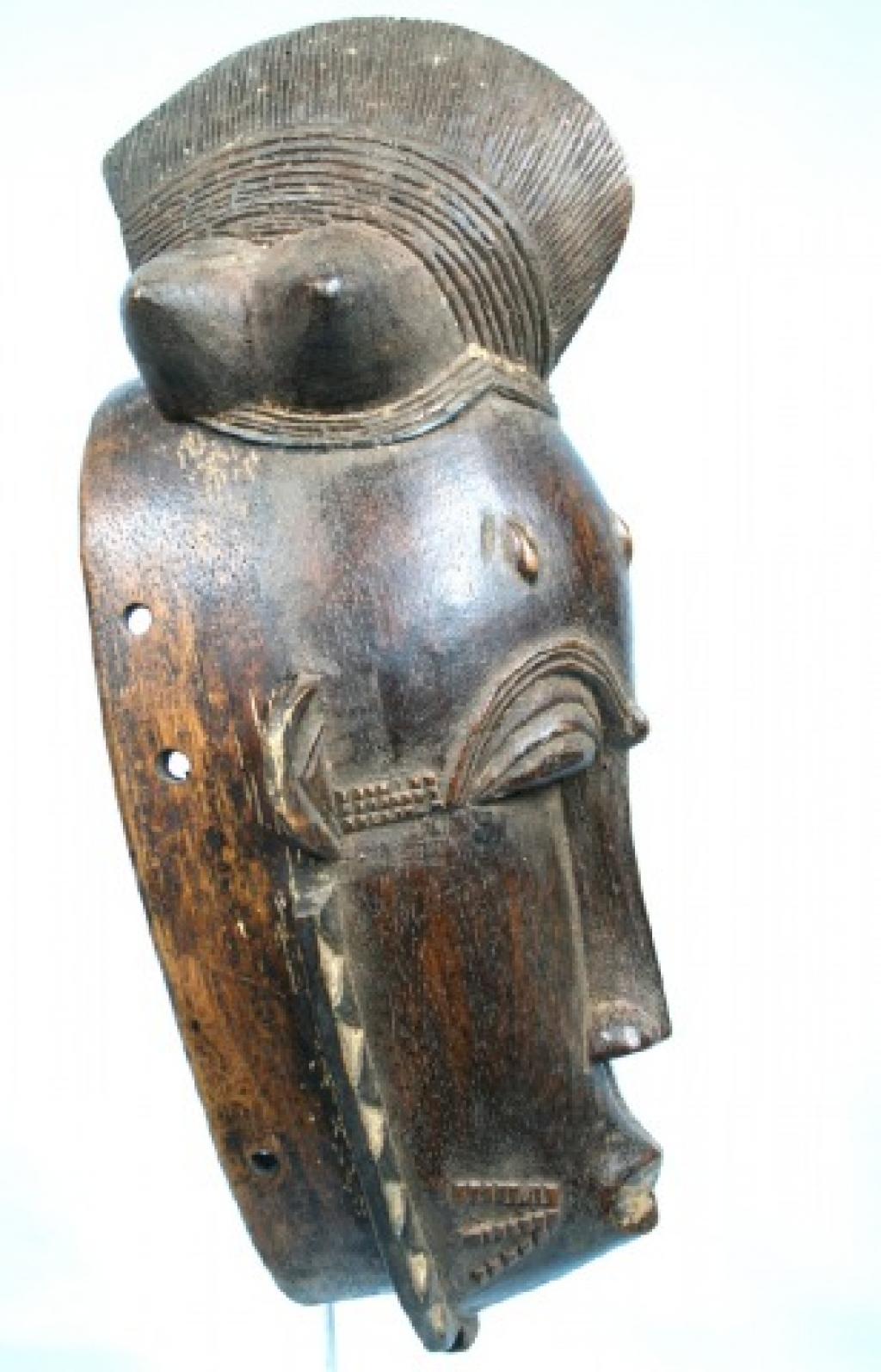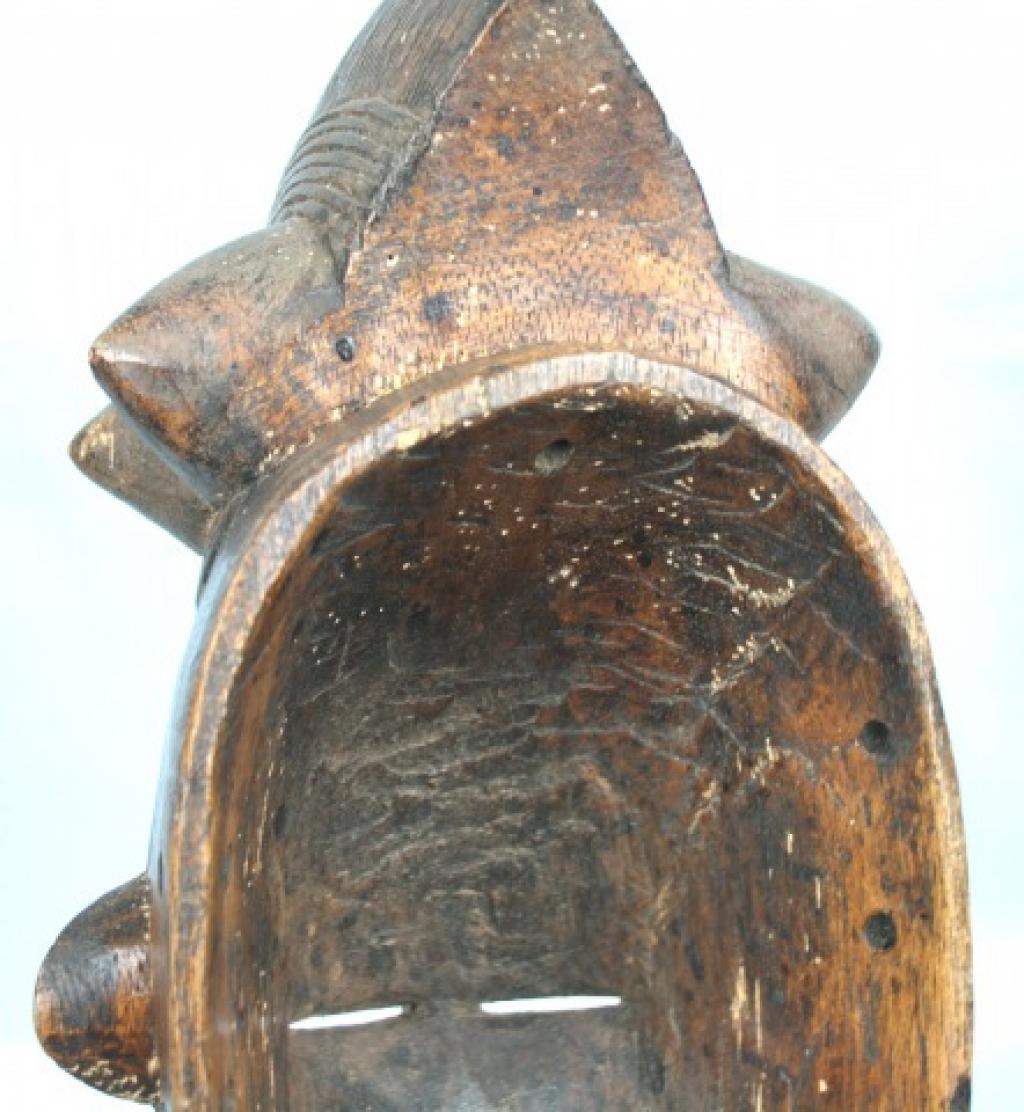 La orla de tnriángulos blancos y negros que rodea el rostro es de influencia yahuré. Un gran blucle central rodeado de cuatro bucles laterales cónicos. Rostro alargado y ojos rasgados bajo una superposición de finos arcos ciliares. Escarificaciones en relive a ambos lados de una boca ovalada y pintada de blanco. Pequeñas rejas despegadas. Pátina muy oscura.