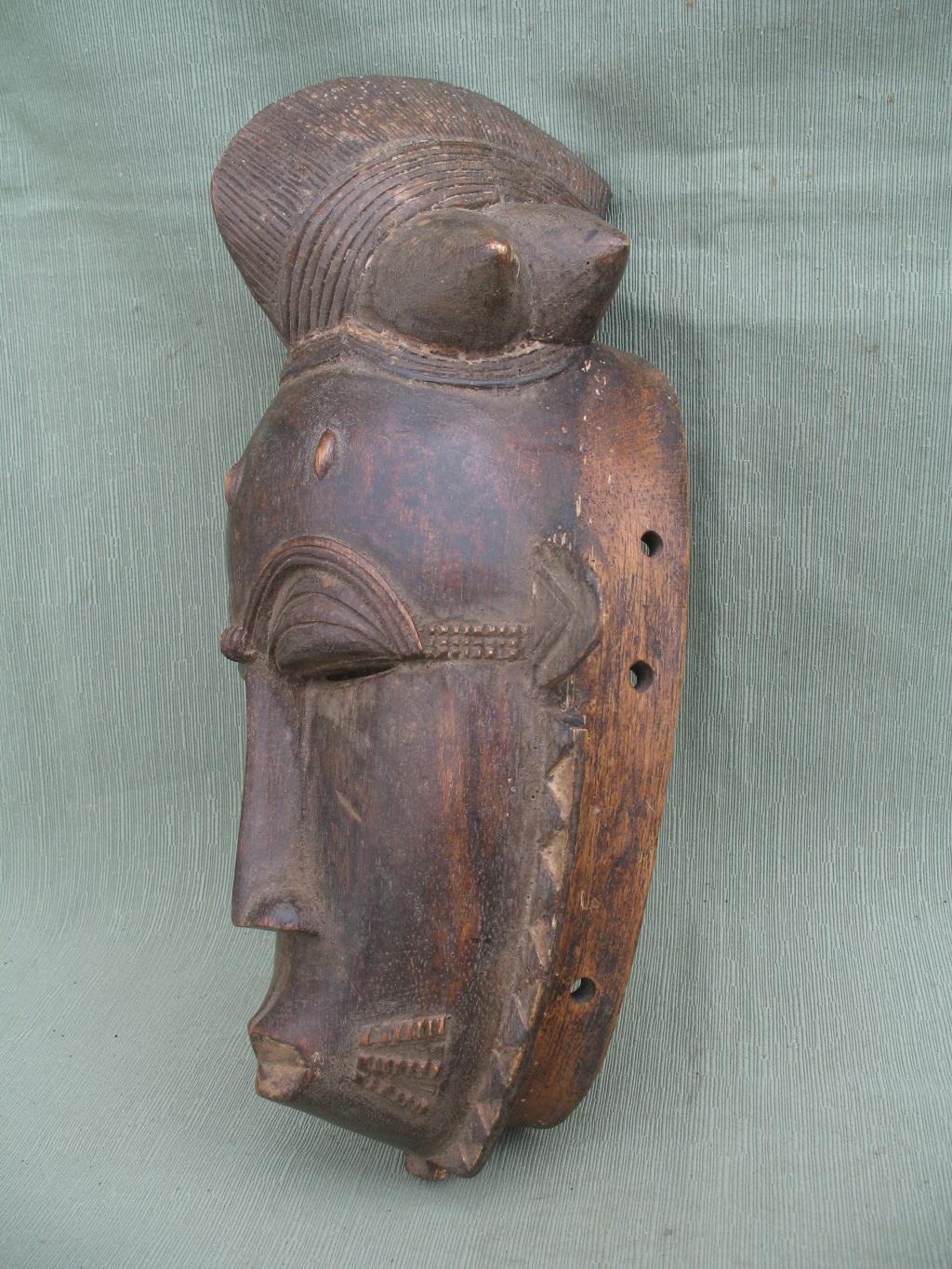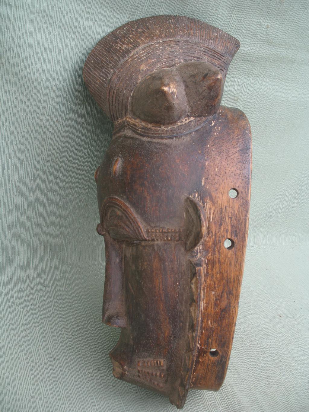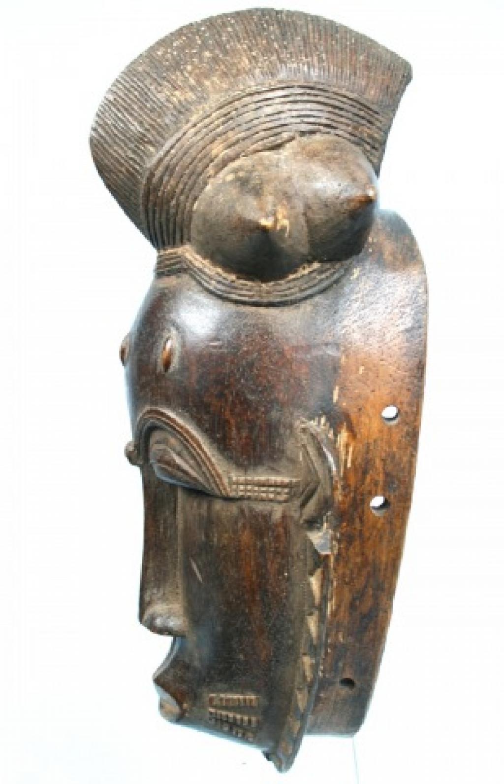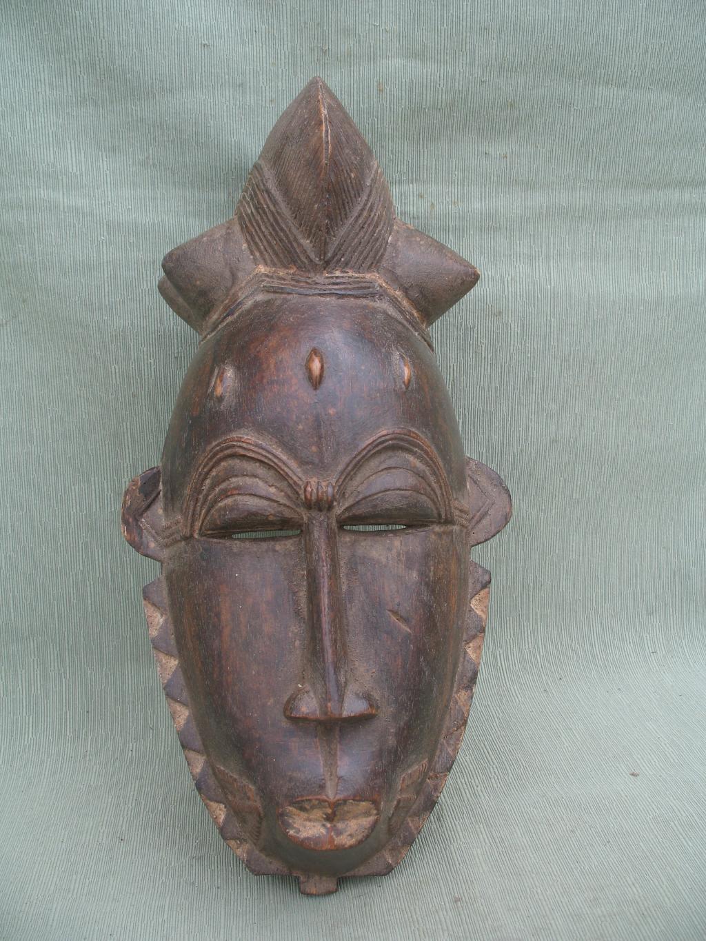 La orla de tnriángulos blancos y negros que rodea el rostro es de influencia yahuré. Un gran blucle central rodeado de cuatro bucles laterales cónicos. Rostro alargado y ojos rasgados bajo una superposición de finos arcos ciliares. Escarificaciones en relive a ambos lados de una boca ovalada y pintada de blanco. Pequeñas rejas despegadas. Pátina muy oscura.