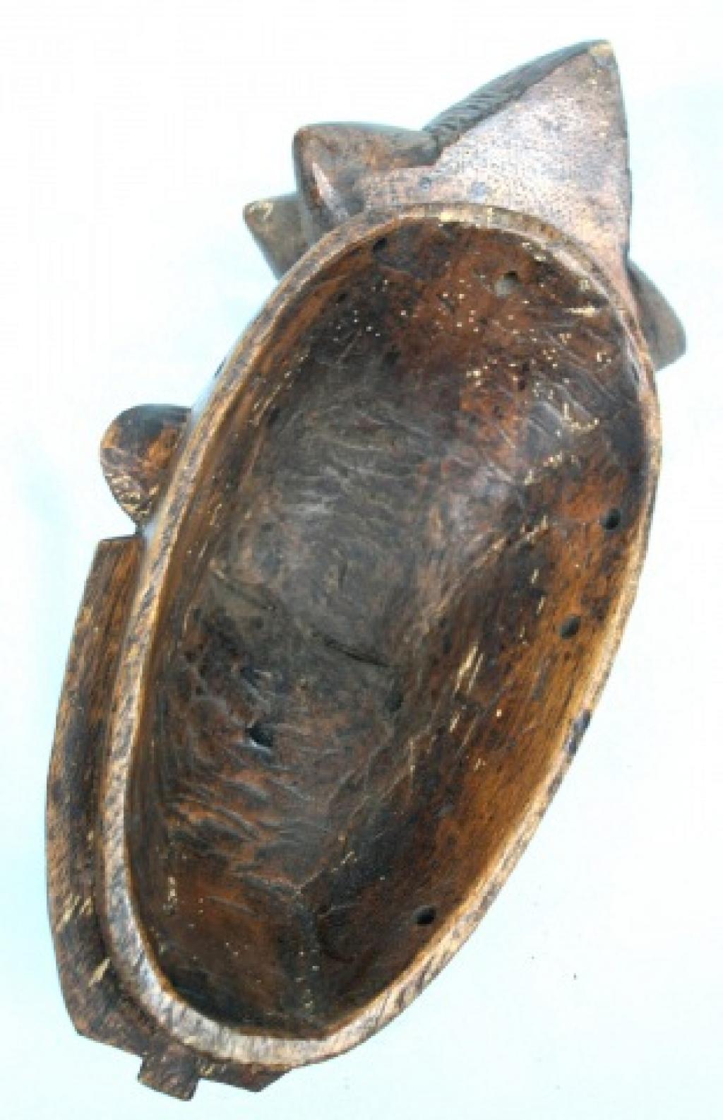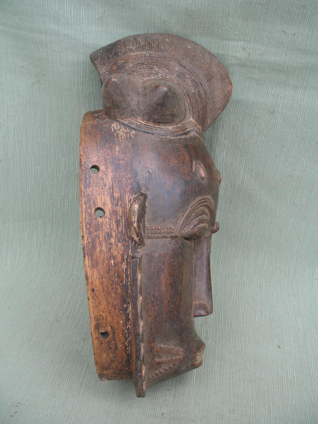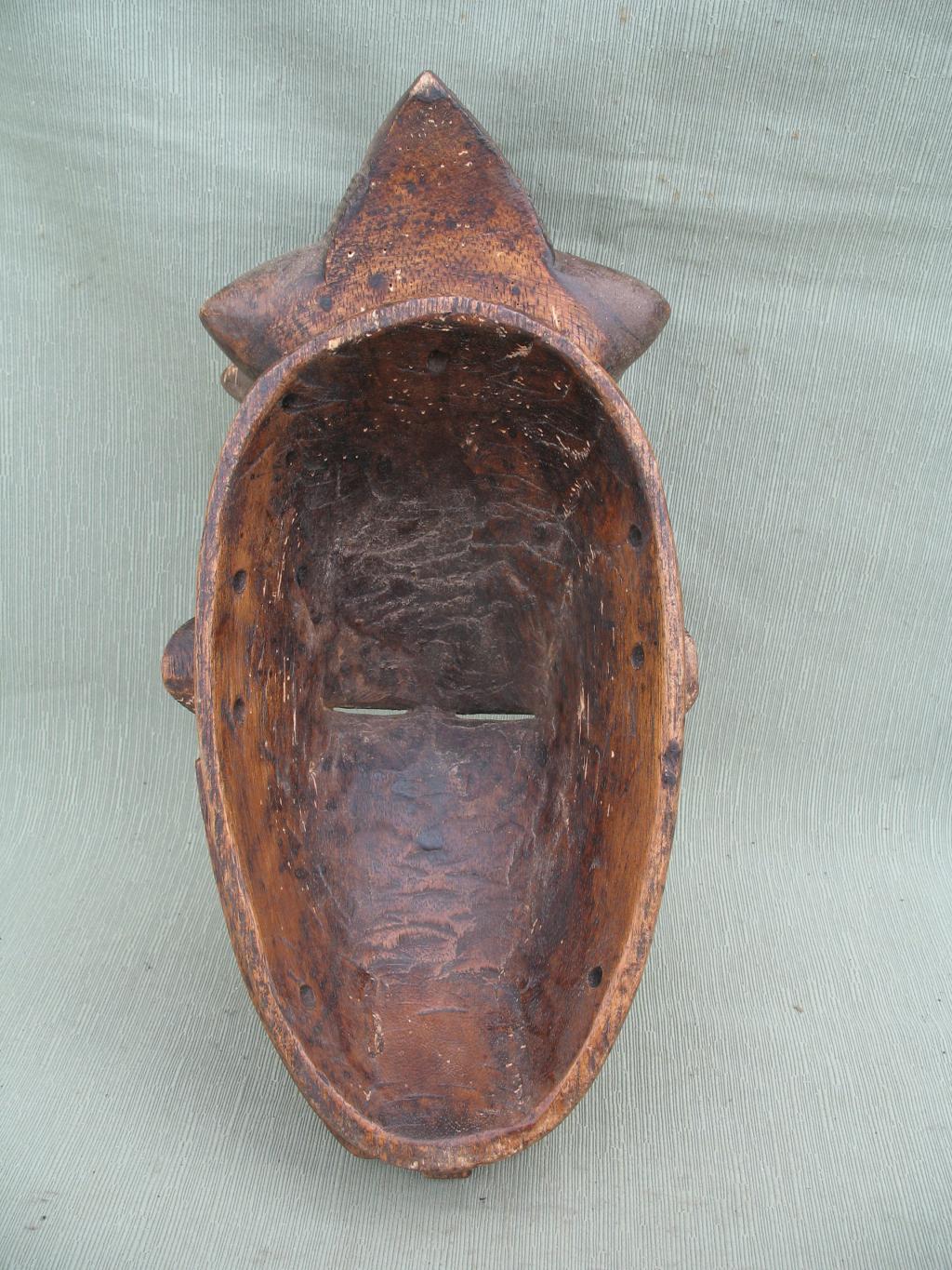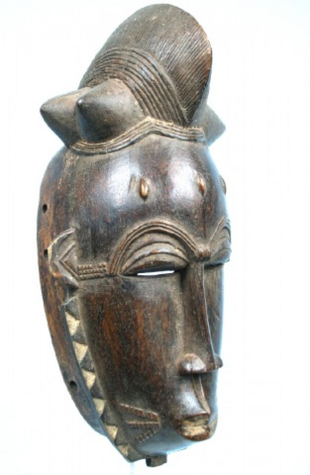 La orla de tnriángulos blancos y negros que rodea el rostro es de influencia yahuré. Un gran blucle central rodeado de cuatro bucles laterales cónicos. Rostro alargado y ojos rasgados bajo una superposición de finos arcos ciliares. Escarificaciones en relive a ambos lados de una boca ovalada y pintada de blanco. Pequeñas rejas despegadas. Pátina muy oscura.