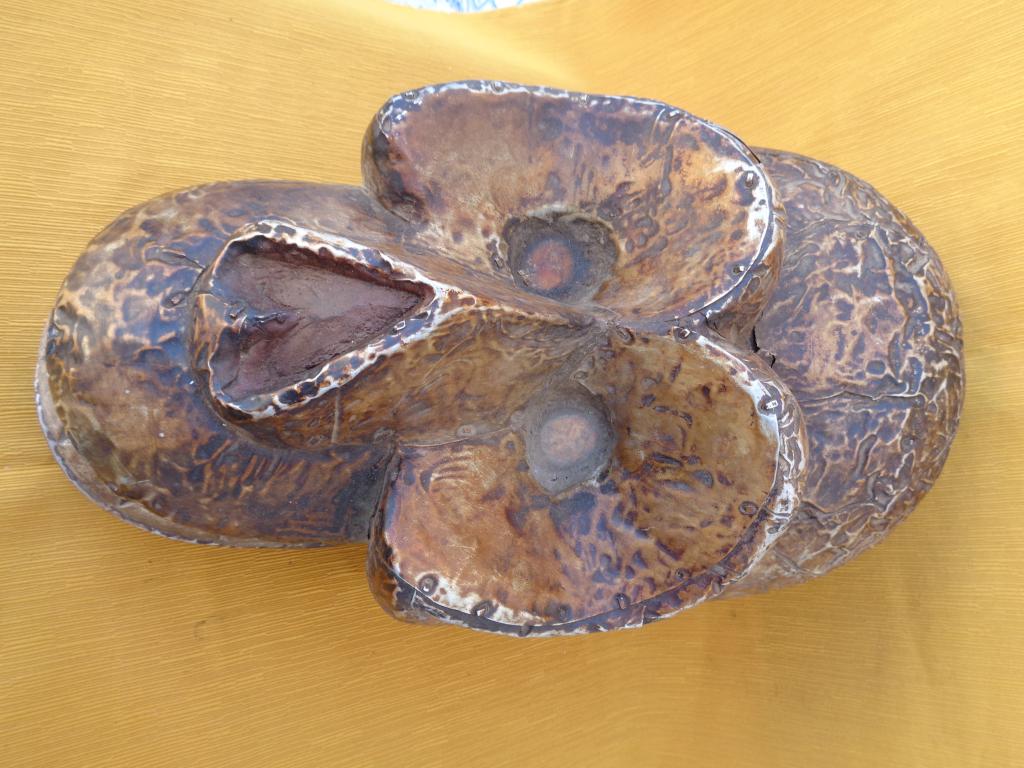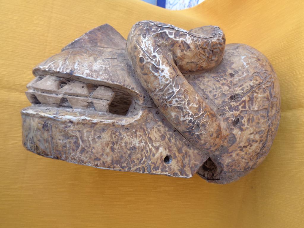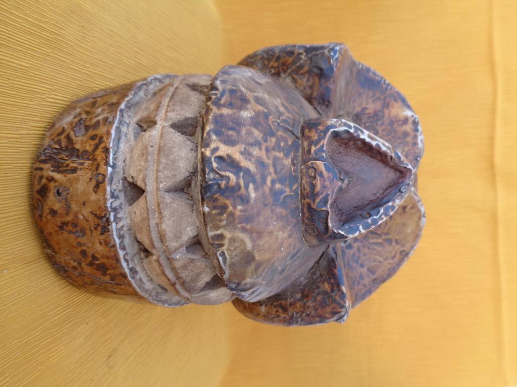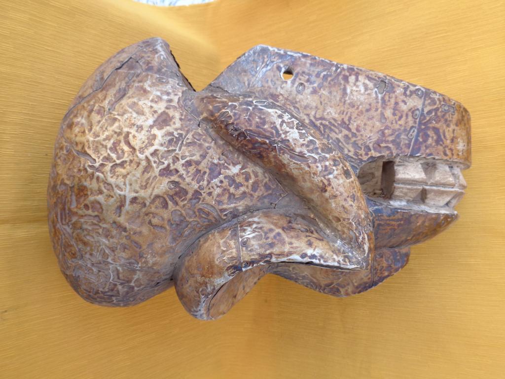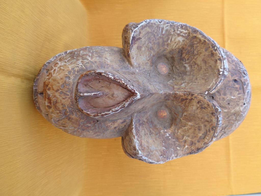 Normalmente las máscaras Ekpo tienen grandes órbitas oculares, pero en el caso de esta máscara son verdaderamente enormes. Por la forma en la que está recubierta la madera y moldeado el metal no cabe duda de que ha tenido que ser obra de un experto, con toda seguridad el herrero, por su dominio del metal y que también, en la mayoría de los casos suelen ser el hechicero, adivino o sacerdote. Realzan en esta máscara los laterales de la órbitas oculares por su longitud y grosor. En el fondo de estas órbitas aparecen dos pequeños ojos. Las arrugas que cubren laa parte metálica son el resultado de los golpes de la herramienta que le ha dado la forma. Algo nada frecuente en este tipo de máscaras es su gran boca, abierta, de madera, mostrando dos filas de dientes con forma de trapecio que se oponen por su base, separadas por una línea central. Y su nariz, representada por una especie de triangulo ovalado, con el vertice hacia arriba y un pequeño tabique central en su parte inferior. Es ciertamente una máscara que rompe todos los moldes.