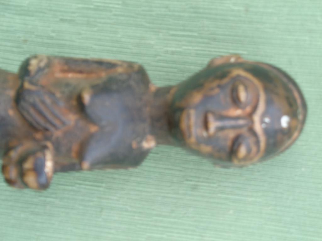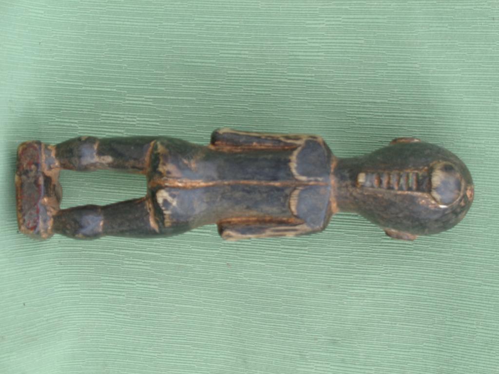 Antigua y pequeña estatua baulé que rompre con las características habituales de la estatuaria de la etnia, tanto por su morfología, peinado, como por la expresión de su rostro. En su mano izquierda lleva un pequeño recipiente destinado a contener la ofrenda. Curiosamente los dedos meñique y anular de la mano derecha aparecen junto o pegados. Pátina antigua.