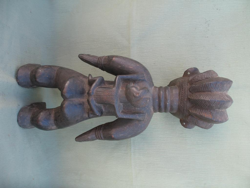 Estatua, profusamente tatuada. peinado formando bucles paralelos que parte de la frente hacia la parte posterior de la cabeza. Boca prominente. Destacan sus pechos, grandes y tatuados, alargados y triangulares. Cuello anillado como símbolo de belleza femenina y piernas y brazos separados del cuerpo.
