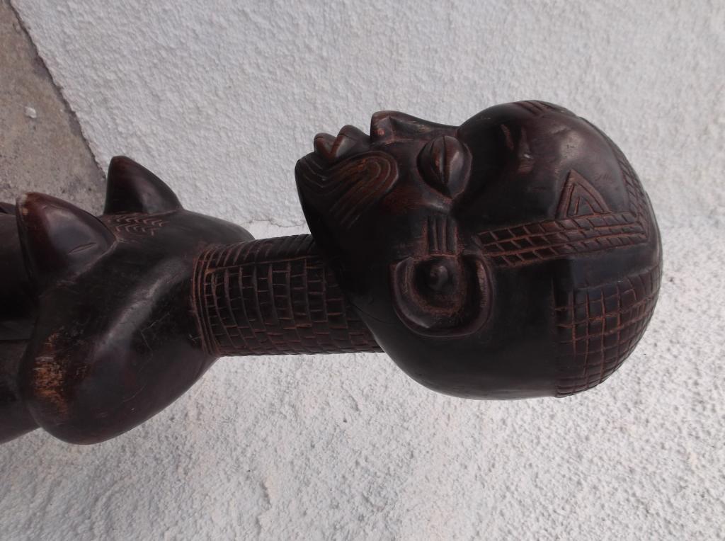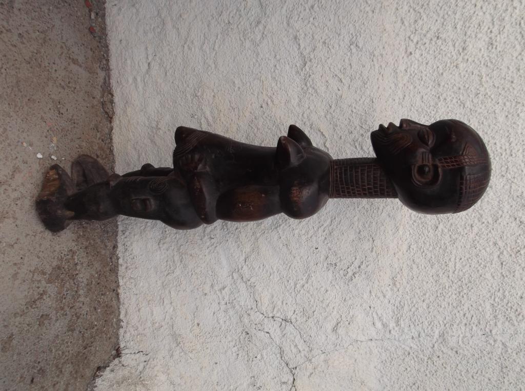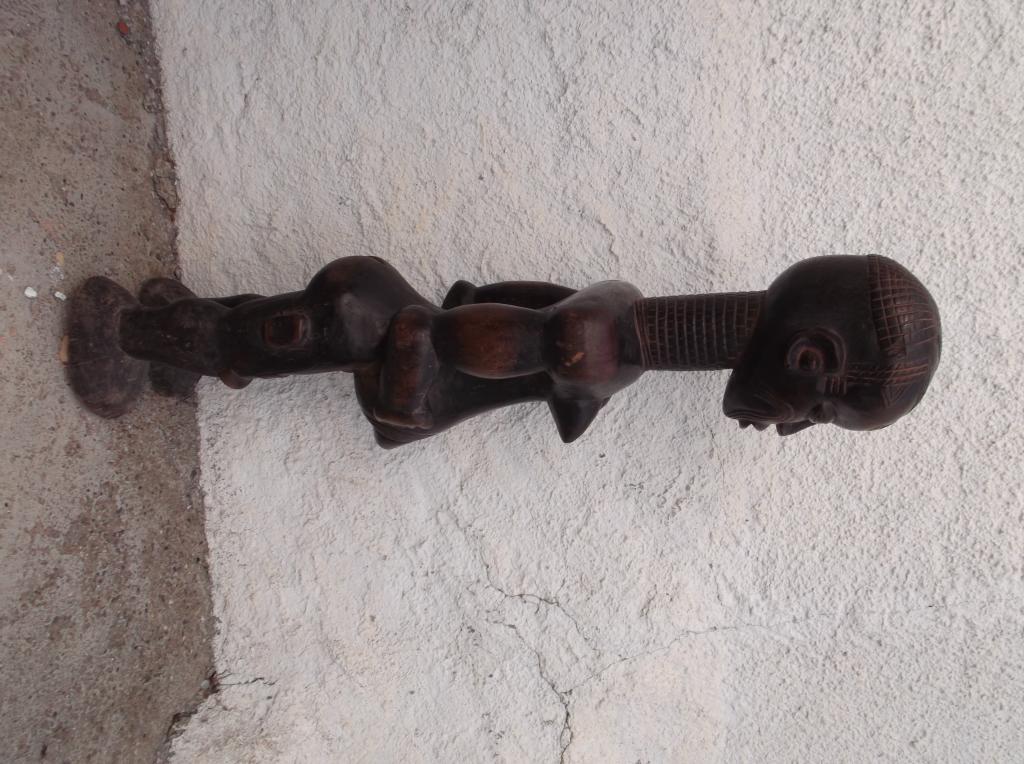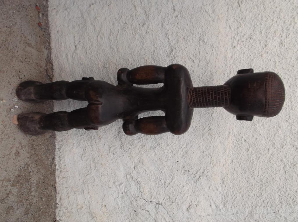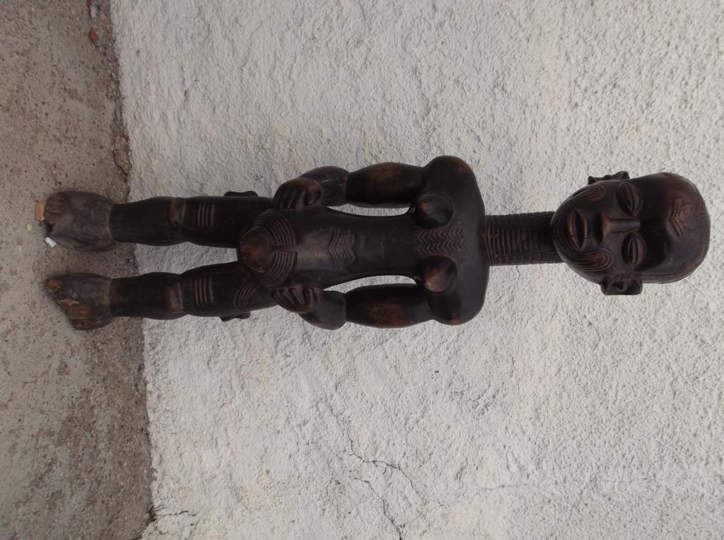Pieza tallada en madera densa y pesada. Perteneció a la colección particular del padre de Mamadou Marema Diop, familia de conocidos anticuarios senegaleses durante varias generaciones. Esta figura del siglo XIX se diferencia claramente des las estatuas actuales, normalmente de tamaño más reducido y escarificaciones mucho más bastas que se extienden por casi todo el cuerpo. Son muy pocas las estatuas Bena Lulua que existen de antes de su prohibición a finales del siglo XIX. Las del siglo XX no tienen la misma finura. Esta estatua se caracteriza por el total respeto de las características de estas maternidades Lulua del siglo XIX. Finas escarificaciones en distintas partes del cuerpo, cuello largo anillado, pechos pequeños y vientre prominente. Tiene rotos los dedos del pie izquierdo. Pátina oscura muy antigua.