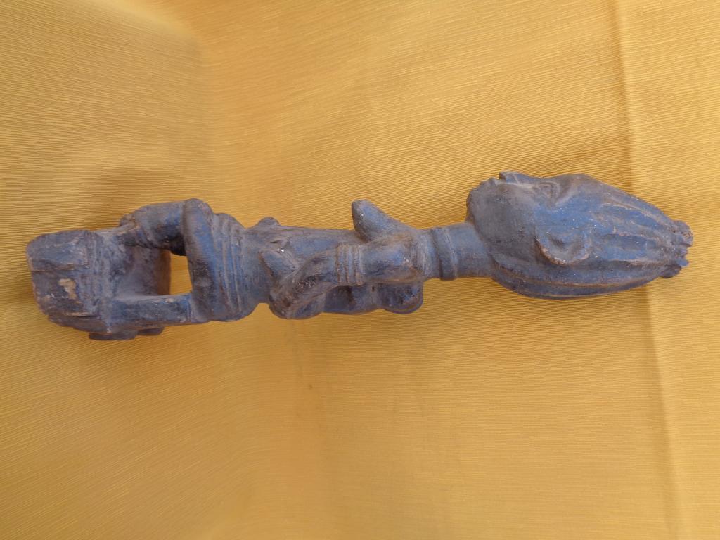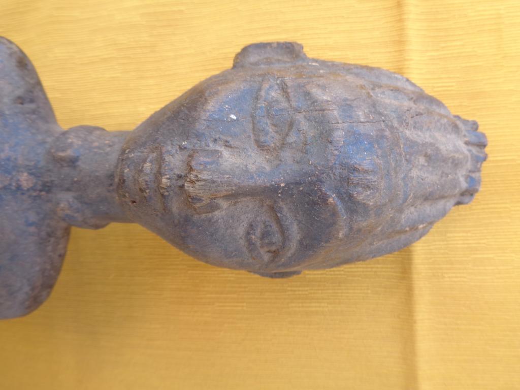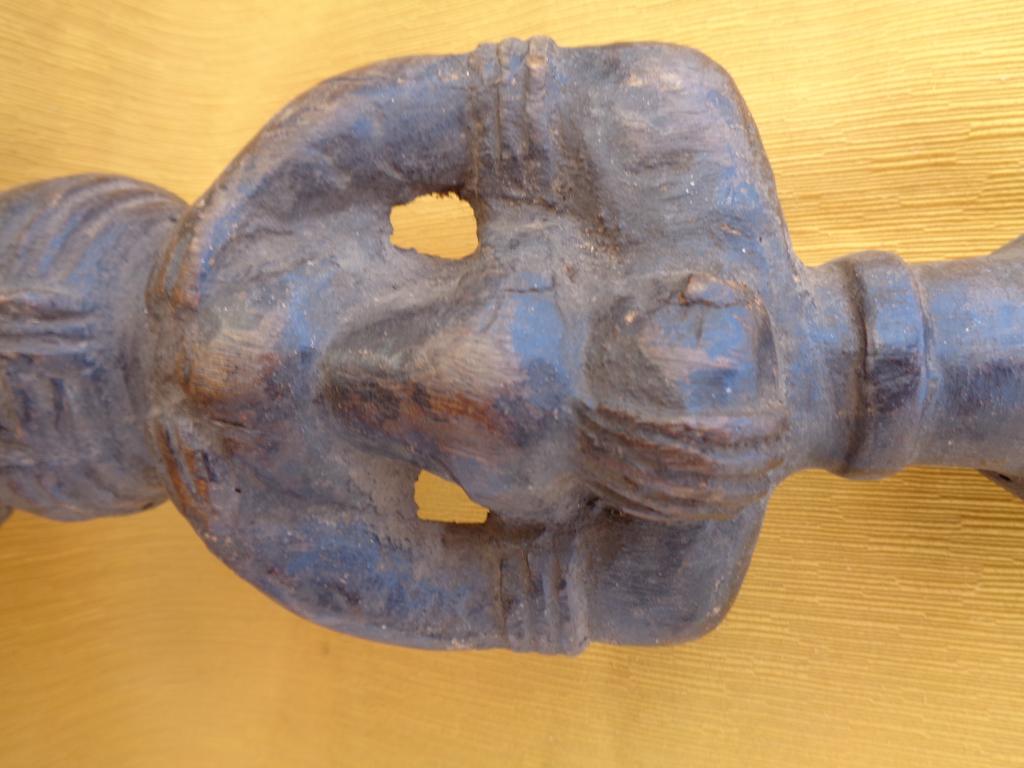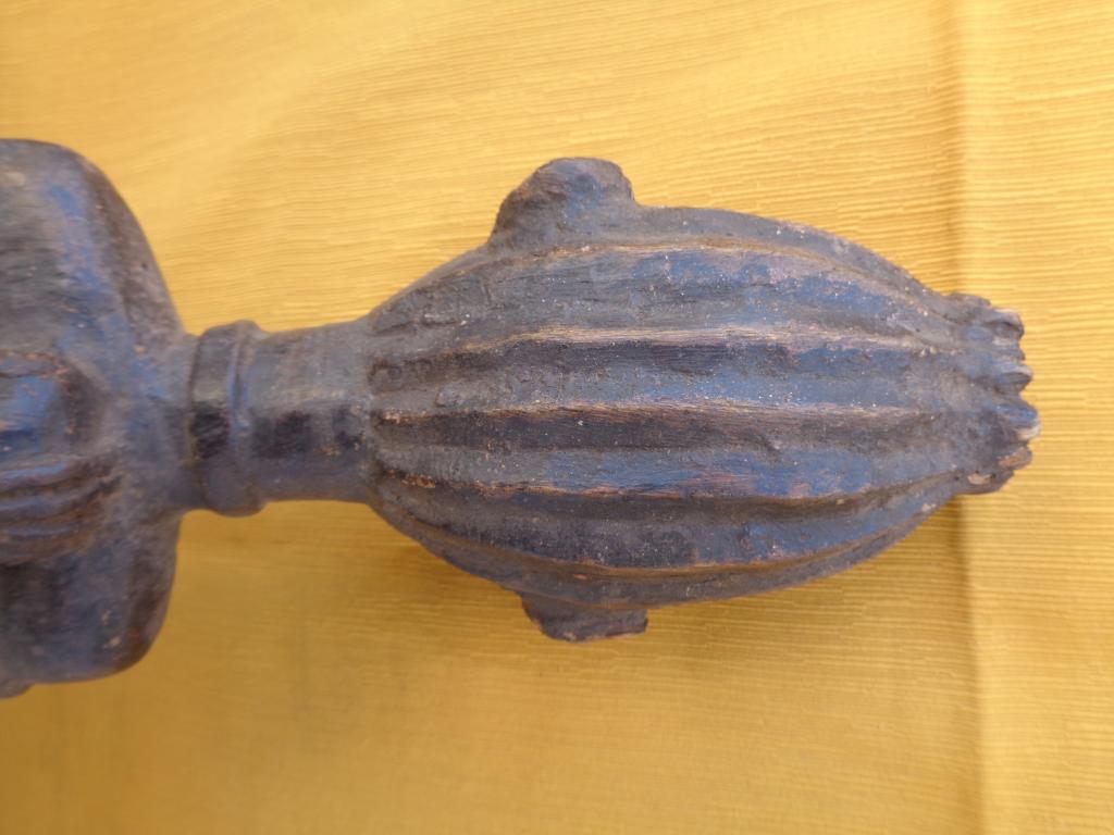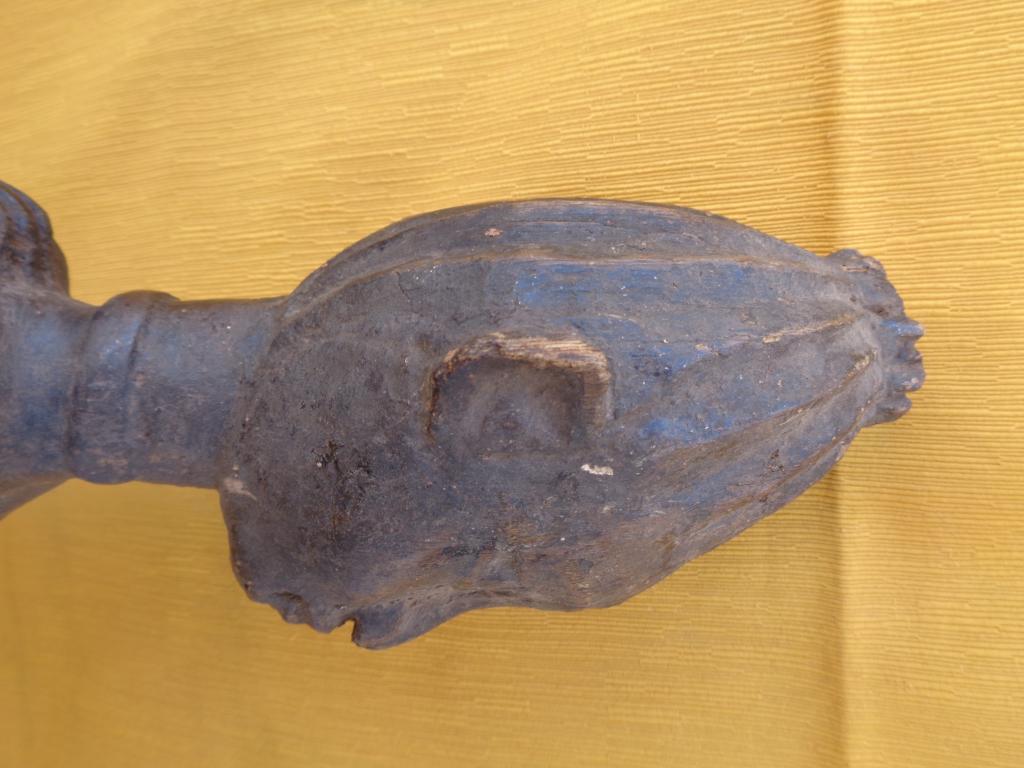 Bella y rara maternidad de finales del siglo XIX con el niño a la espalda y los trazos poco marcados para poner en relieve a la madre. Rostro sereno con los rasgos igualmente poco marcados. Sencillo peinado orientado hacia arriba. Pieza rarísima de la etnia Nalu. Pátina marcada por la antigüedad y el uso.