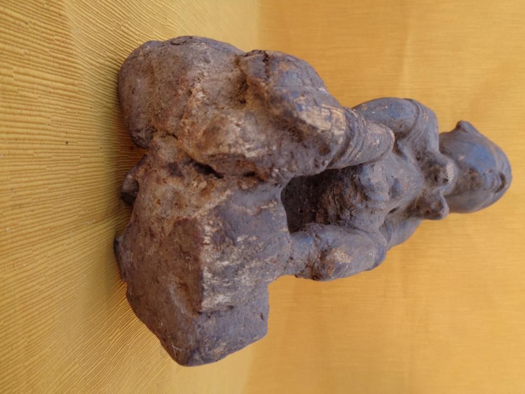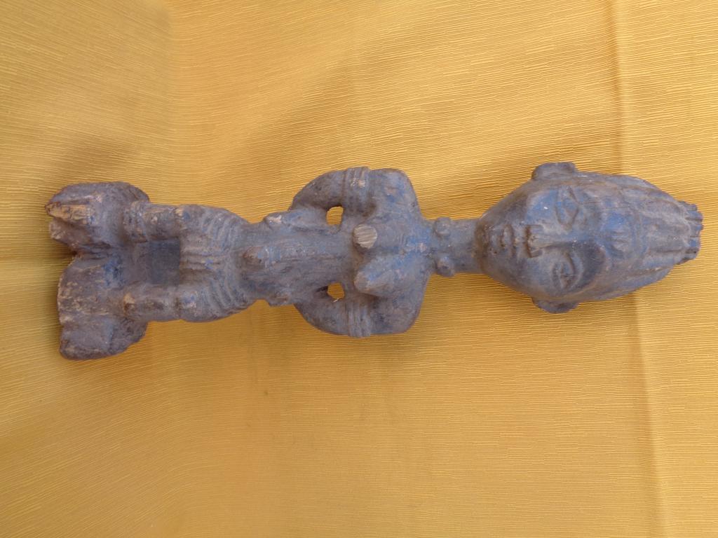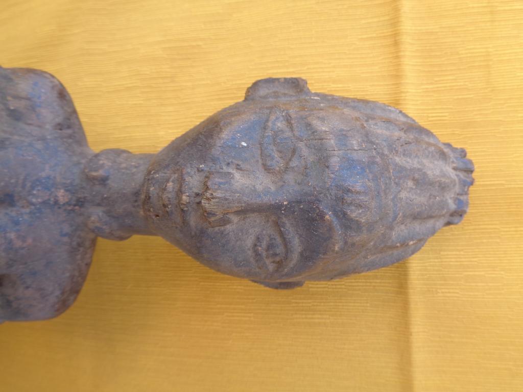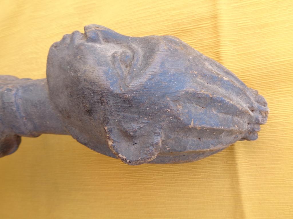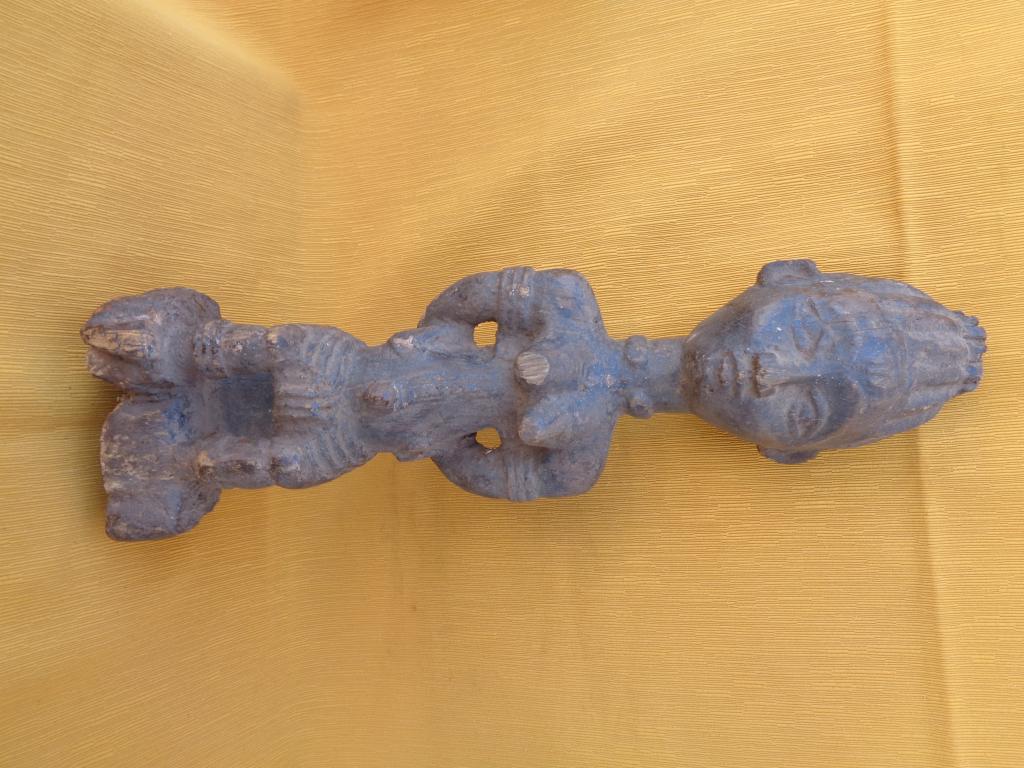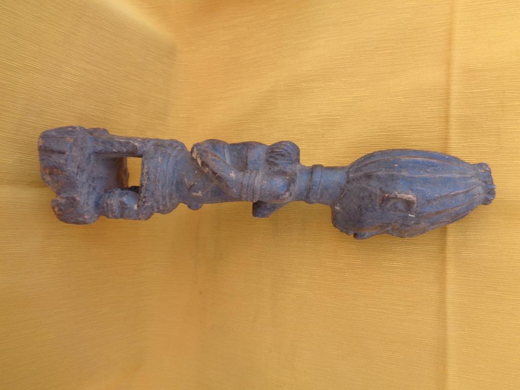 Bella y rara maternidad de finales del siglo XIX con el niño a la espalda y los trazos poco marcados para poner en relieve a la madre. Rostro sereno con los rasgos igualmente poco marcados. Sencillo peinado orientado hacia arriba. Pieza rarísima de la etnia Nalu. Pátina marcada por la antigüedad y el uso.