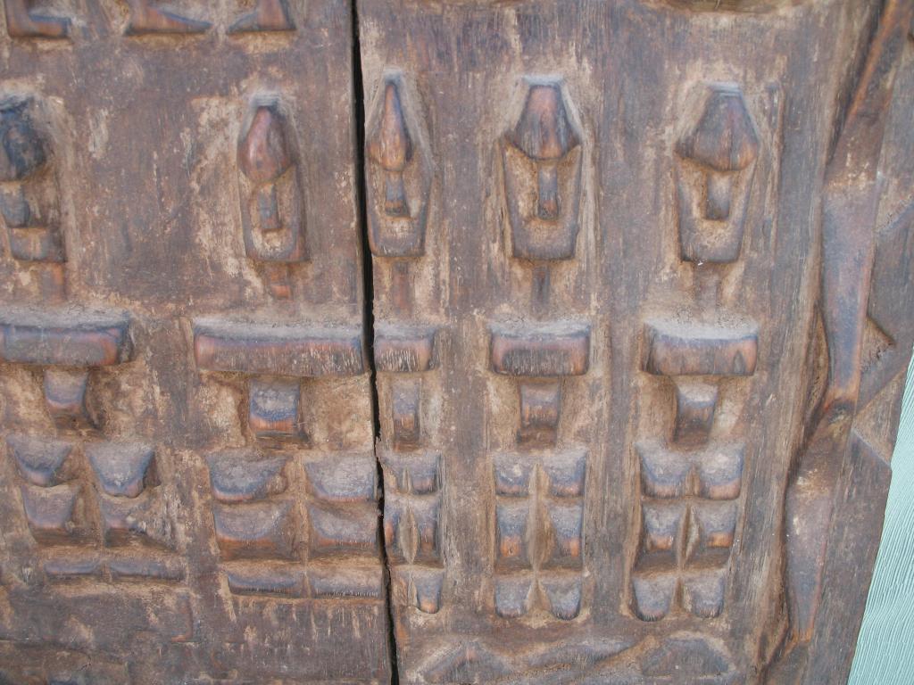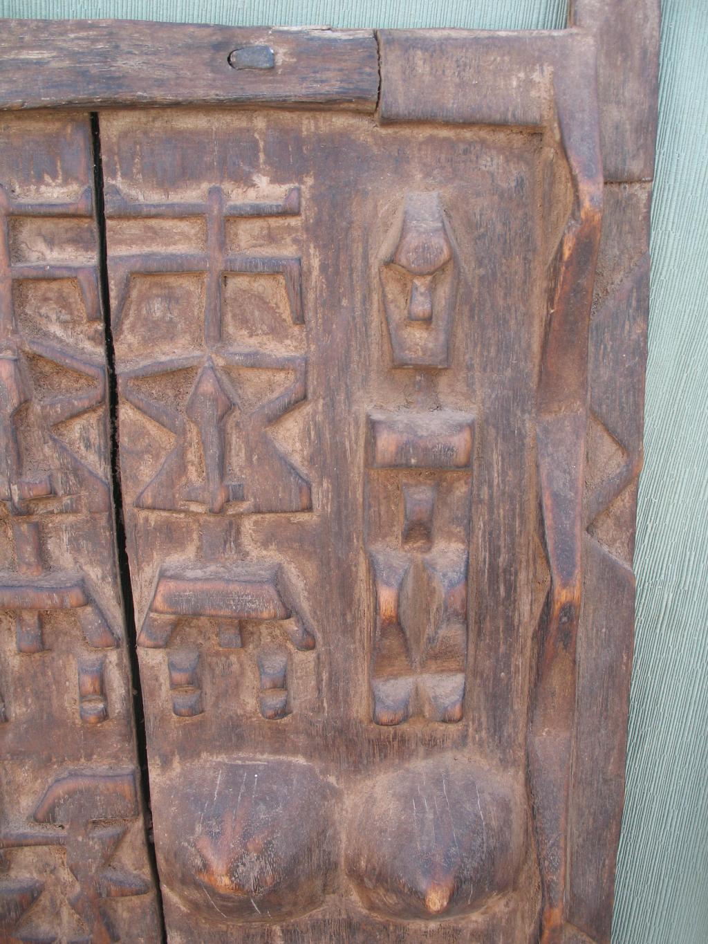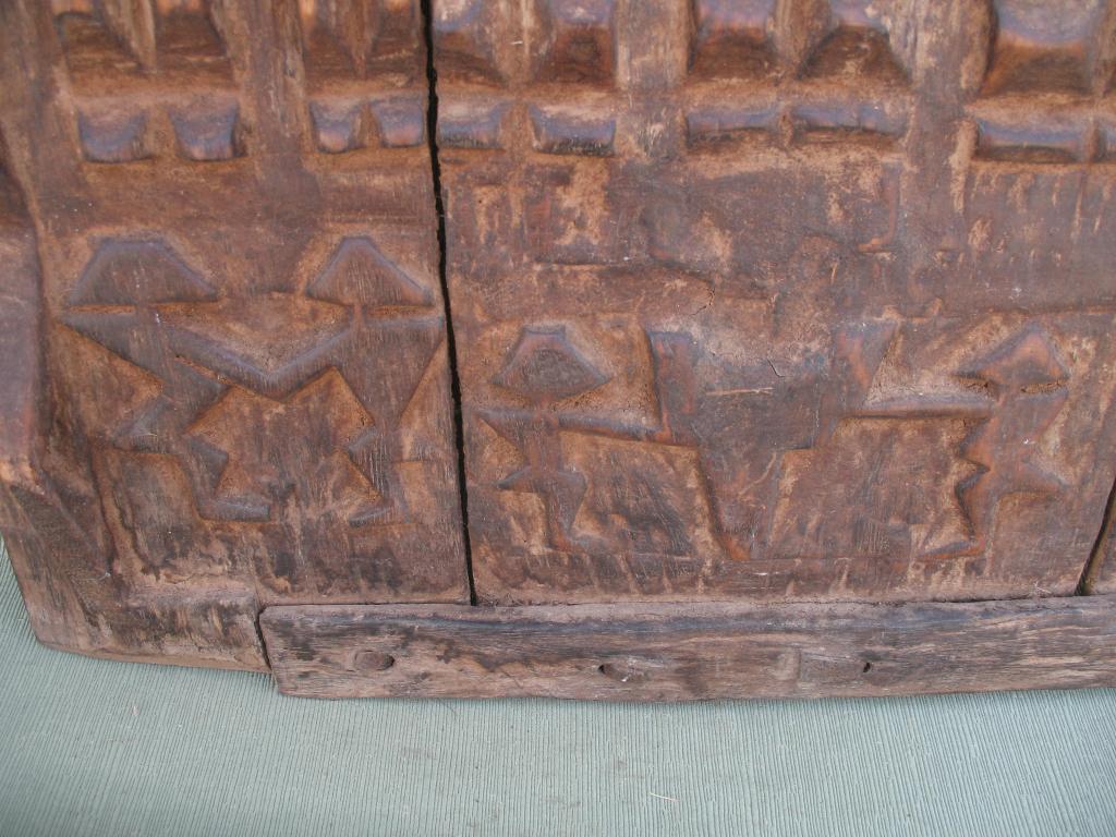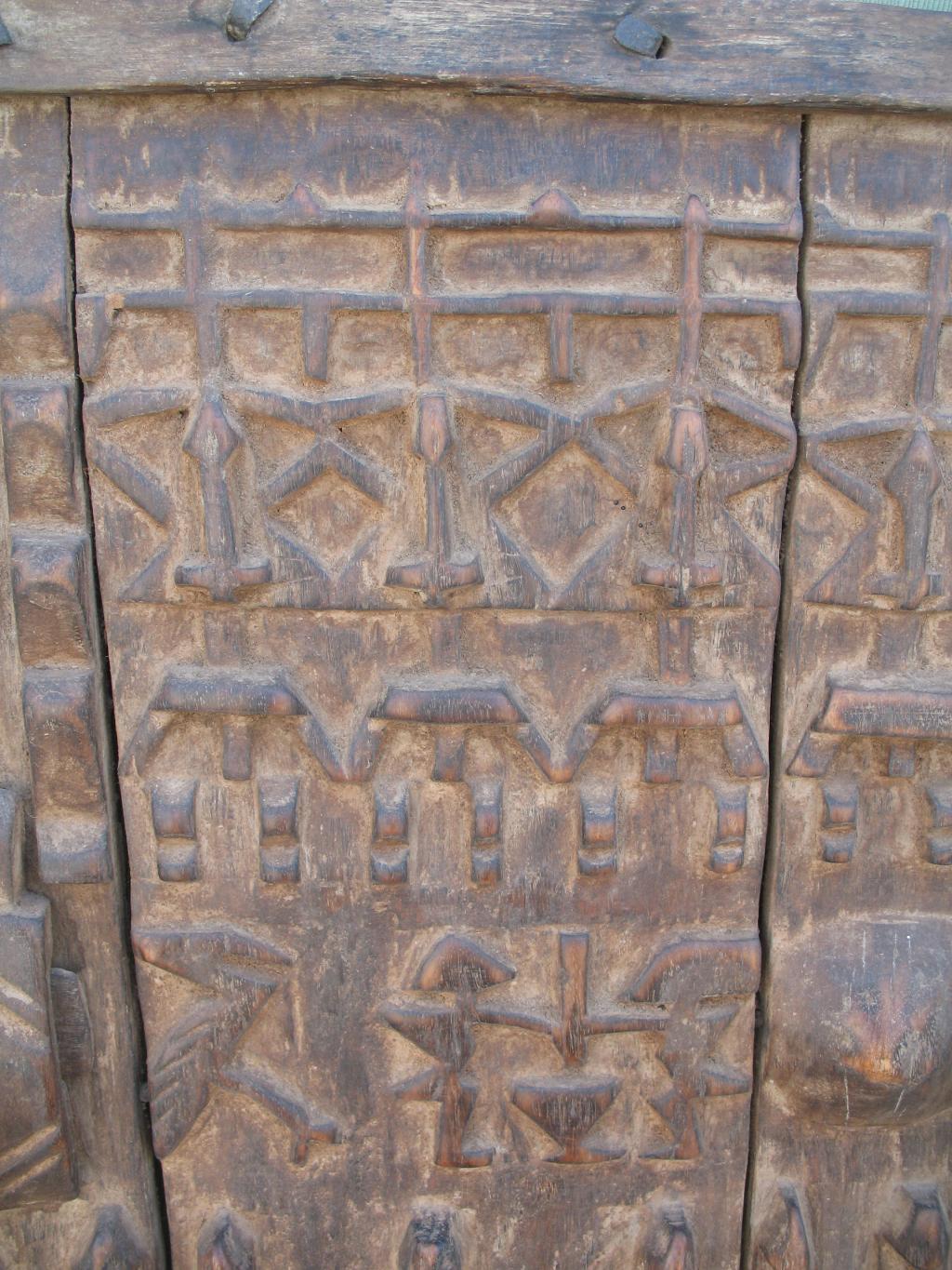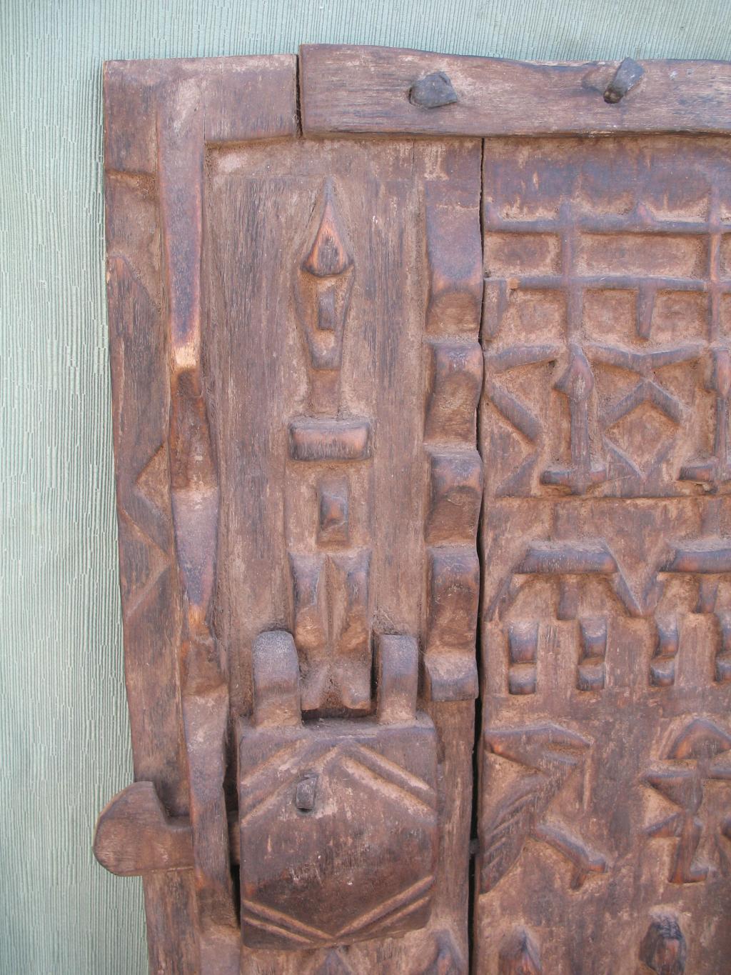 En esta puerta dos nomos flanquean a cuatro danzantes los las máscaras Kanaga en la parte superior. En el centro, dos mujeres majando el mijo, con un calao a la izquierda y a la derecha los pechos nutricios símbolos de la fertilidad. En un plano inferior las cuatro parejas de gemelos primordiales, los primeros hombres convertidos en nomos. Y en el último nivel, dos mujeres bailando para celebrar el resultado de la caza que los hombres están descuartizando a la derecha. Pátina marrón.