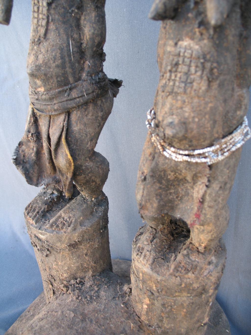 Altar formado por una pareja baulé en actitud de recogimiento ante el tambor destinado a llamar a los espíritus. Las figuras están realizadas en el más puro y clásico estilo baulé. El tambor está situado, al igual que la pareja, sobre un montículo de tierra que constituye el verdadero altar. El tambor, en este caso, es el medio que permite establecer el contacto con los espíritus, para demandar su protección. Antigua pátina de uso.