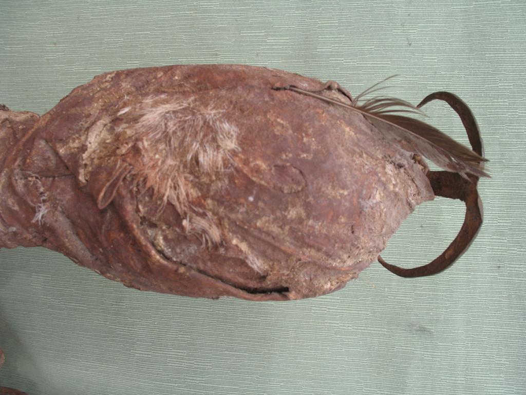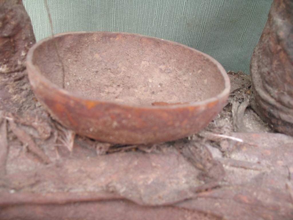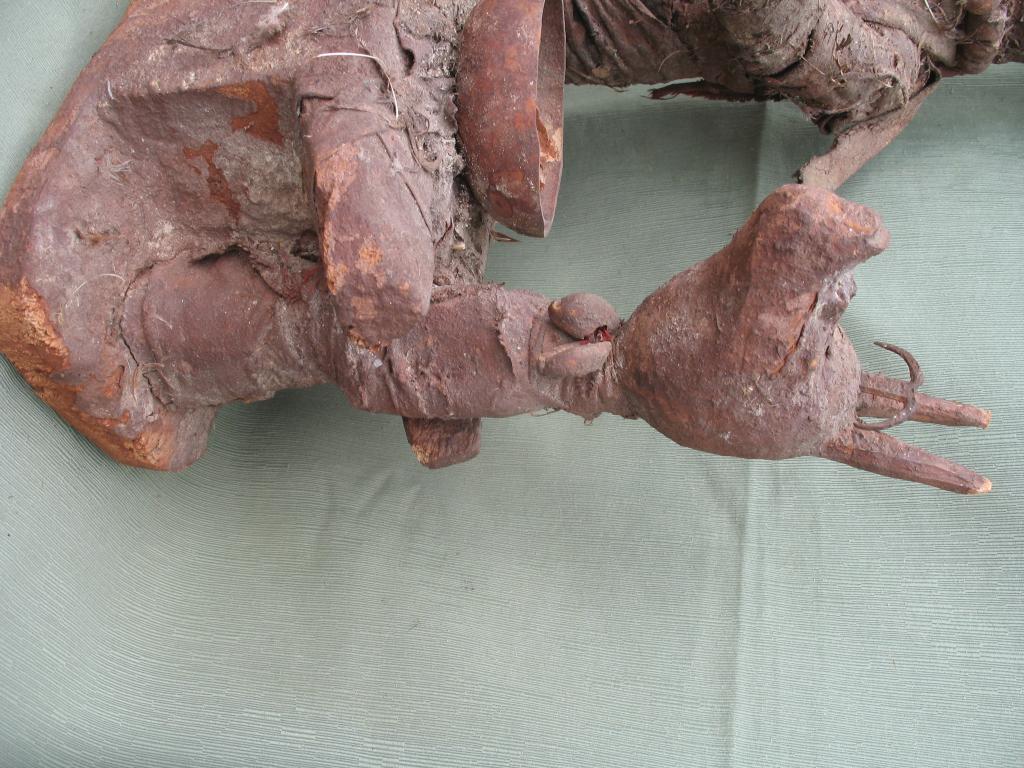 Rarísimo alar vudú que representa a una sacerdotisa, con los brazos extendidos en plena acción. A sus costados hay lo que parecen dos animales con pequeños cuernos rectos, que también podrían representar las orejas, en ambos casos de difícil interpretación. En sus cabezas figura el hierro ritual fon y cauries en sus cuellos, que también forman los ojos de la sacerdotisa. Un espejo redondo ocupa su pecho. El espejo puede servir para rechazar las fuerzas del mal, pero también puede robar el alma al intruso que se mira en él, pues en él se ve reflejado. Otro espejo, perdido, figuraba en el centro de la parte inferior. Los huecos de esta parte inferior estaban destinados a guardar reliquias de los antepasados. Los recipientes que están sobre la mesa sirven para la mezcla de sus productos mágicos. En realidad se trata de tres bocios que han recibido multitud de libaciones. Los bocios son objetos destinados principalmente a la protección personal o de la comunidad contra actos de hechicería que podrían provocar epidemias, guerras, desnutrición o enfermedades. También eran utilizados para causar daños a los enemigos o para obtener una curación o el éxito personal. Fabricados secretamente por su propietario o por el hechicero se componen de elementos mágicos sólo por ellos conocidos. Normalmente se utilizan huesos, hierros rituales, cauris, barro, fibras vegetales, plumas, uñas, cuerdas, garras de animales, sangra, abalorios, semillas y todo tipo de sustancias mágicas, según se destinen a uno u otro fin, y hasta candados pues el candado sirve para abrir o cerrar las fuerzas ocultas.