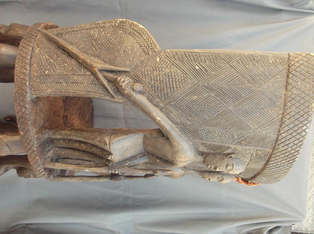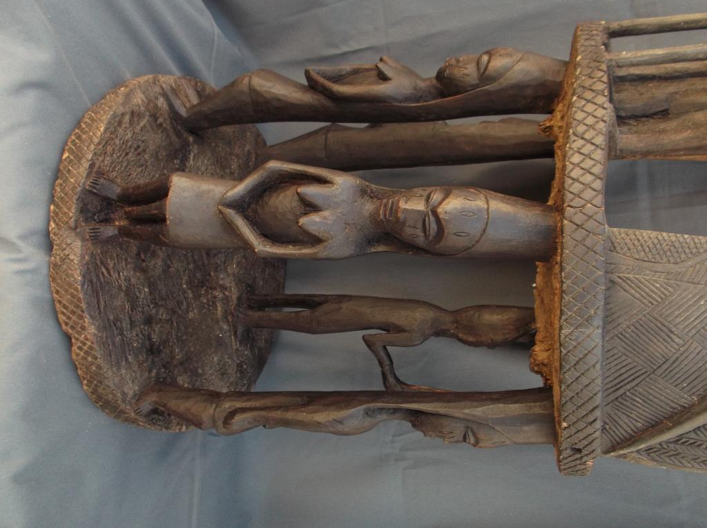 Silla con cariátides profusamente decorada de las que en el arte africano se conocen normalmente con el nombrfe de "trono". En el respaldo del nivel superior,el del asiento, aparecen esculpidos dos guerreros con lanzas, sin duda los guardianes del santuario. Se carece de información sobre esta silla. Por su decoración se puede deducir que perteneció a un santuario o altar del dios Eshu cuyo rostro aparece en una especie de estandartes portados por la figura central, delantera, ded la parte inferior. En los personajes alternan los hombres y mujeres. Esta silla estaba muy deteriorada y ha sufrido una importante restauración respetando una reparación indígena.