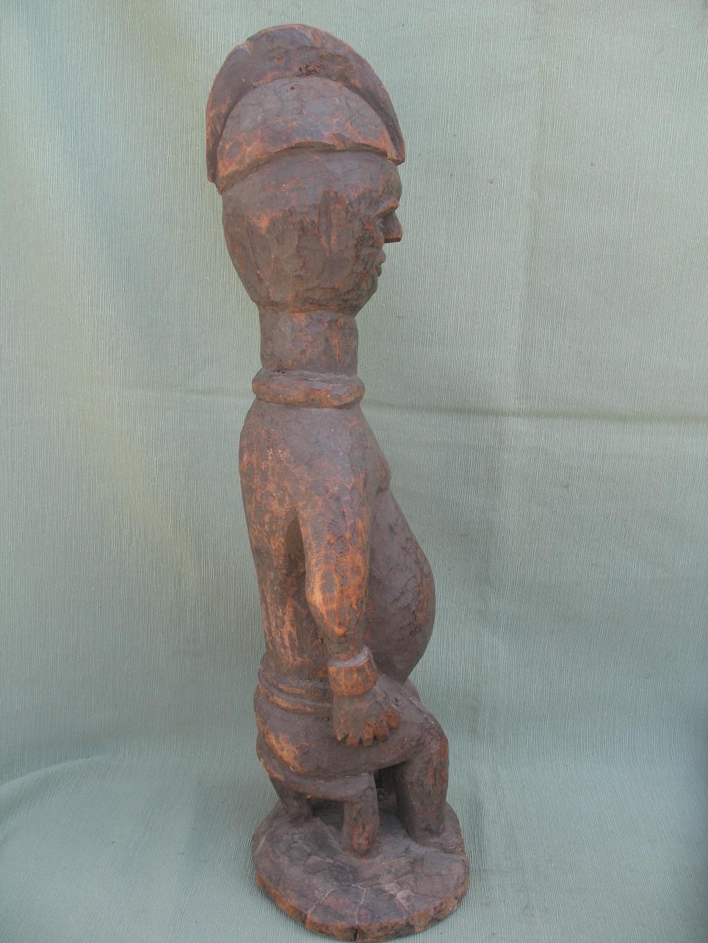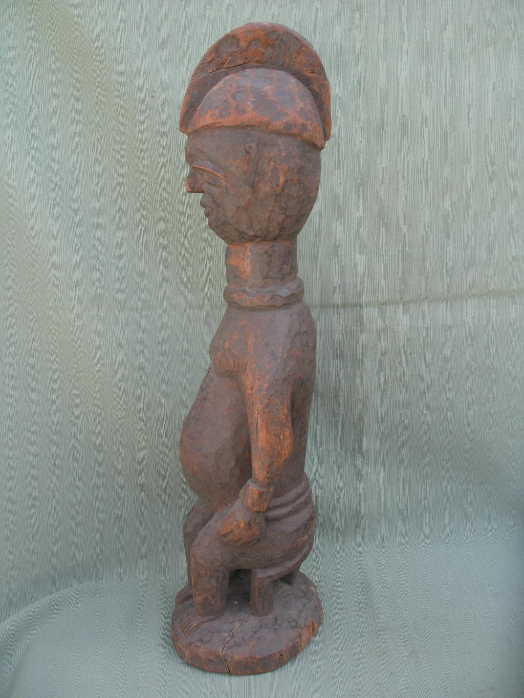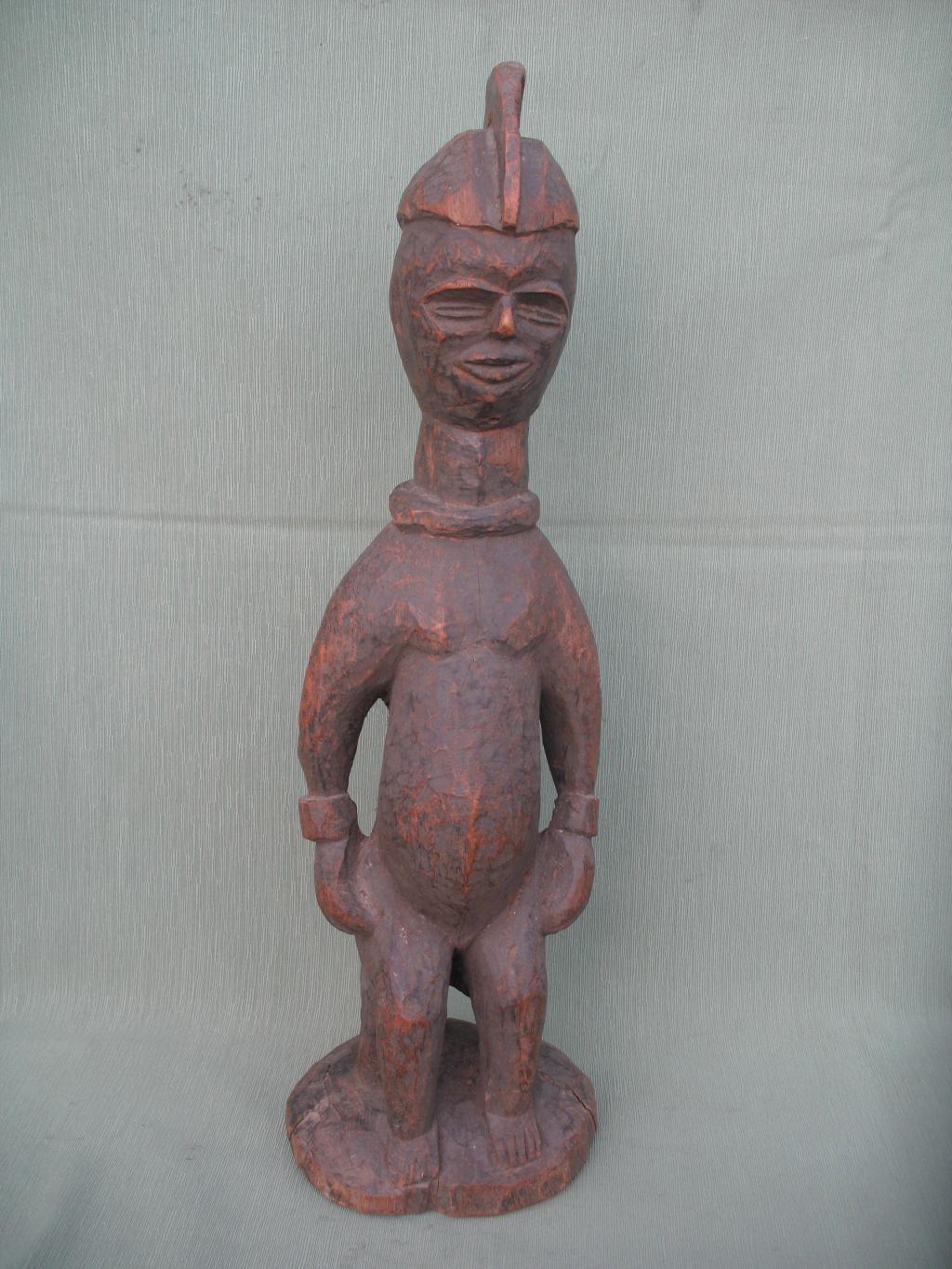 Figura de antepasada de tosca realización. La mujer, de pechos incipientes, está sentada en un taburete de tres patas con las manos a lo largo de los costados. Lleva un collar de una vuelta, tallado en el cuello, brazaletes en las muñecas y un cinturón de dos filas en las espalda, que curiosamente o pasa a la parte delantera. El tocado es una especie de casco co una gran arista central. Los antepasados bidjogos tienen una gran presencia en la vida de los pueblos. Son convocados mediante el kumbonki. Para los Bidjogos, más que para otros muchos pueblos de África, el tambor es el medio más directo para comunicar con los espíritus. El sonido del kumbonki, tambor de ranura, es para ellos la voz de los antepasados. El sonido del tambor es un lenguaje perfectamente codificado que sólo es conocido por los iniciados. El tambor participa en todas aquellas festividades u ocasiones en las que se hace necesaria la presencia de los espíritus o de los antepasados, en los ritos masculinos de iniciación, en los ritos fúnebres verdadera iniciación de los difuntos para preparar su acceso al más allá, e incluso ritos en los que se interroga a los espíritus para averiguar las causas de una muerte determinada. Es la voz mediante la que se manifiesta en antepasado.