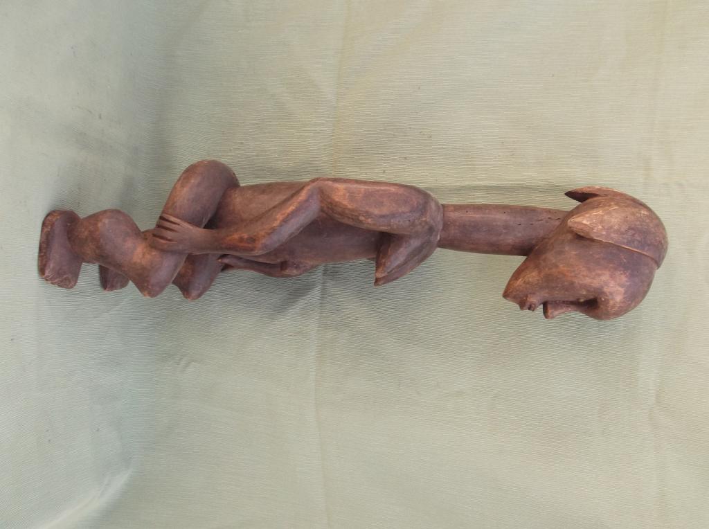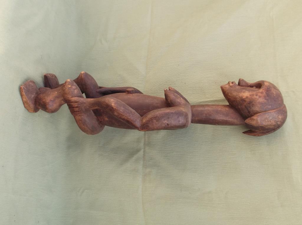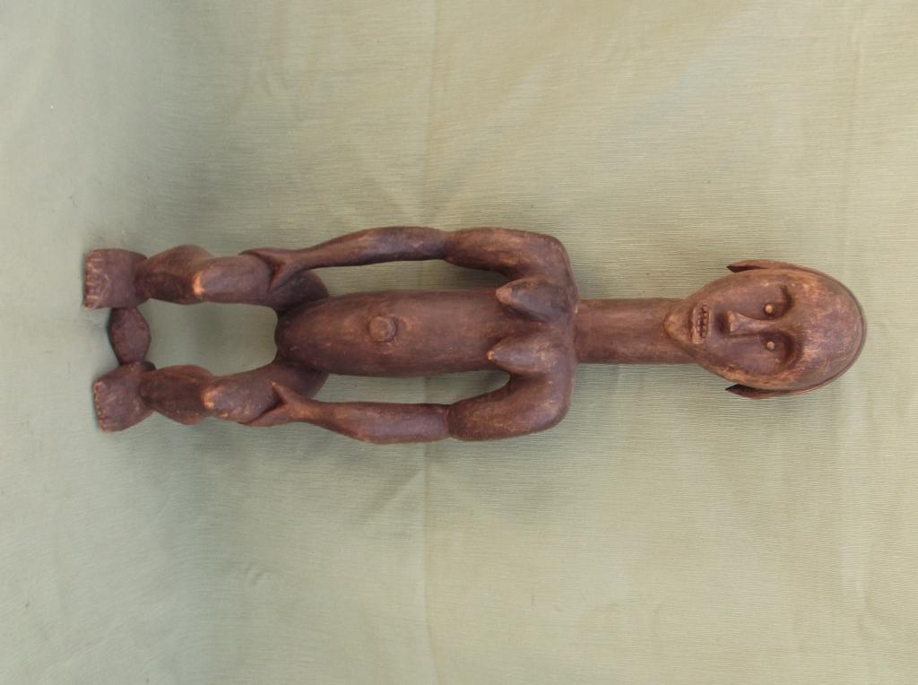 Los fang mabea están en Gabón y en Camerún. No tienen unión social ni política, su única cohesión es por medio de la sociedad religiosa so o de la jurídica ngil. Sus estatuas son de aspecto más realista, de gesto austero, ojos y boca grandes, con frecuencia abierta mostrando filas de dientes, como en este caso. Talladas en madera más clara, aunque lleven a veces una policromía negra o rojiza. Con frecuencia los ojos vas rodeados por placas circulares metálicas. También pueden llevar otras placas metálicas, en brazos y muñecas. Pátina del tiempo.