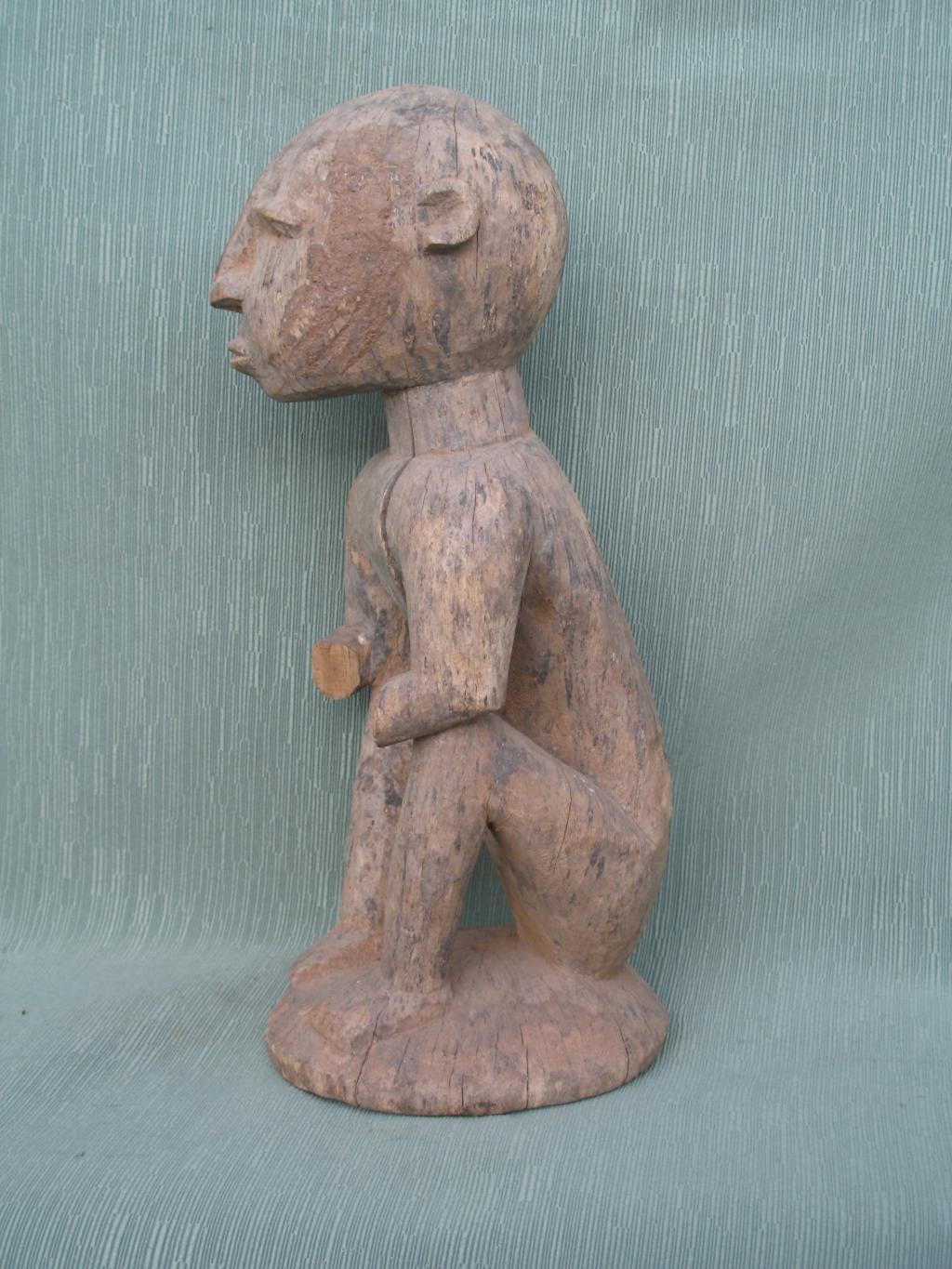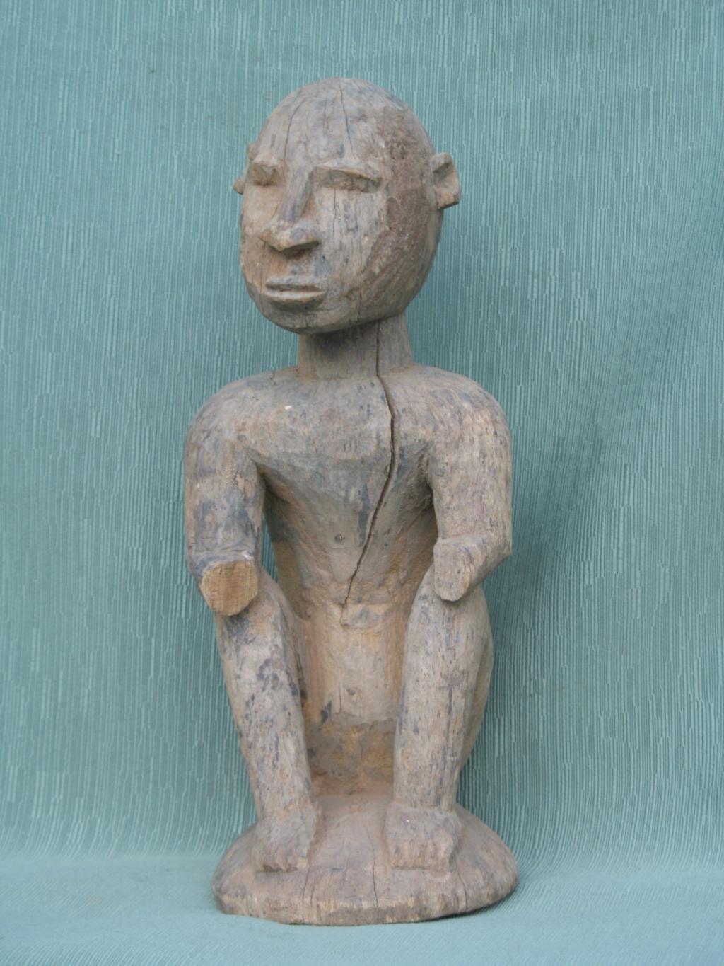 Antigua figura de antepasado de líneas sencillas. El personaje aparece sentado en actitud de meditación. Le faltan las manos. Pátina grisacea terrosa.