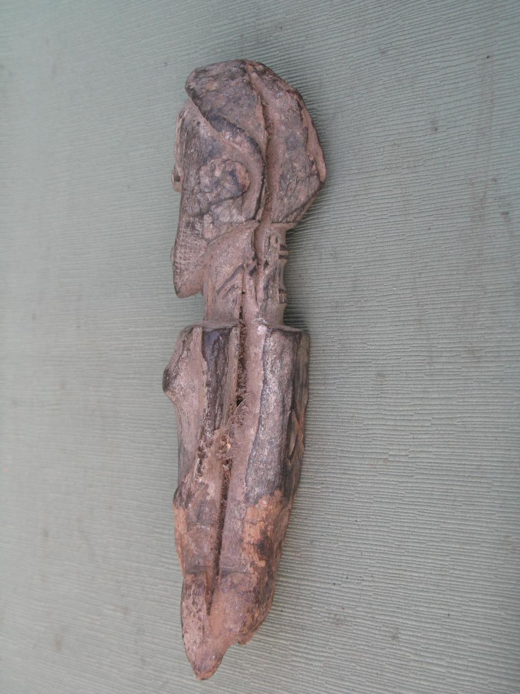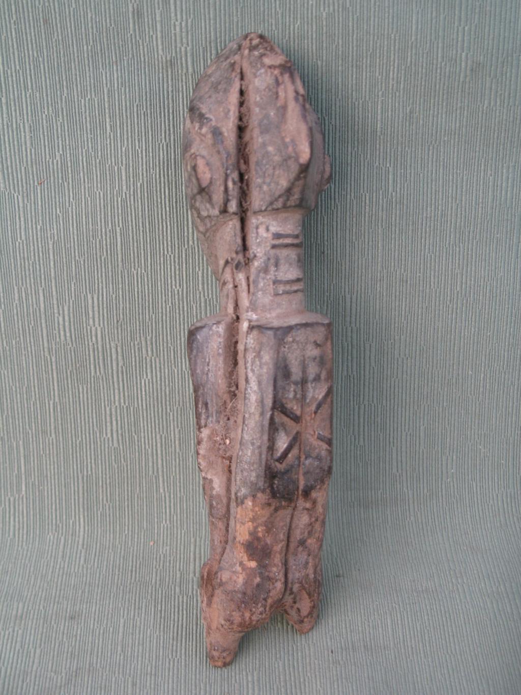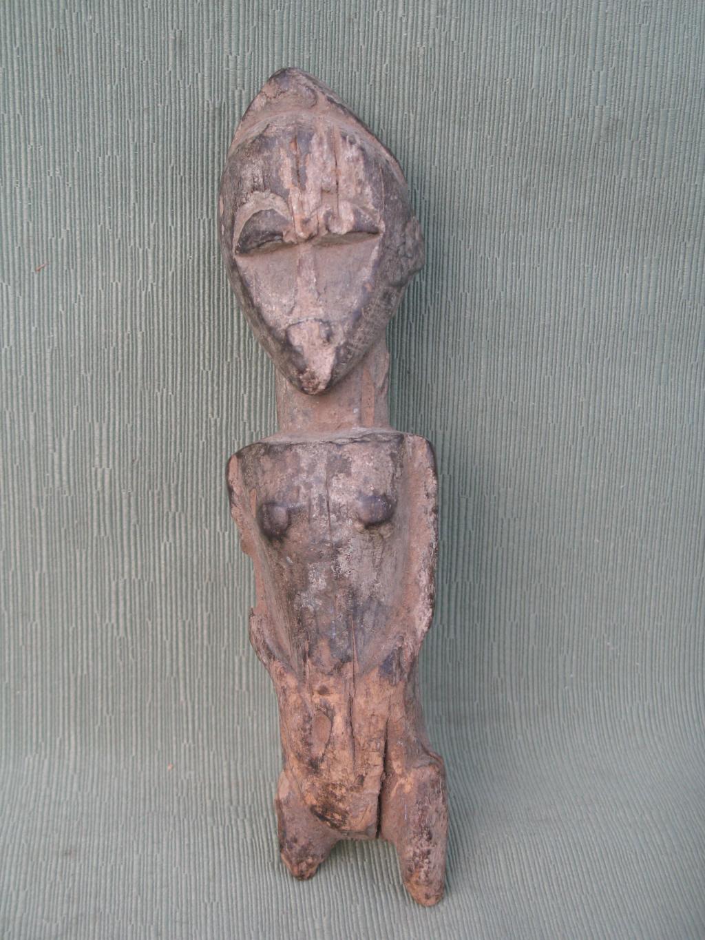 Pequeña estatua, de madera dura, muy deteriorada por el transcurso del tiempo. Es possiblemente una de las primeras blolo de la estatuaria baule. La figura preseta las manos a los lados del vientre en la clásica postura de bienvenida y de paz. Escarificaciones en el cuello y en la espalda. Pechos incipientes en la parte delantera. Muchas fisuras y notable desgaste particularmente en las piernas. Pátina muy antigua.