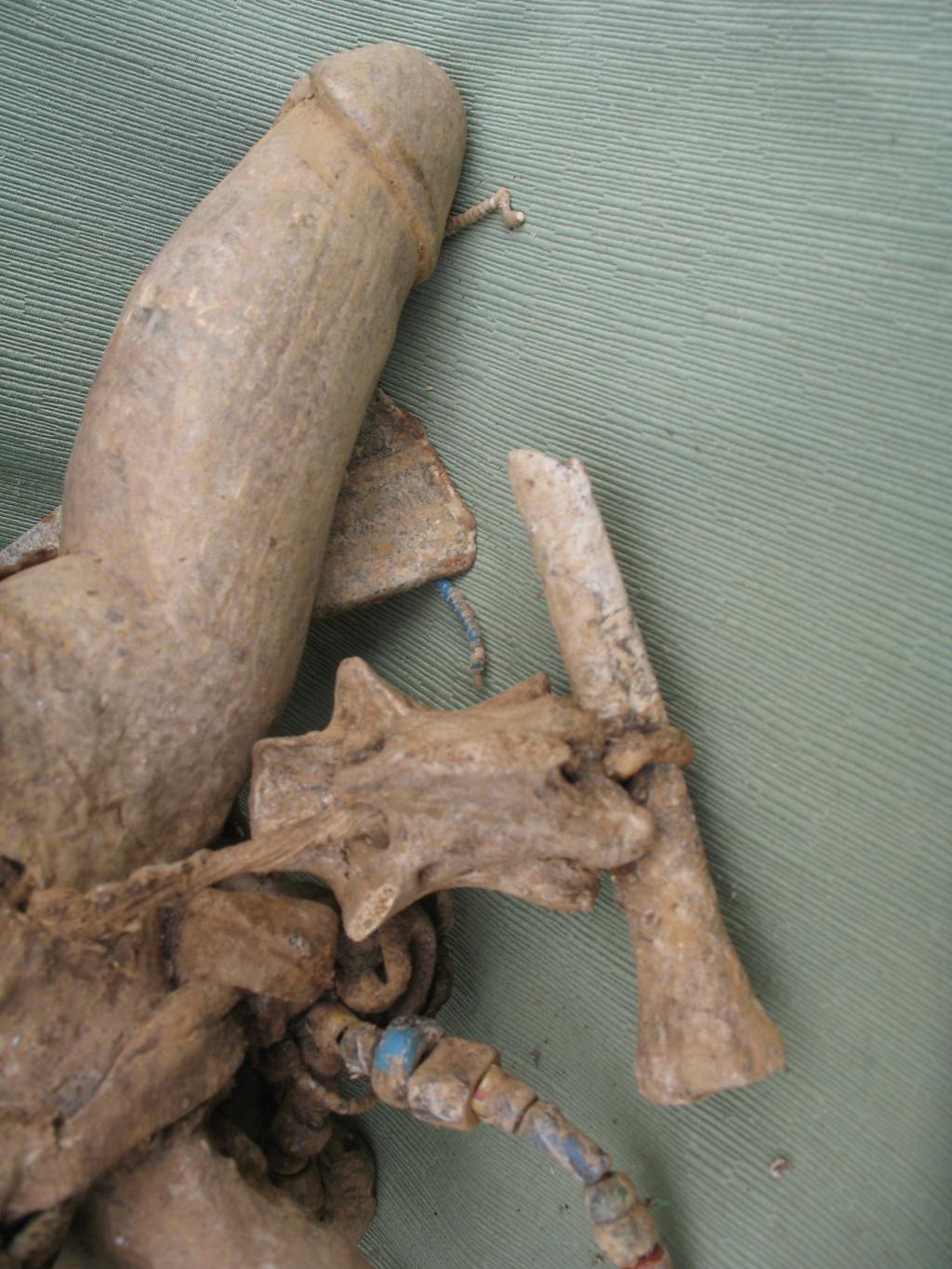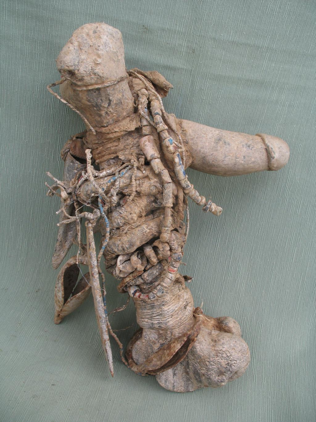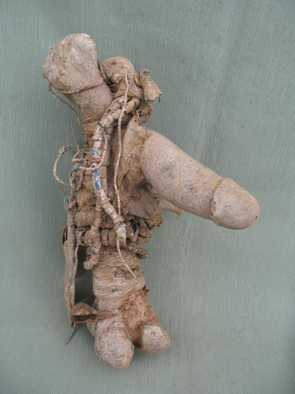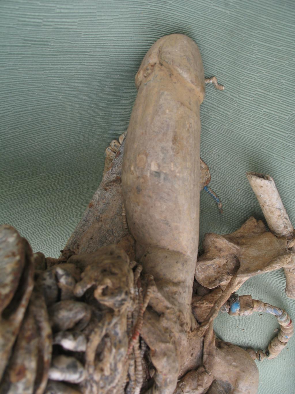 Este fetiche está destinado a favorecer la potencia sexual masculina y la fuerza física del hombre. Lleva numerosos amuletos para reforzar la eficacia del fetiche. Pátina sacrifical antigua.