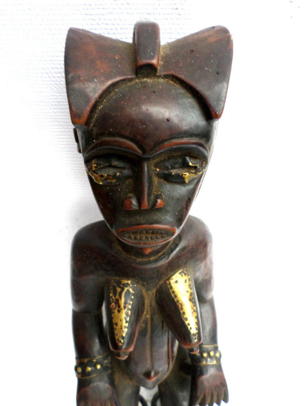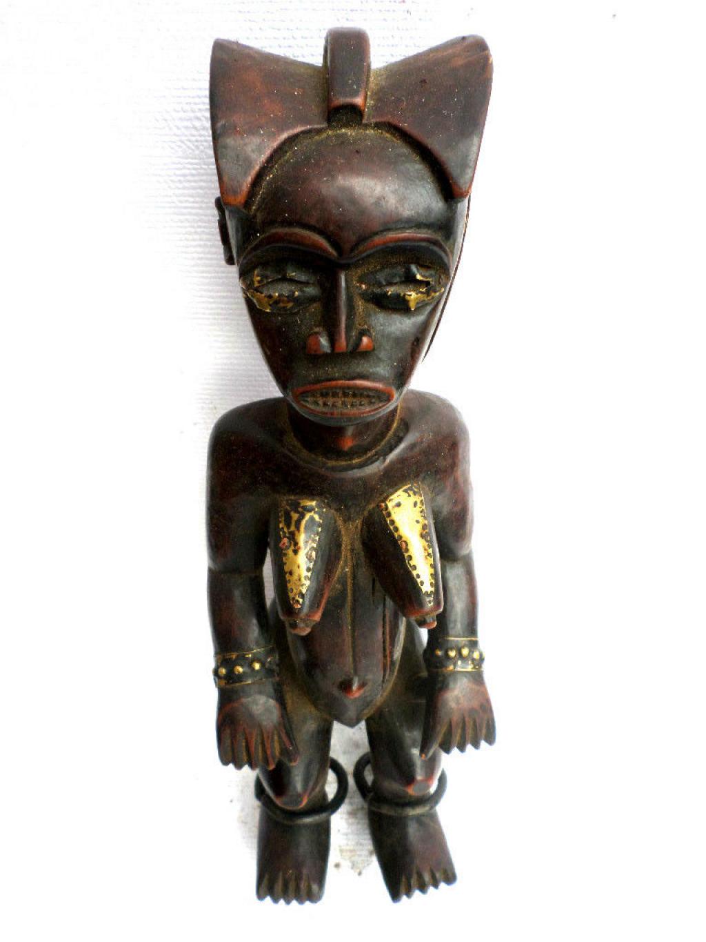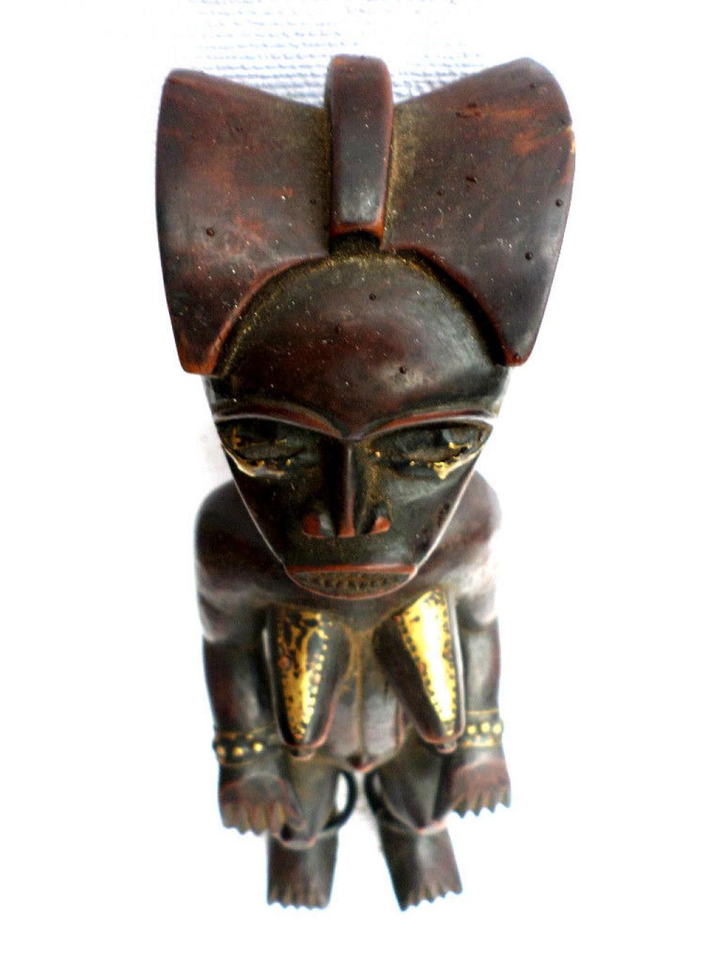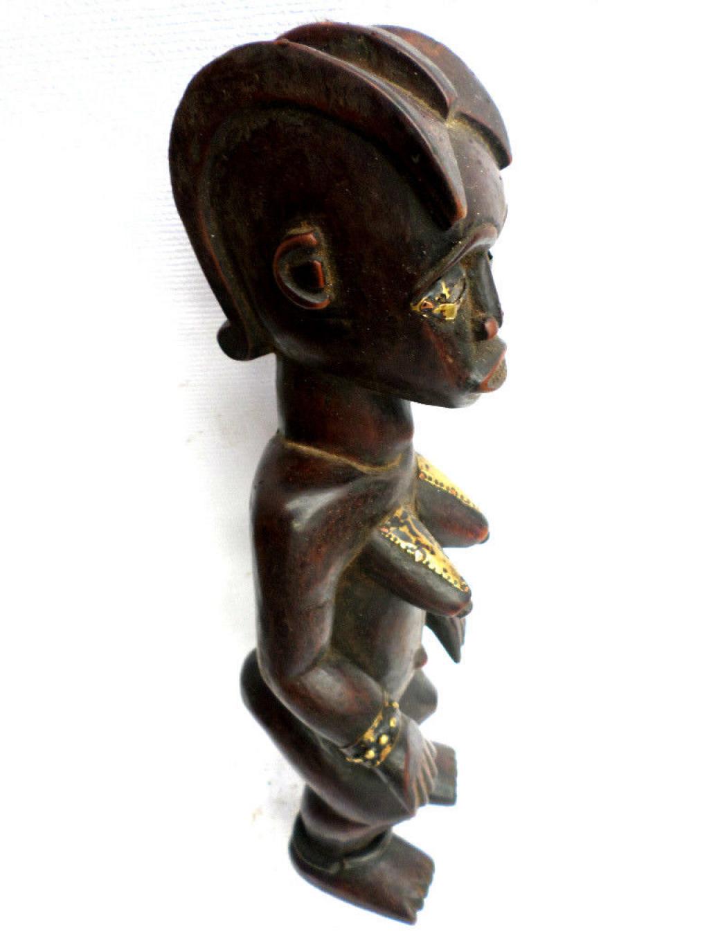 La figura que presentamos es un Fang Mabea bastante tardío. La escultura representa a una antepasada, sin duda la propietaria de las reliquias que están en la caja. La estatua lleva anillos de hierro en las piernas y placas de latón en pechos y ojos. La pátina más bien negra no es conforme a las primeras estatuas Mabea de color rojizo. Se echa en falta igualmente la cavidad clavicular característica de esta categoría de estatuas. El tocado y la boca con los dientes puntiagudos responden a los cánones de la etnia.