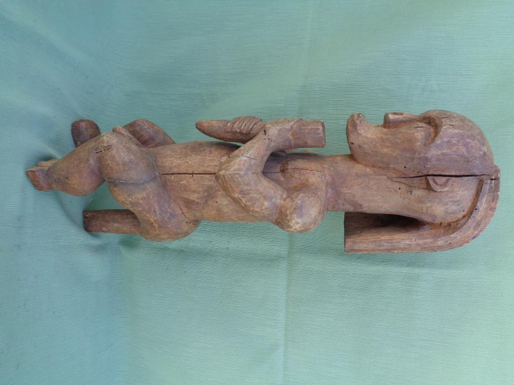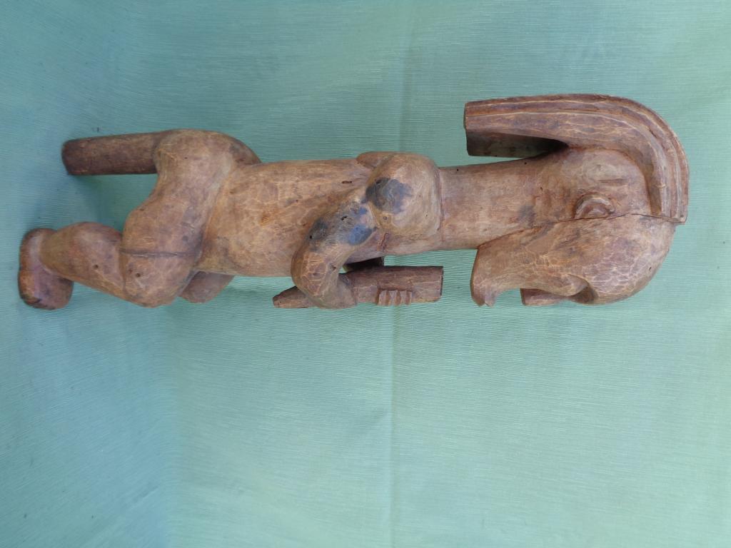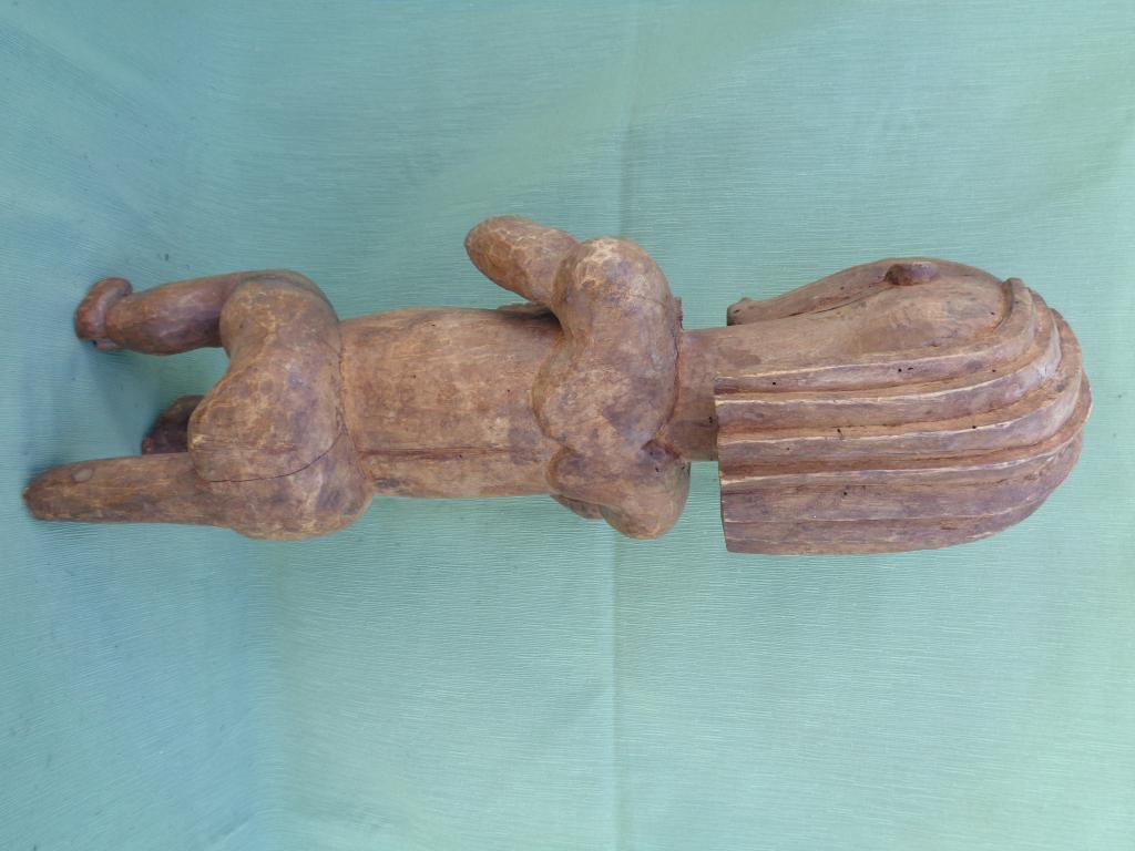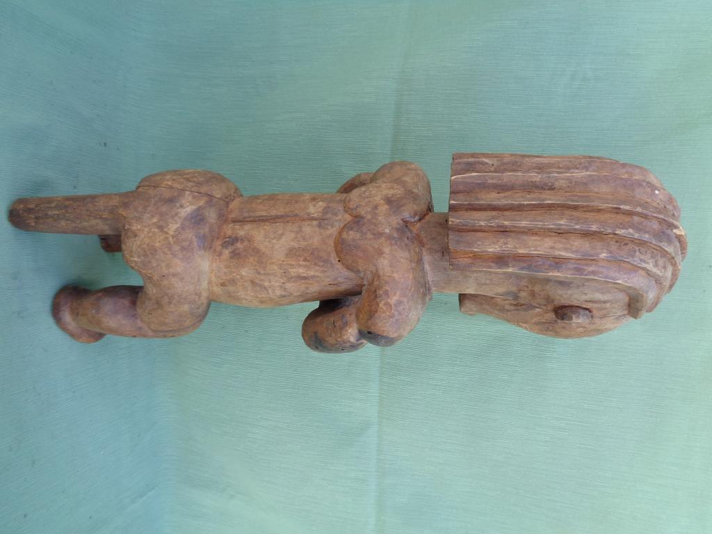 El culto a los antepasados se basa en la relación que existe entre la ofrenda del vivo al difunto y la protección del difunto al vivo. En los relicarios de los antepasados se guardan parte de los restos mortales más importantes, principalmente una parte del cráneo y trozos de otros huesos. Se trata normalmente de los restos de los antepasados más cercanos. Se les rinde veneración al mismo tiempo que se les teme porque pueden ser peligrosos para los vivos, razón por la que conviene colocarlos bajo la tutela de un espíritu protector, llamado guardián de relicario, que se coloca sobre la caja que contiene las reliquias. Las estatuas mwaï se caracterizan por su aspecto de robustez principalmente en tórax y brazos. Normalmente sentadas y reconocibles por un peinado en varias partes y mandíbula protuberante. Pátina marrón.