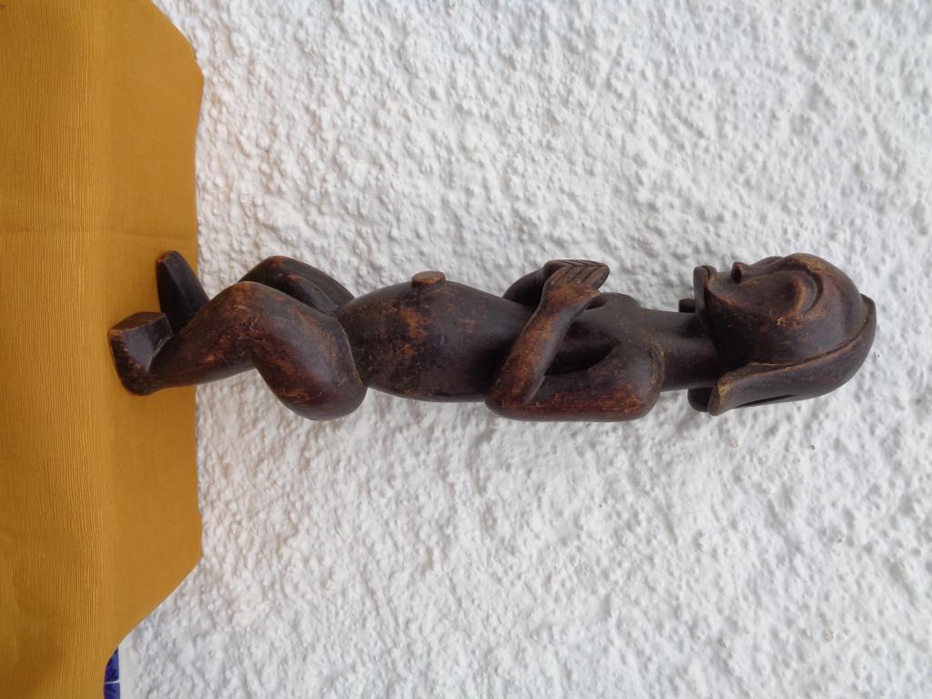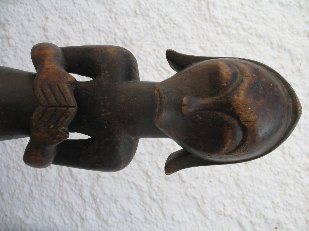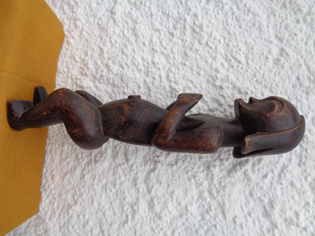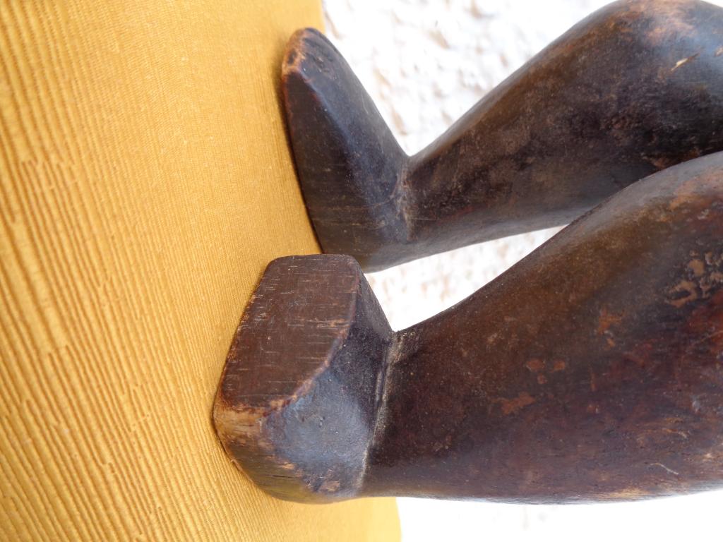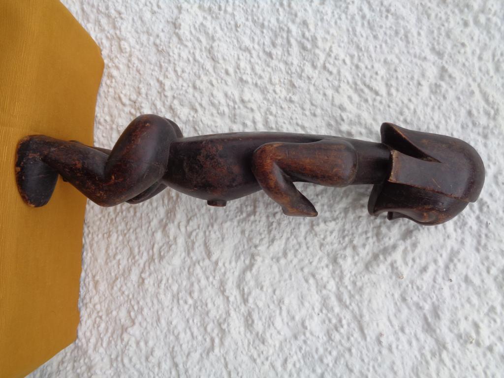 Guardián de relicario con las manos juntas en actitud de recogimiento. Le falta una parte del pie izquierdo. Pero le falta desde que el artesano hizo la pieza, pues es la pátina original, cosa muy cueriosa, ya que es frecuente cortar trozos de pie en algunas etnias para hacer pequeñas reliquias, pero normalmente de piezas ya consagradas. Si se hubiera cortado ese trozo después de consagrada no tendría la misma pátina.