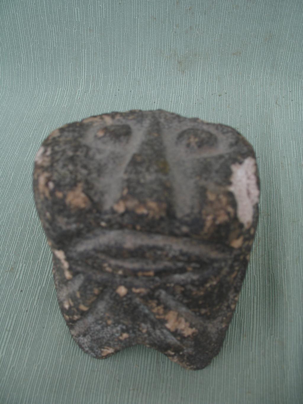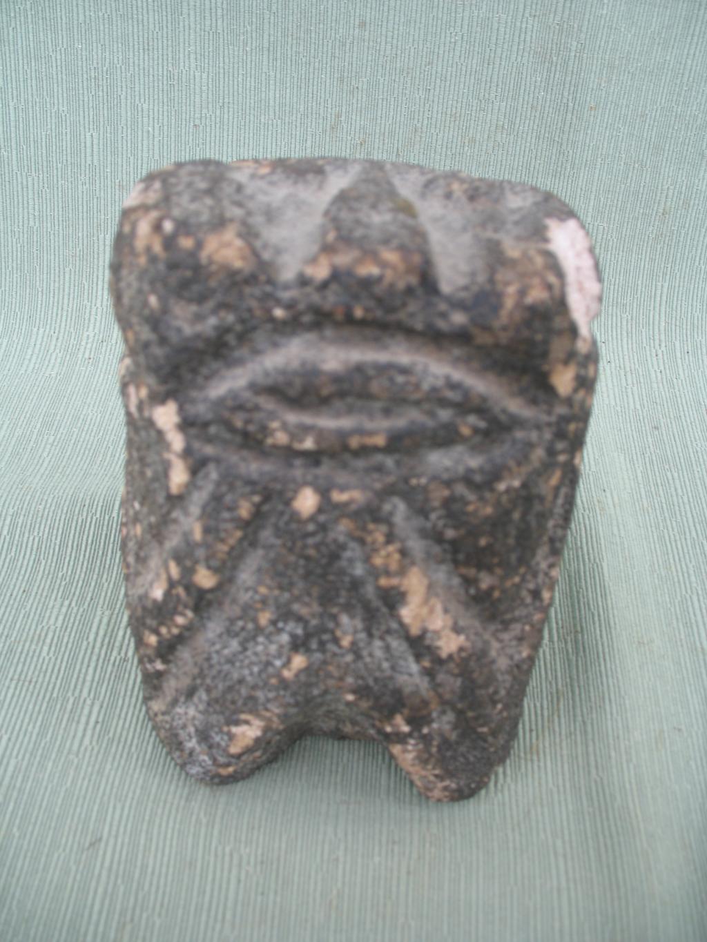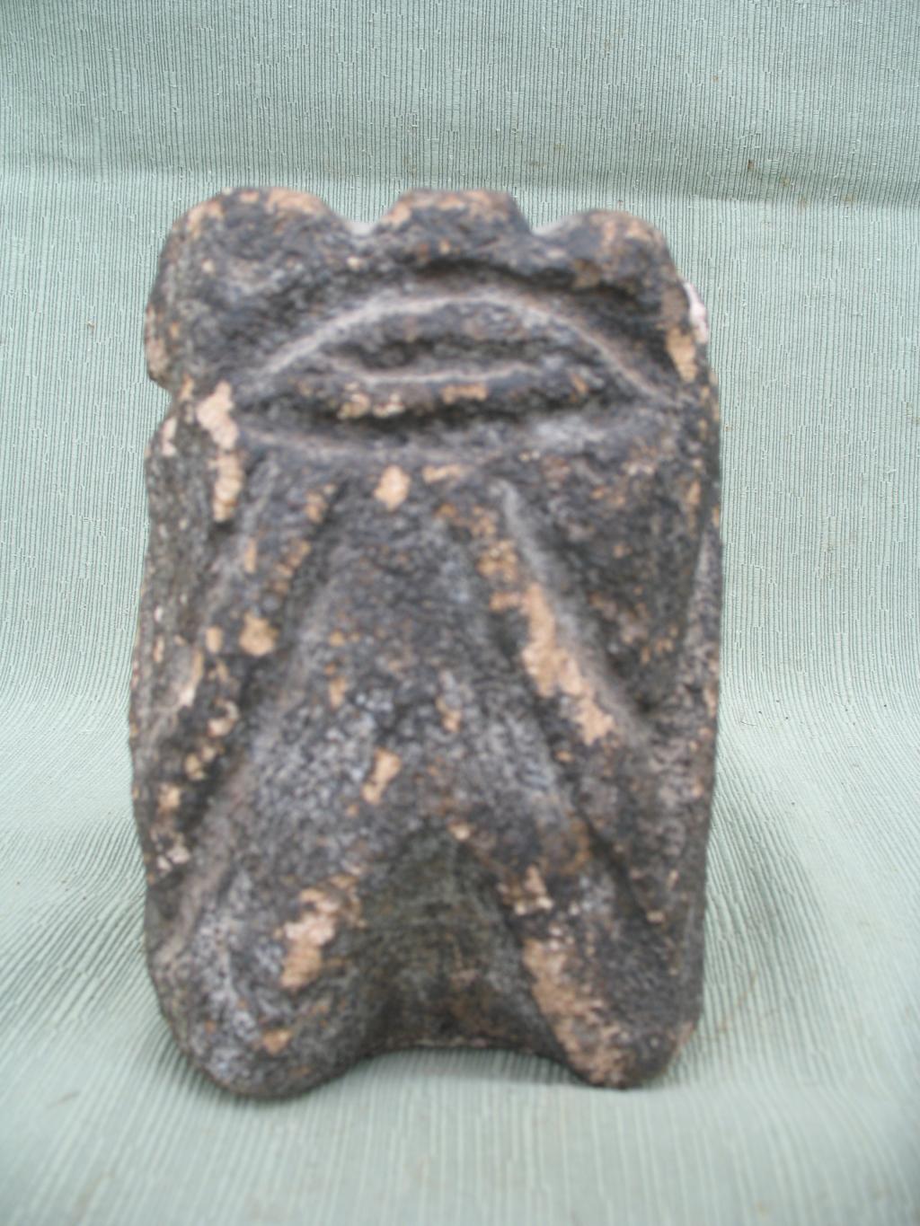Pequeña y raraq piedra que representa a un personaje con las manos juntas en el pecho, debajo de la gran cabeza, en actitud imploratoria. Pertenece sin duda a la sociedad iniciática Vabong. Estas piedras, al igual que la piedra negra junto a la cual esconden las máscaras bovinas, marcan el lugar del sacrificio. Y como nos dice Maesen junto a ellas ce celebran los sacrificios durante los ritos propiciatorios destinados a la caza o a la recolección. Sirven también de sede para administrar la justicia y tienen virtudes apotropaicas, estas piedras están cargadas del poder de curar.