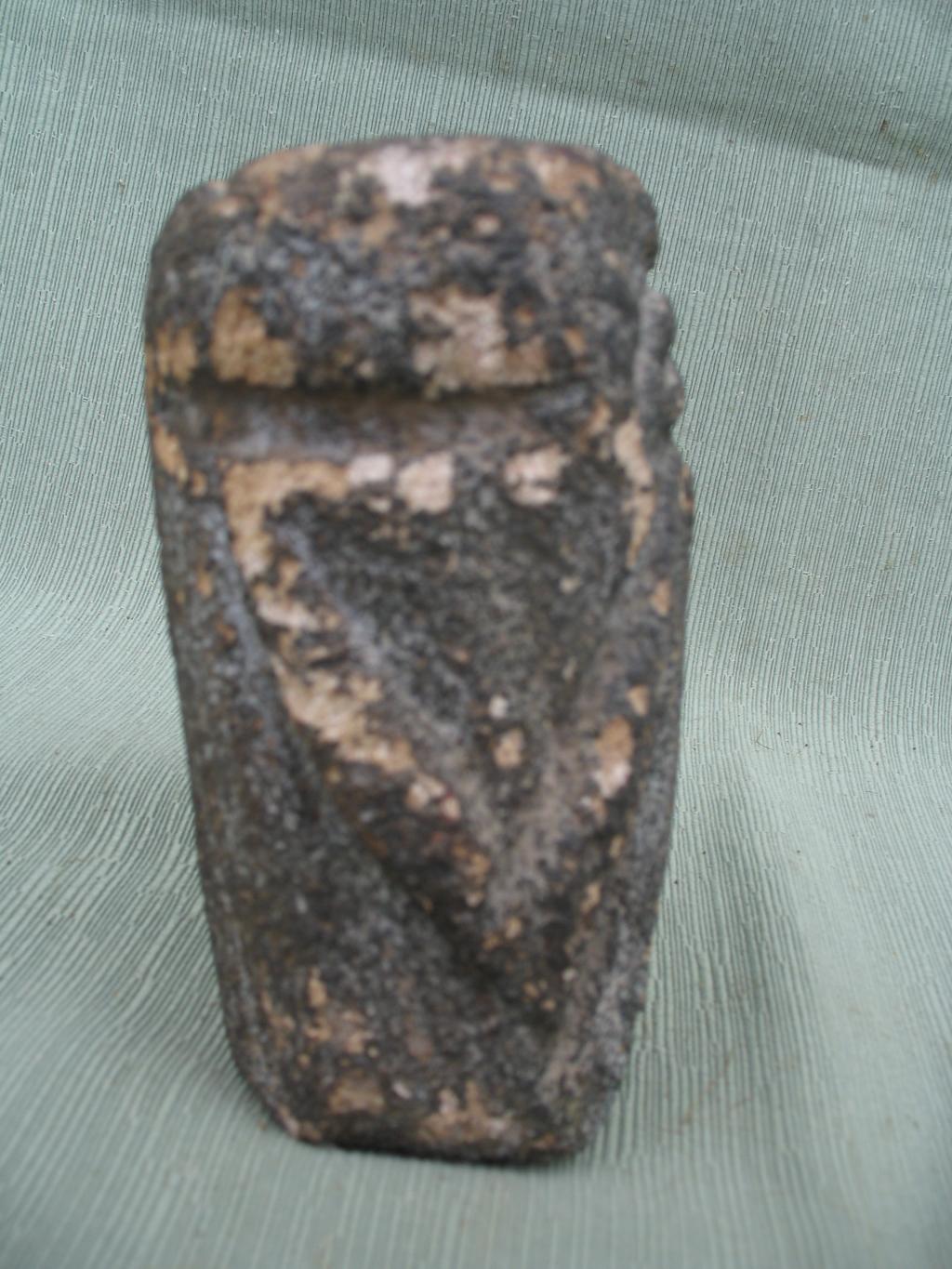 Esta piedra, de pátina oscura, presenta varios desconchados posiblemente causados por la herramienta, azada, arado o piqueta, de la persona que la encontró, algo frecuente en las figuras que aparecen en los campos,