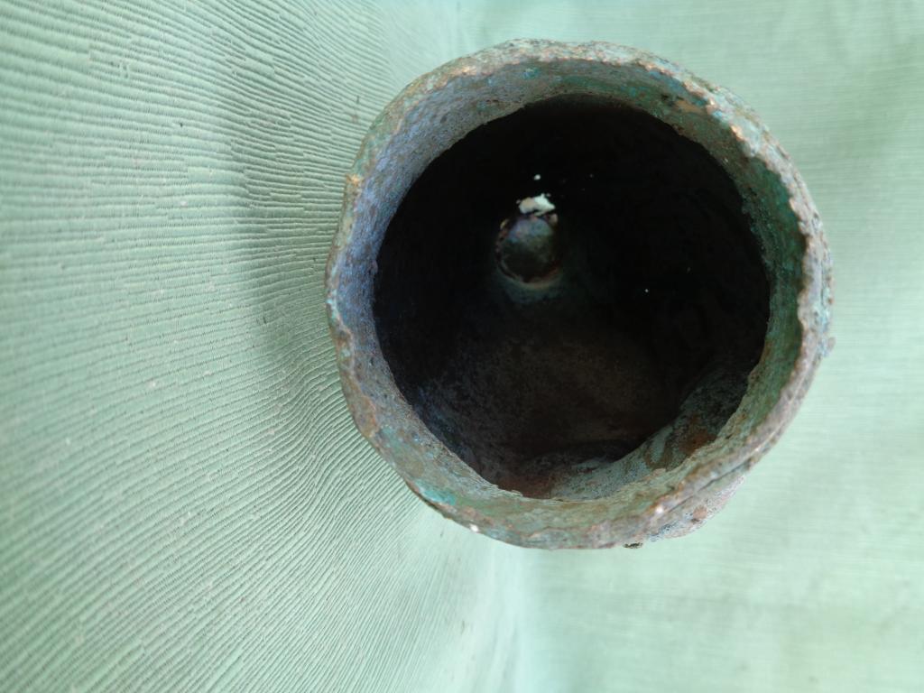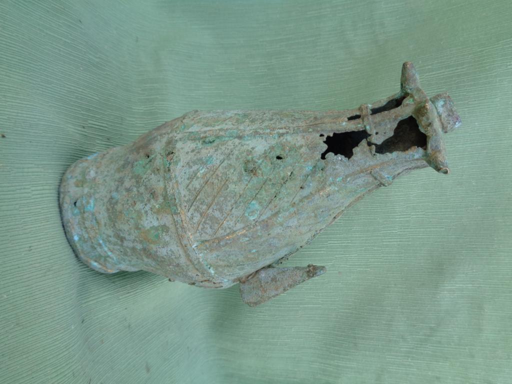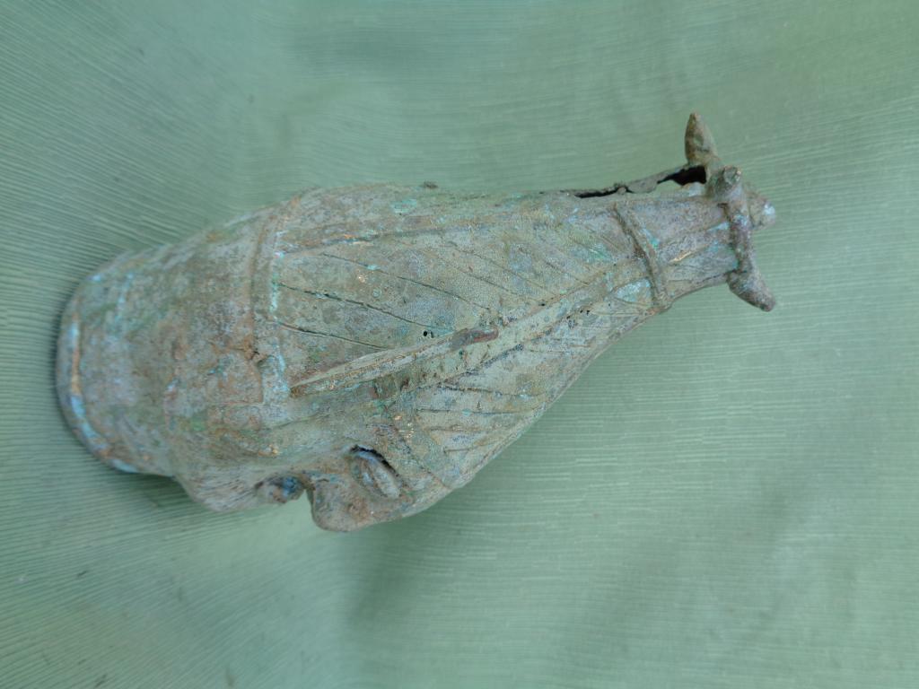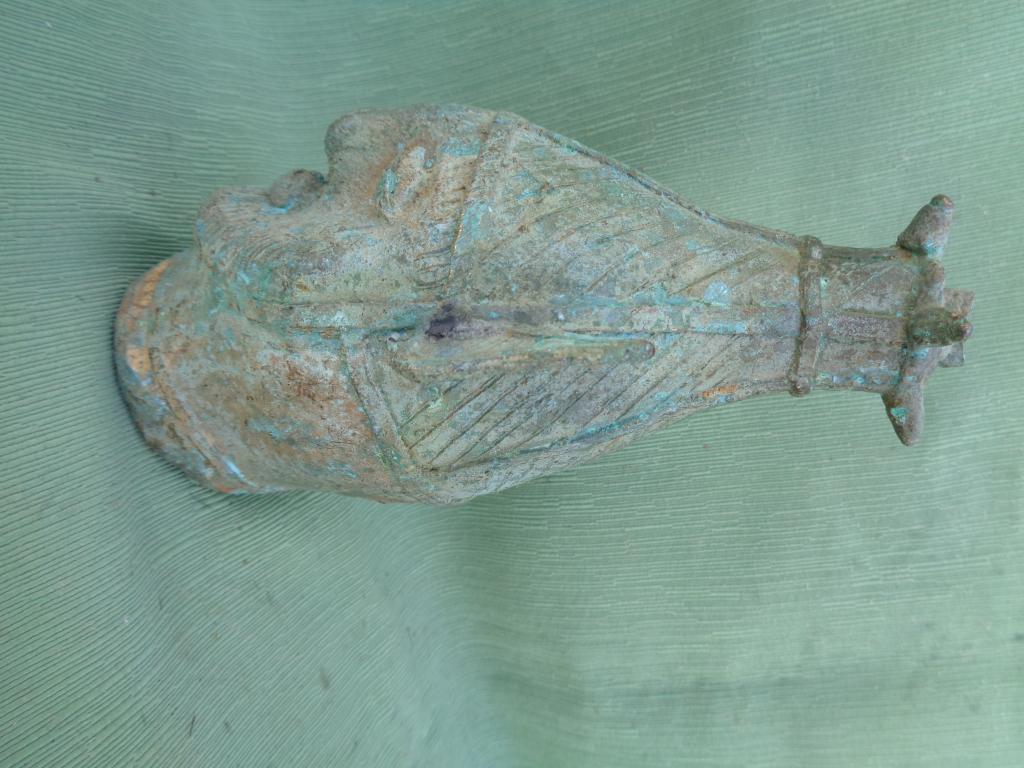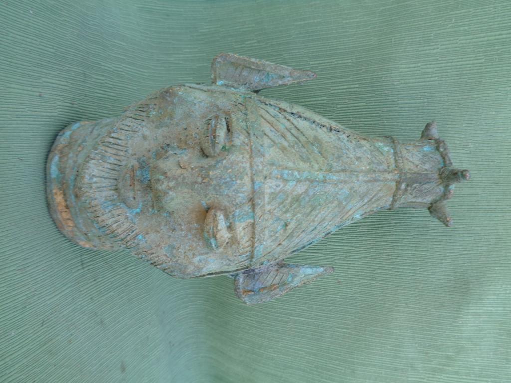 Antigua cabeza que se sale de la norma habitual de los Bibi-Edo yorubas, representa a un geenio de la naturaleza. La pieza es antigua pero sólo test de termoluminescencia puede dar una datación exacta. Pátina verdosa.