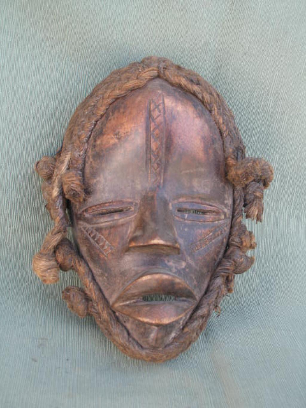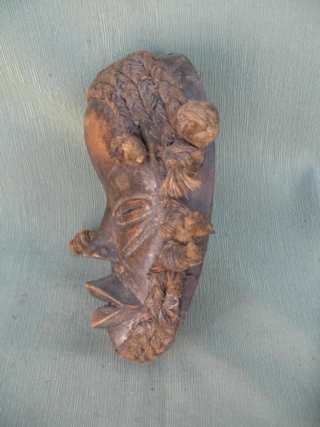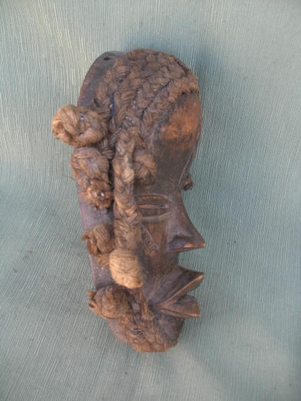 Máscara de trazos finos con ojos rasgados enmarcados en un relieve y boca semiabierta con labios gruesos. A veces lleva pequeñas láminas de metal que simulan los dientes. Su peinado es delicado, rematado en dos trenzas laterales, una de las cuales ha sido cortada. La máscara va rodeada de una doble trenza en las mejillas y cuádruple en la cabezaz. Aunque estas máscaras representan un delicado rostro de mujer, son siempre portadas por hombres. Las máscaras femeninas representan a la madre primordial y fecunda, protectoras de las mujeres encinta y de los recién nacidos. Sólo puede ser portada por los miembros de la sociedad secreta Go para anunciar el fallecimiento de un jefe o de un notable o de una mujer notable. Pátina de uso.