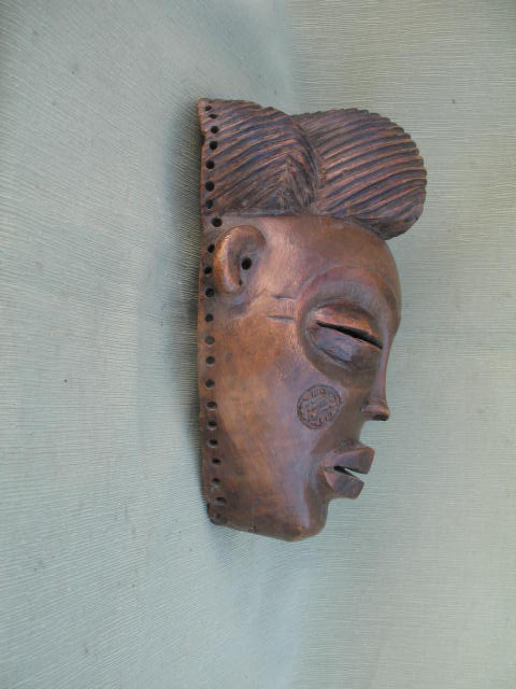 Estas máscaras mwana-pwo representan la belleza de la mujer joven que evoca, al mismo tiempo, a la madre ancestral, Pwo, la primer antepasada, que protege la fertilidad de sus descendientes y de los campos. Además de la encarnación del antepasado simboliza los ideales de la mujer de este grupo étnico. El portador de esta máscara, viste durante el baile una especie de red con senos postizos y un lienzo alrededor de la cintura. Al igual que la máscara cihongo es una máscara de danza. La influencia benéfica que estas máscaras ejercen en quienes asisten a sus danzas justifica la retribución con la que se agradece la prestación de los danzantes. esta máscra lleva un tocado poco habitual para si etnia. carece de la cruz en la frente pero lleva las escarificaciones en las mejillas que representan las lágrimas. Su rostro expresa la delicadeza. Pátina marrón. Puede ser clasificada como máscara de fecundidad o de difuntos.