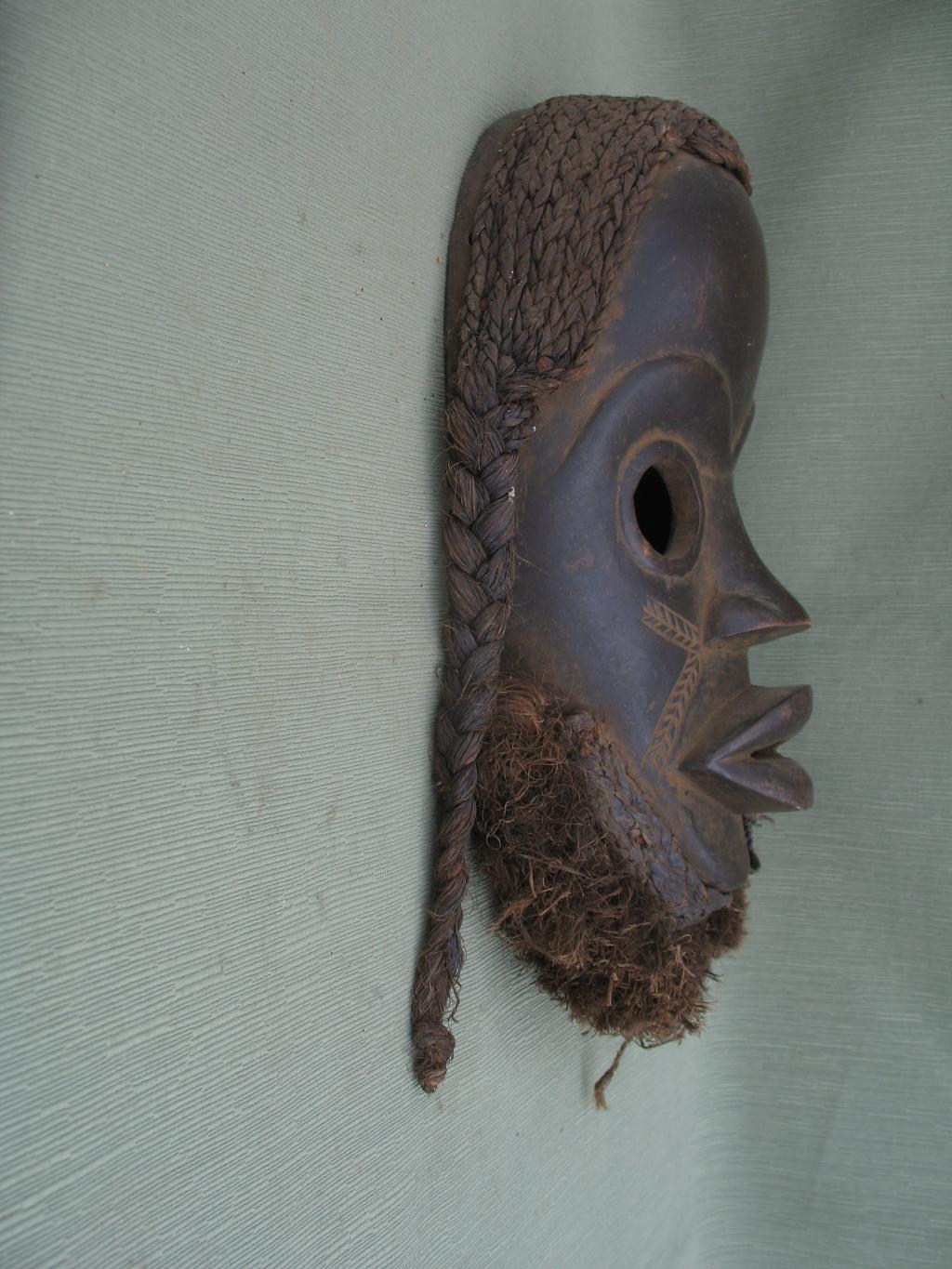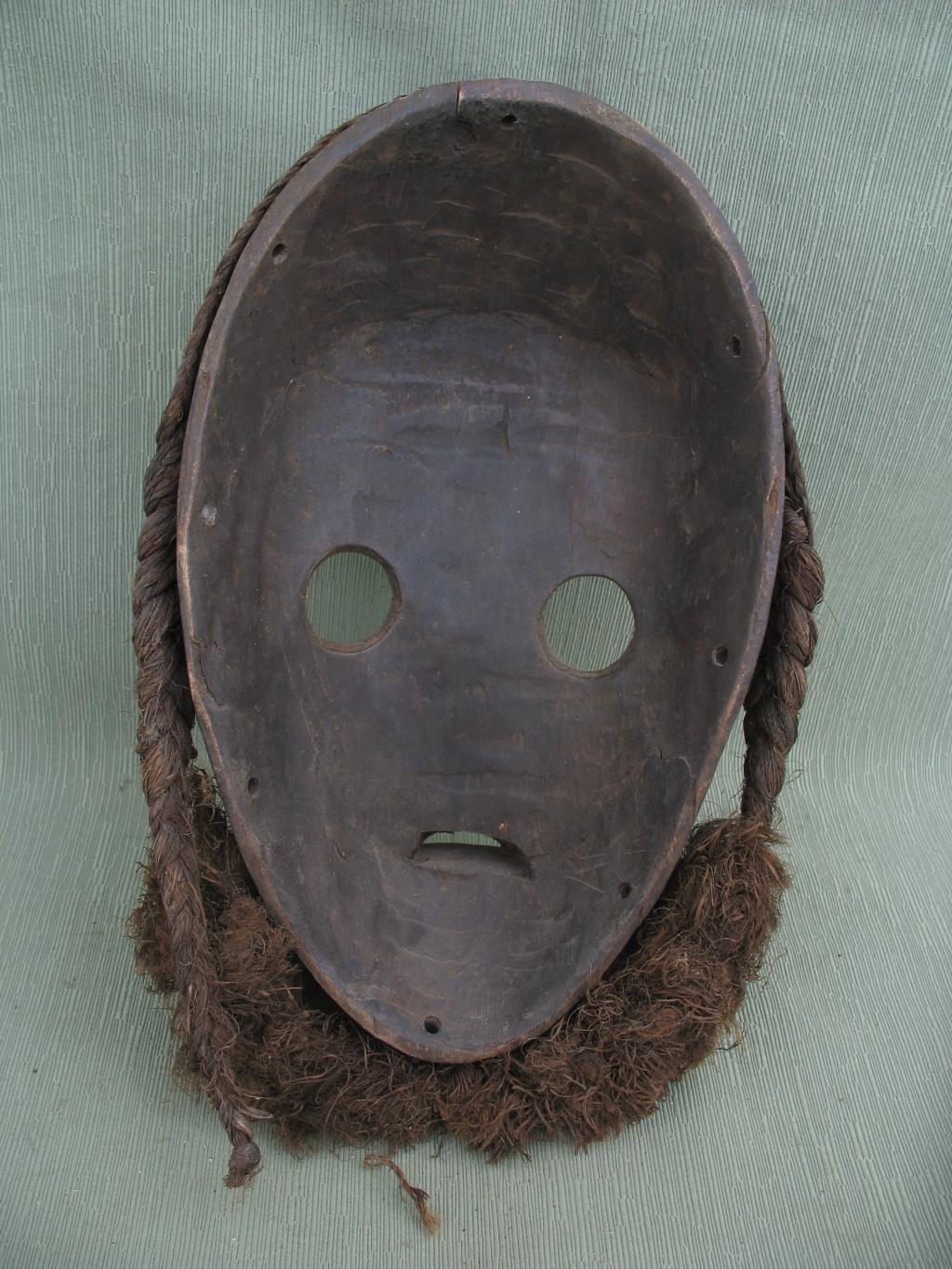 Las máscaras Go Gé presetan trazos semejantes a las máscaras de carrera "gunyeya" y a las máscaras "zakpei" o de incendios. Trazos finos, ojos almendrados, boca semiabierta formada por dos triángulos superpuestos por lado mayor formando un rombo y puede llevar pequeñas láminas de metal que simulan los dientes, lo que no ocurre en este caso. Los ojos van rematados por un realce circular. Dada la finura de sus rasgos se trata, sin duda, de una máscara del norte del país dan. escarificac iones en el rostro. Lleva un delicado peinado rematado en dos trenzas laterales y una baarba que nos idica que se trata de un notable. Sólo puede ser portada por los miembros de la sociedad secreta Go para anunciar el fallecimiento de un jefe o de un notable. Pátina negra.
