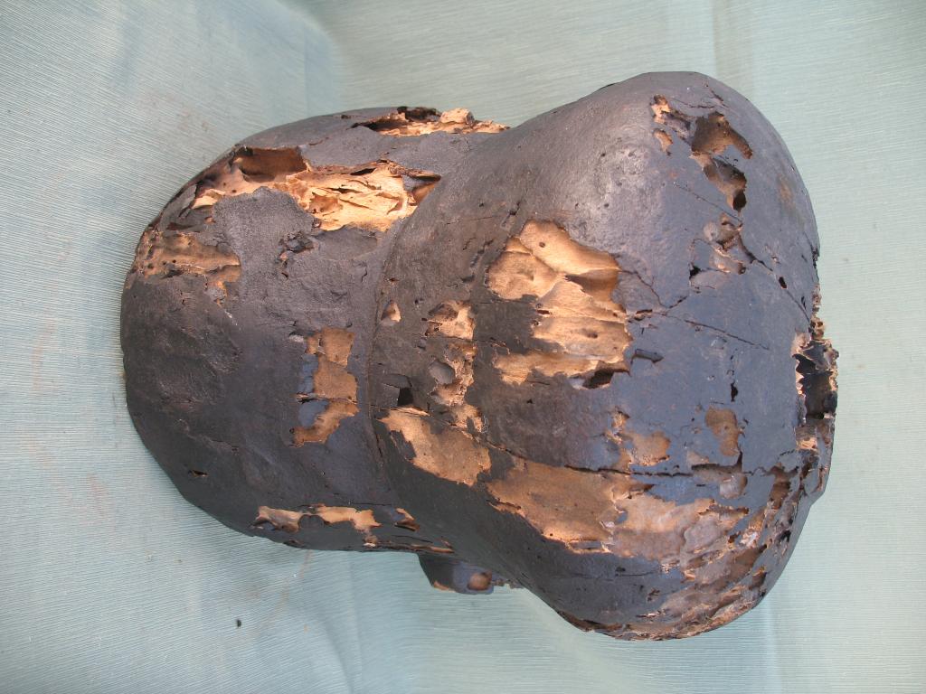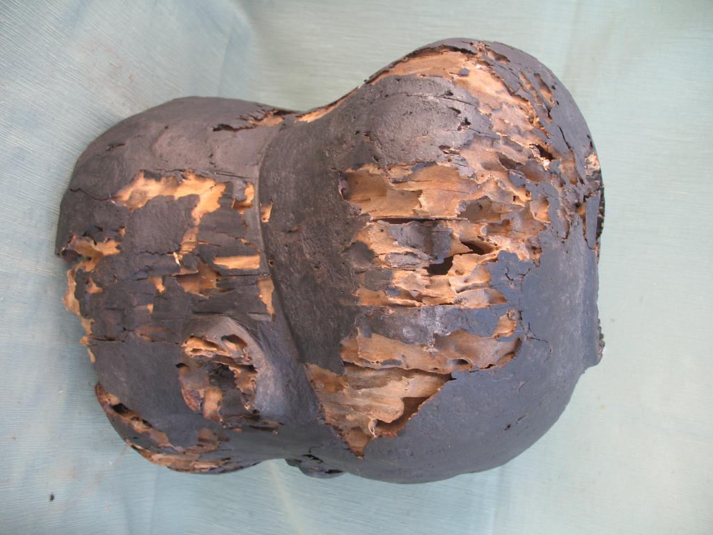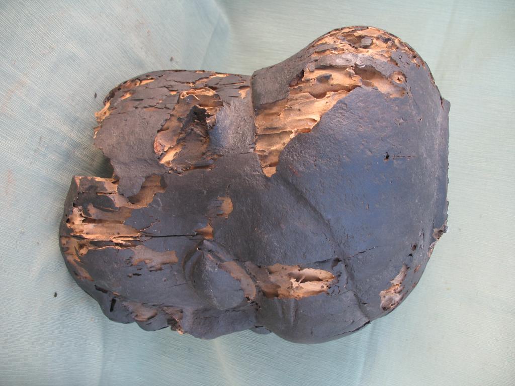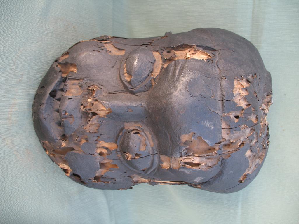 Máscara de aspecto realista, algo raro en las máscaras bamún. Por las facciones se trata de una máscara femenina, Ngoin. Muy deteriorada por las termitas y el paso del tiempo. Se trata de máscaras conmemorartivas utilizadas en recuerdo de la memoria de algún difunto notable.