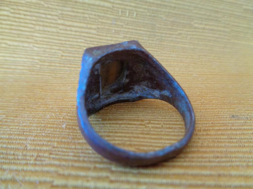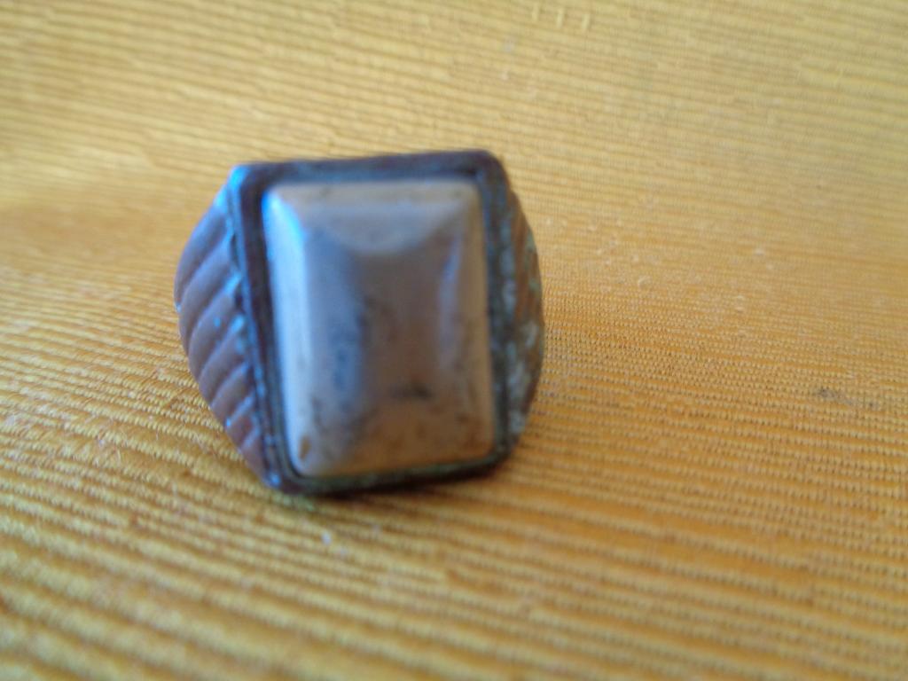 Anillo de meal cobrizo con los laterales anchos y estriados y una piedra, de buen tamaño, engarzada, de las llamadas ojo de tigre. Pátina antigua.