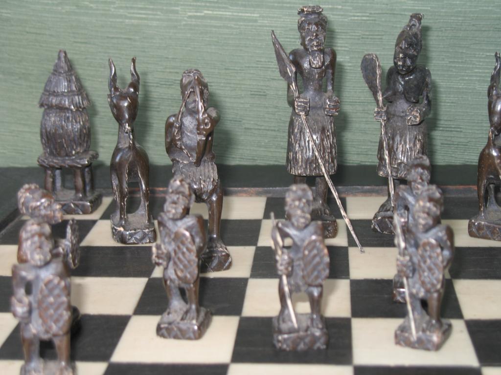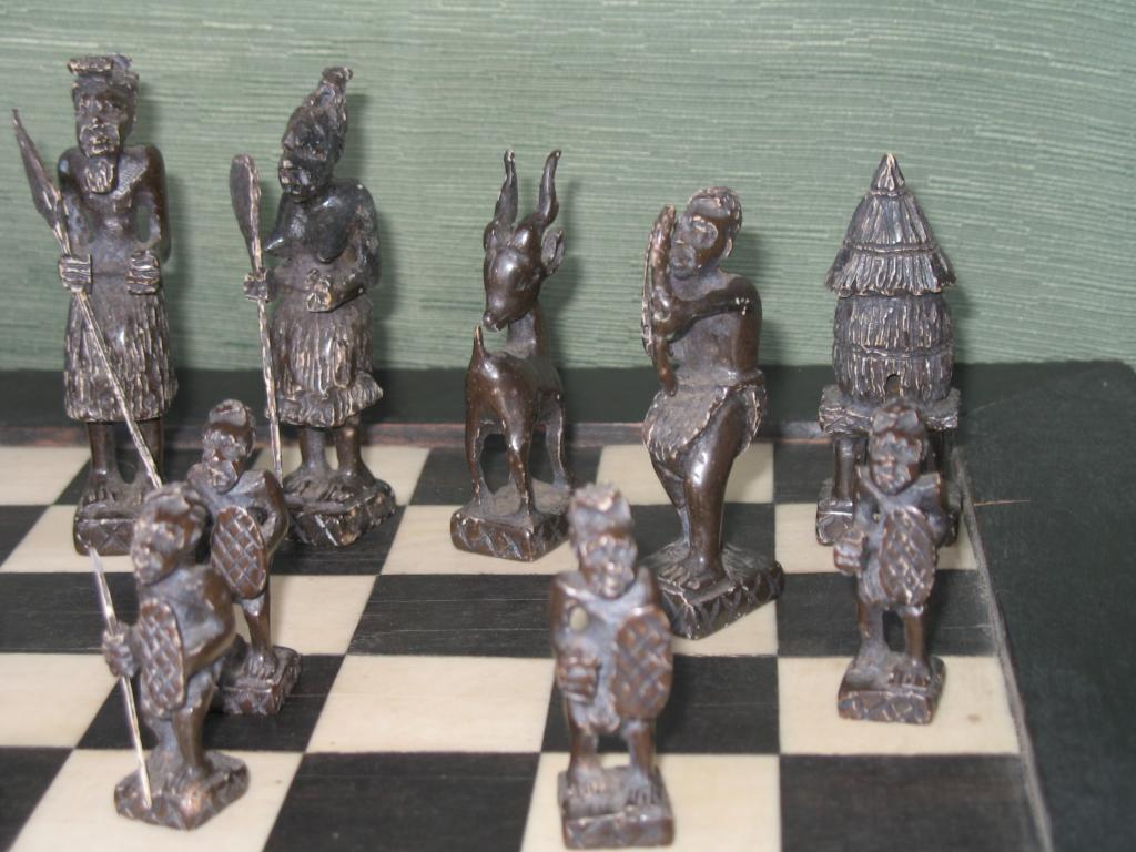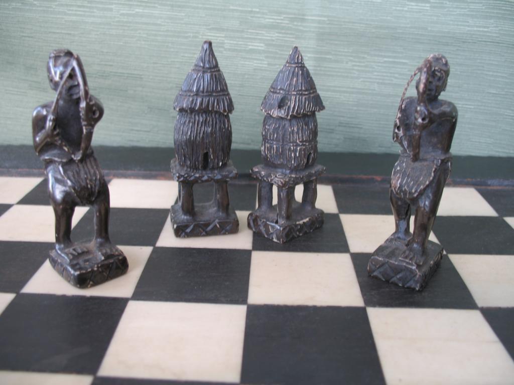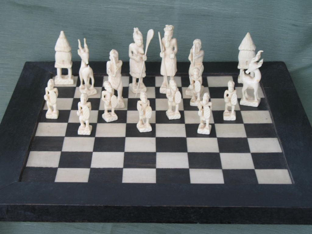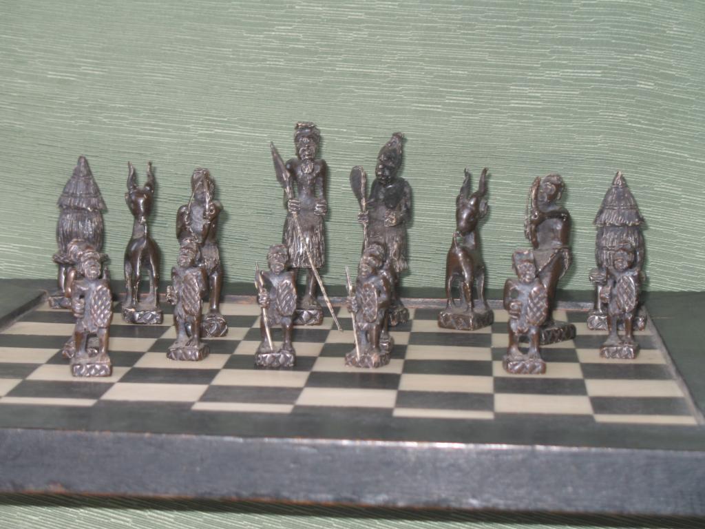 Delicado juego de ajedrez elaborado por novicias de un convento de monjas del Congo en la primera década del siglo XX. Este ajedrez perteneció a un ministro del primer gobierno de Camerún. Las figuras está minuciosamente talladas, el rey y la reia constituyen ya un verdadera obra de arte. Las torres están representadas por graneros, los caballos por esbeltas gacelas, los alfiles por arqueros y los peones por guerreros con sus lanzas y escudos. Las fichas negras son de marfil tintado de negro. El tablero es ébano y marfil. Obra única.