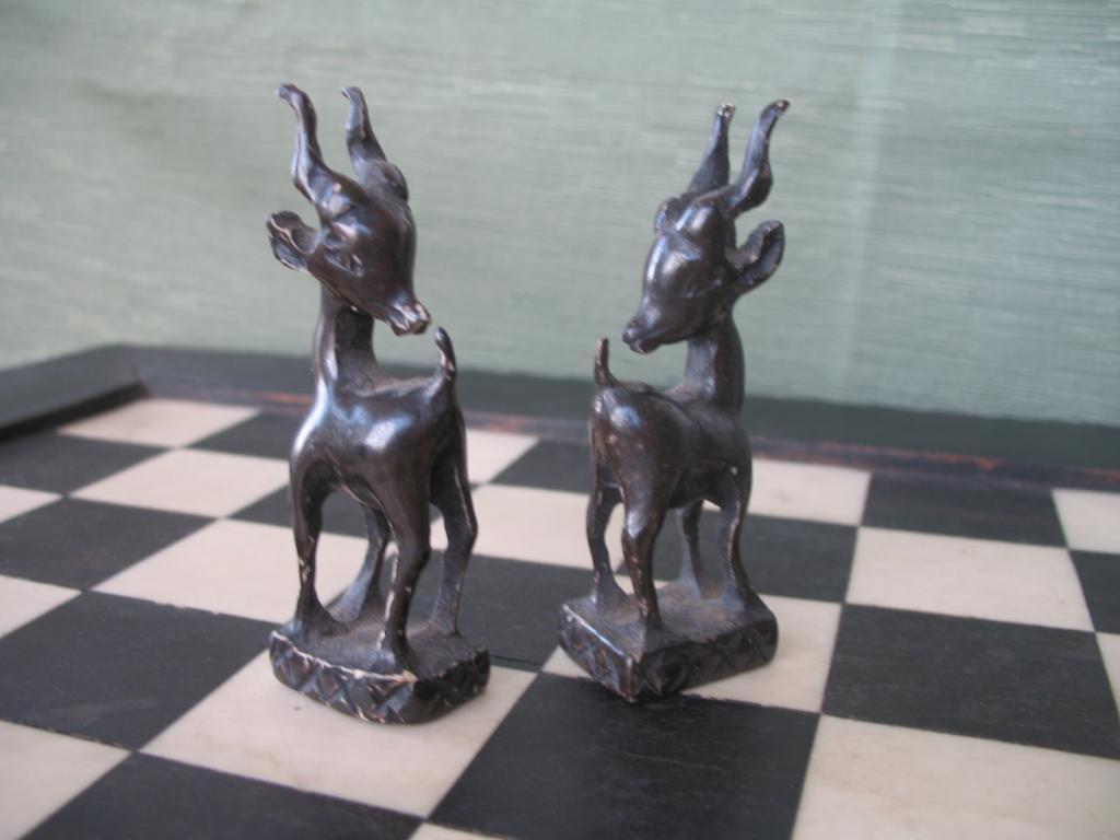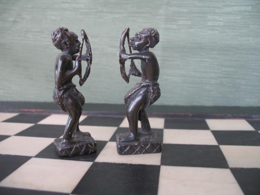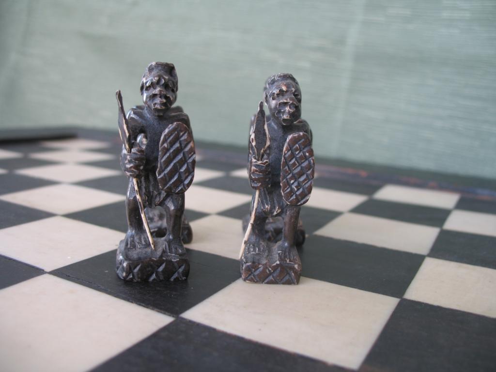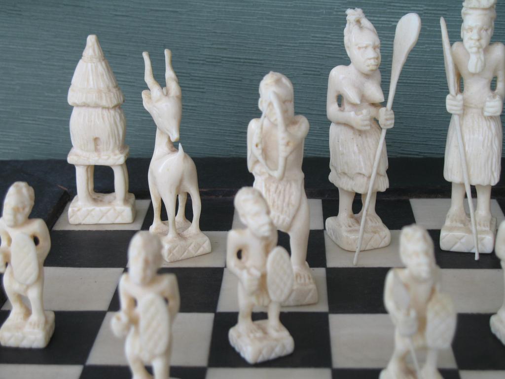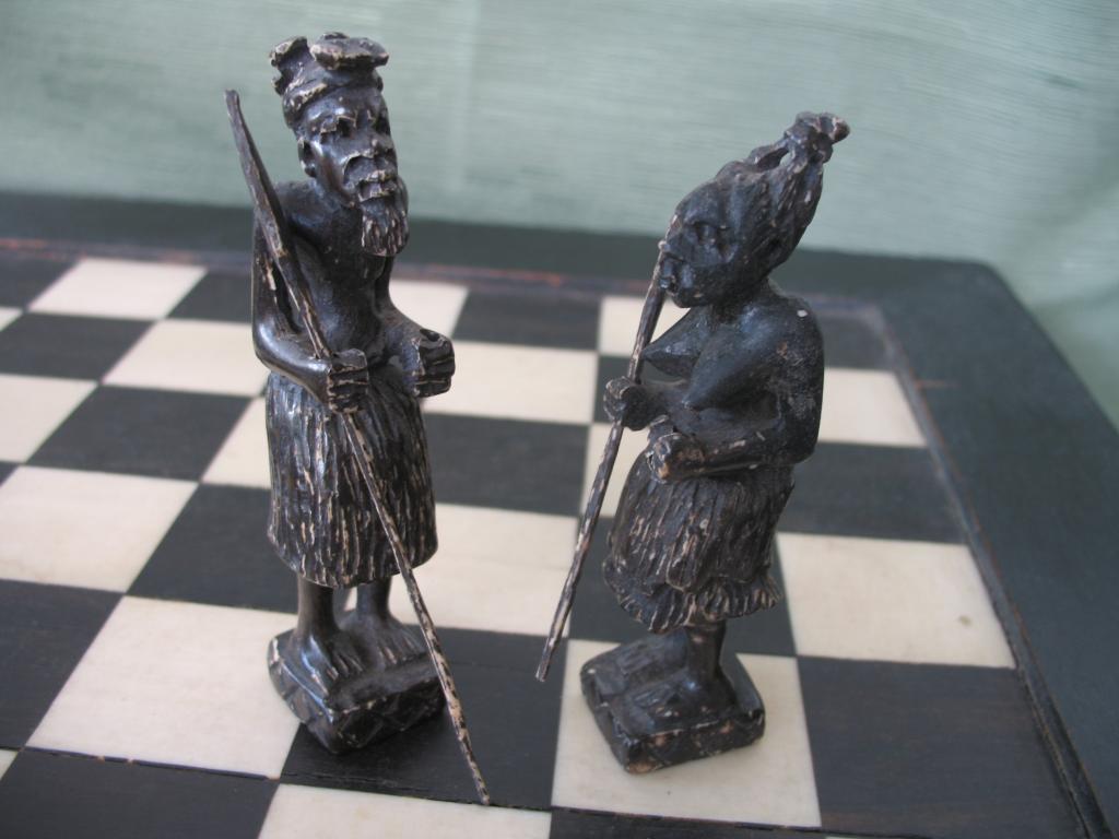 Delicado juego de ajedrez elaborado por novicias de un convento de monjas del Congo en la primera década del siglo XX. Este ajedrez perteneció a un ministro del primer gobierno de Camerún. Las figuras está minuciosamente talladas, el rey y la reia constituyen ya un verdadera obra de arte. Las torres están representadas por graneros, los caballos por esbeltas gacelas, los alfiles por arqueros y los peones por guerreros con sus lanzas y escudos. Las fichas negras son de marfil tintado de negro. El tablero es ébano y marfil. Obra única.