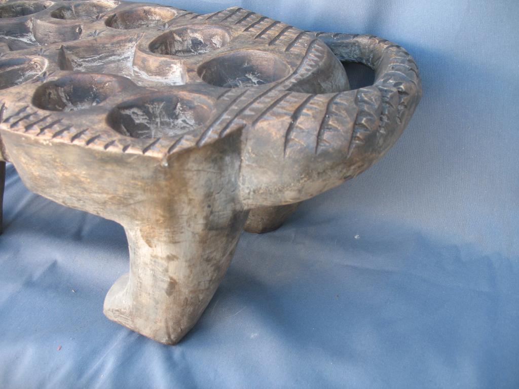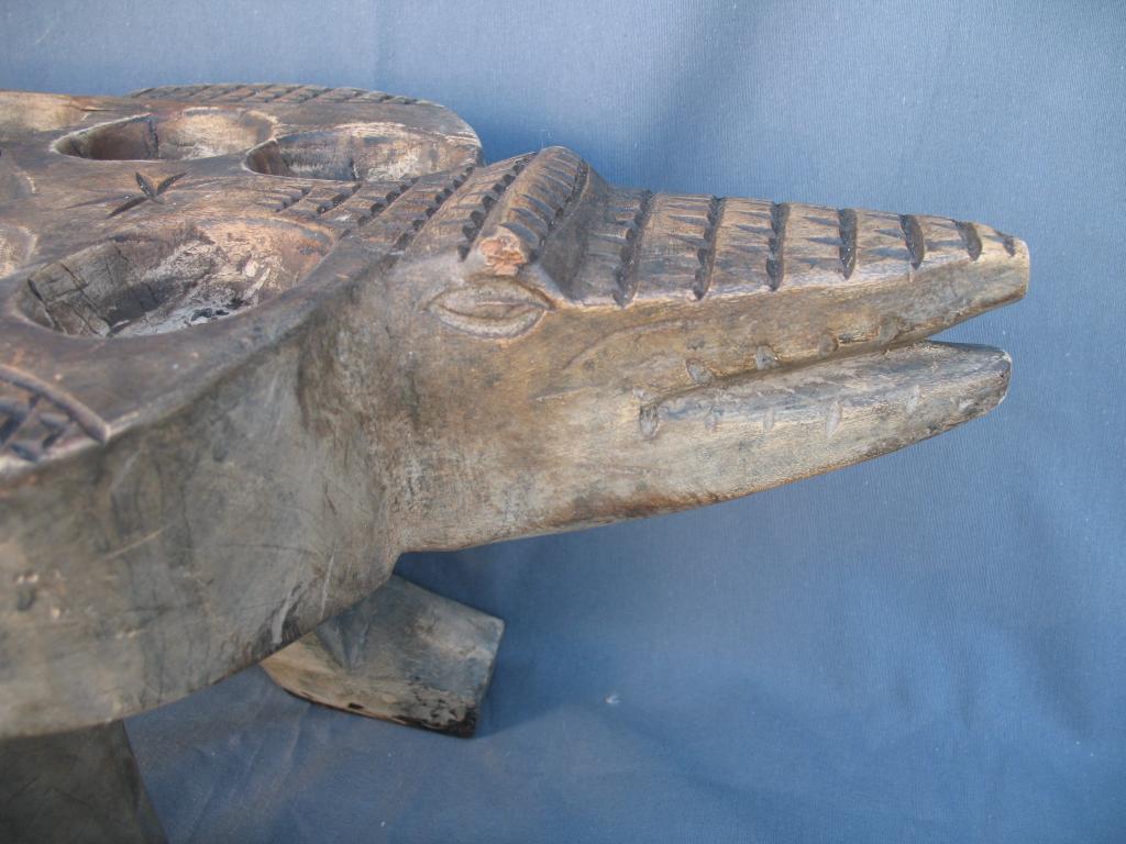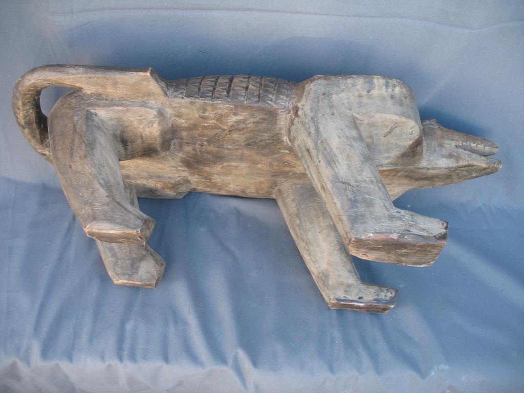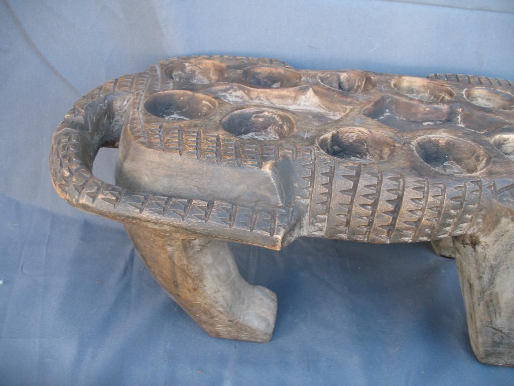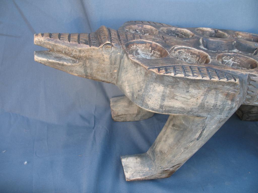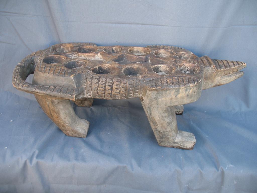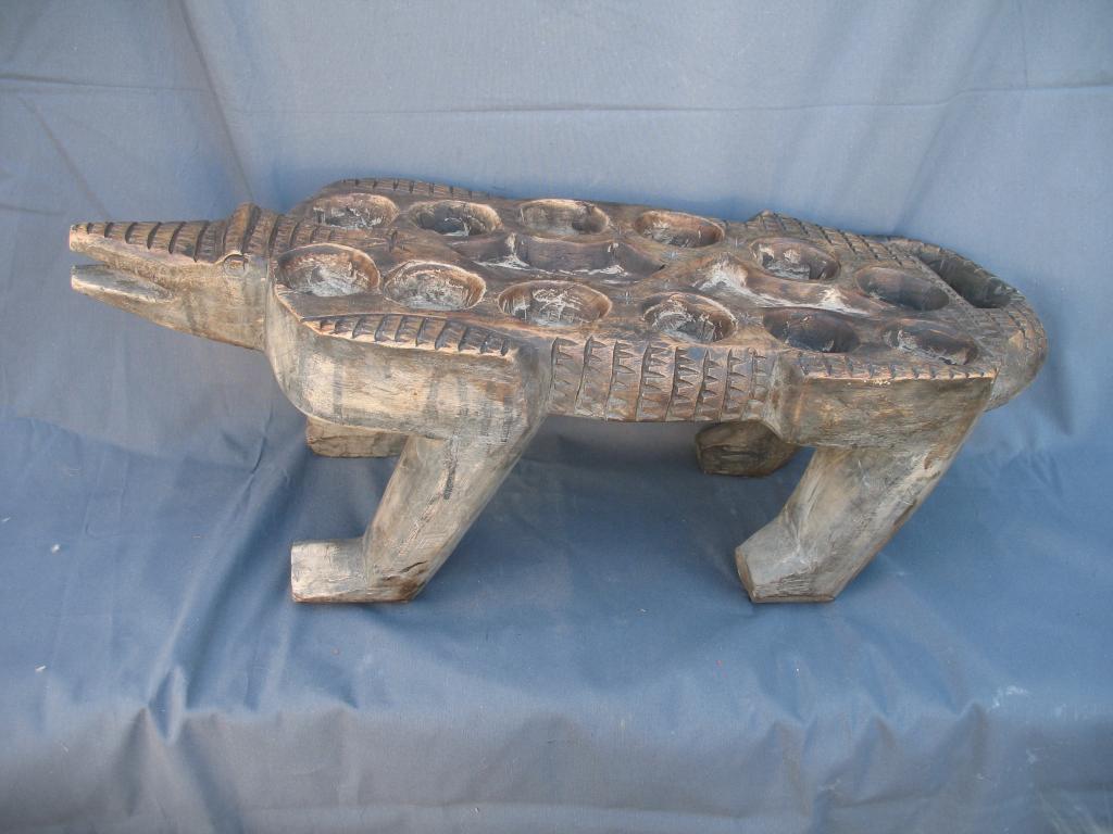 Gran juego del awalé que representa un cocodrilo. El cocodrilo es el dispensador del agua a la tierra. Es el animal rey de los ríos y de las lagunas costeras con gran raigambre en Costa de Marfil. Es conocido el famoso lago de los cocodrilos del difunto presidente Félix Houphouet Boigny. Y este animal es reproducido en numerosos pesos akan de pesar el oro, frecuentemente con un pez en su boca y sus mandíbulas son imitadas en muchas máscaras zoomorfas. Es para los Baulé un espíritu del agua y un símbolo de la vida y de la fecundidad. Pátina de uso.