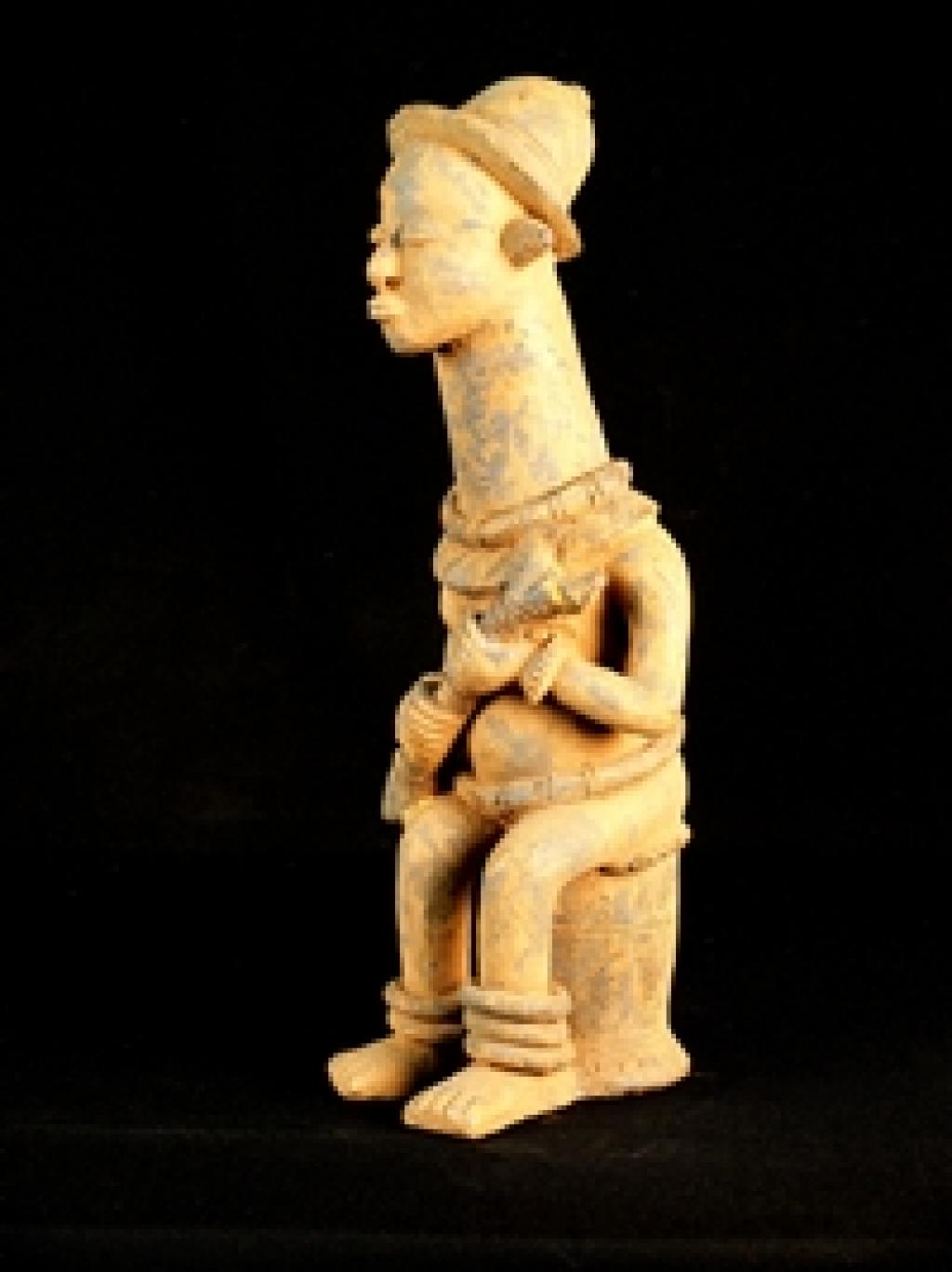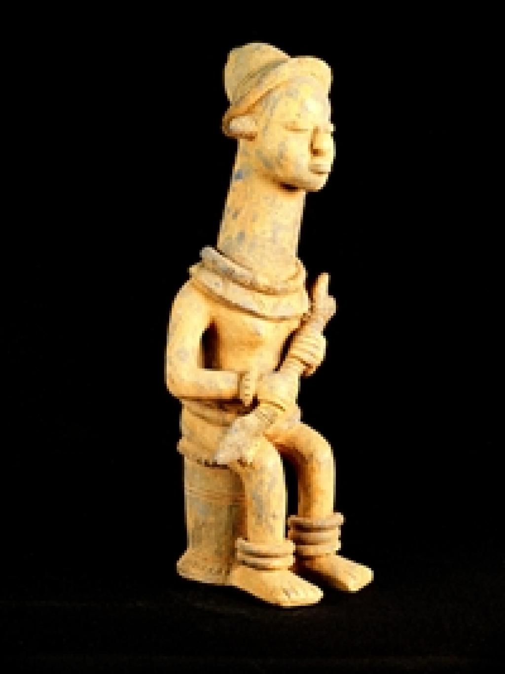 Figura de un personaje sentado en un taburete con un cetro en forma de gruesa flecha en las manos. El taburete y el cetro hacen pensar que se trata de un rey o al menos de un personaje notable. Va tocado con un gorro tipo salacot, copiado de los colonos europeos, para aumentar su prestigio. Lleva gruesos collares en el cuello, pulseras anilladas en las piernas, dos en la derecha y tres en la izquierda, y un grueso cordón a modo de cinturón. Pátina color barro claro.
