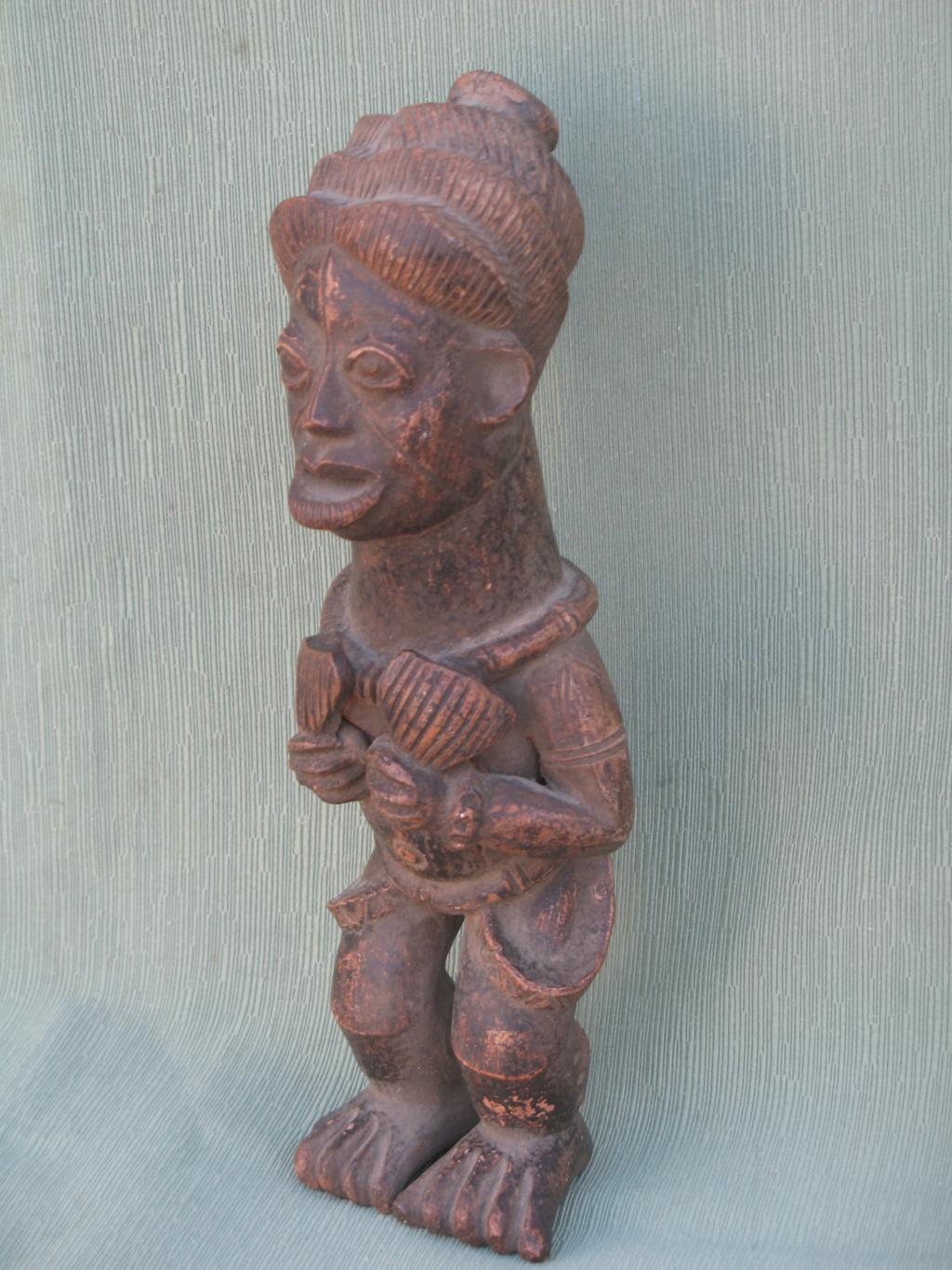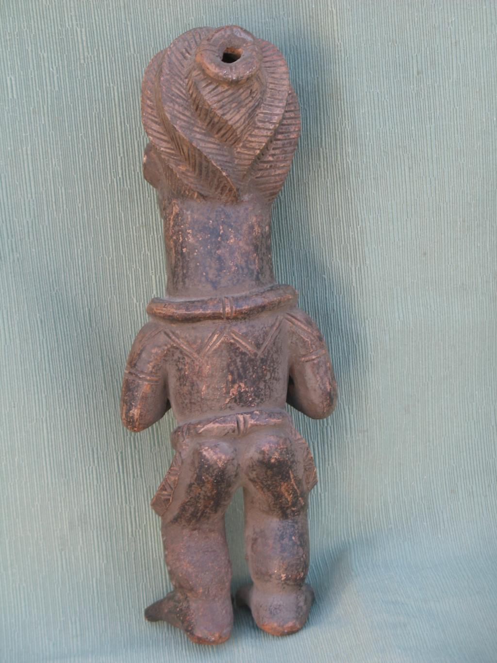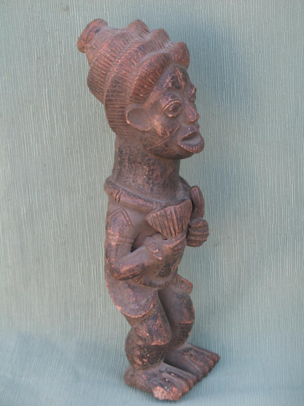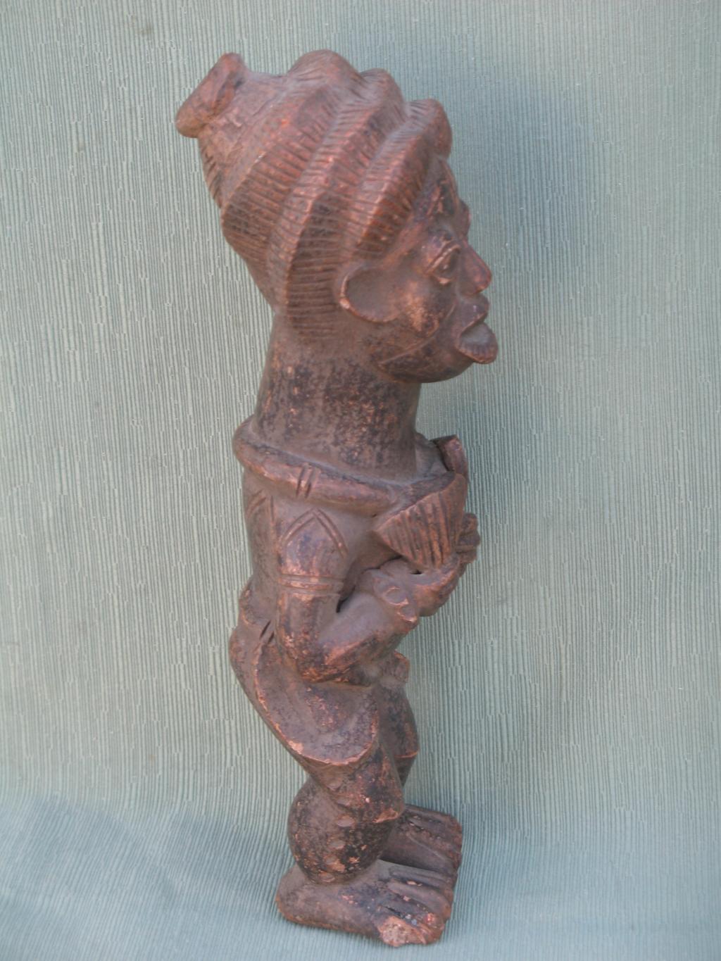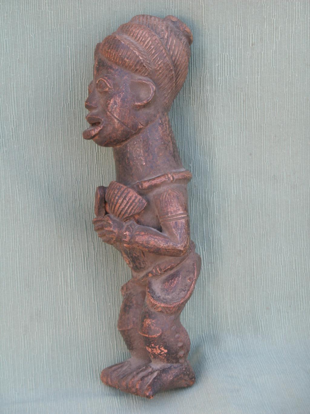 Personaje con un elaborado peinado con collar al cuello, pulseras en los brazos y vestimenta elegante que tiene en las manos dos pequeños abanicos que sujeta contra su pecho. El rostro, con la boca entreabierta, expresa admiración o sorpresa. Todo en él hace pensar que se trata de un personaje de la corte, encargado por ejemplo de abanicar al rey. Pátina del tiempo.