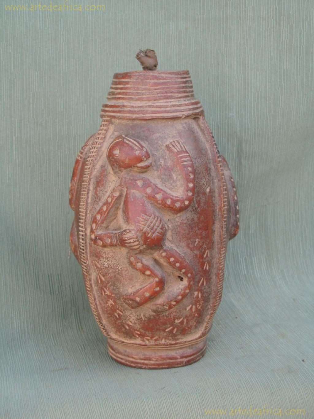 Lámpara de aceite ovalada con personajes en relieve bailando alrededor del cuerpo de la lámpara.